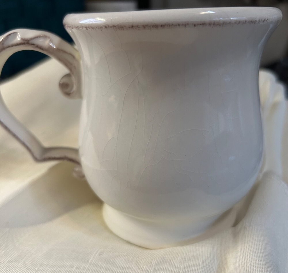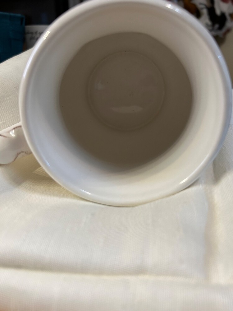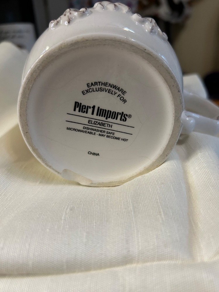 Lovely coffee mug/cup with the monogram letter "M". Style of mug by Pier 1 Imports and the style is Elizabeth. Dishwasher safe and microwaveable. 3 1/2" wide. From a pet and smoke free home. Only one small chip area as shown in photo and its on the bottom where its not noticeable.