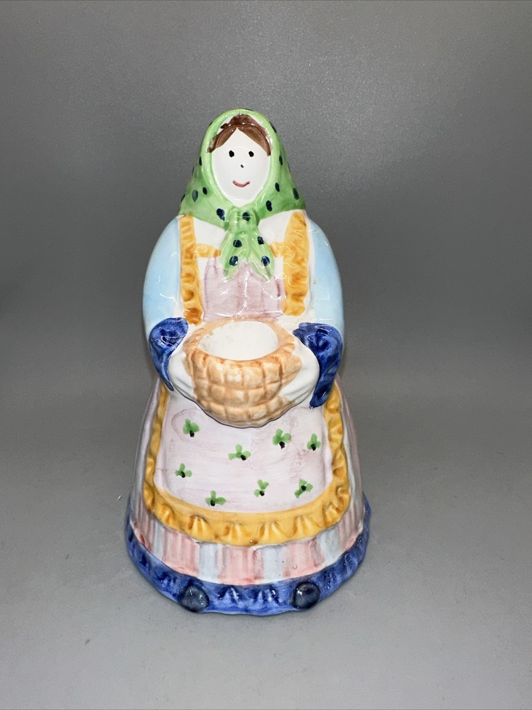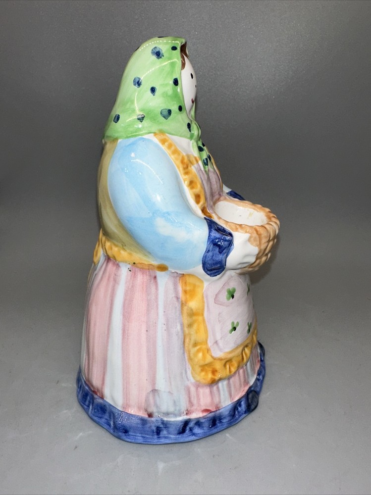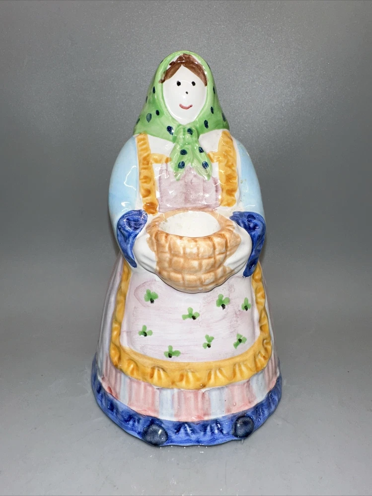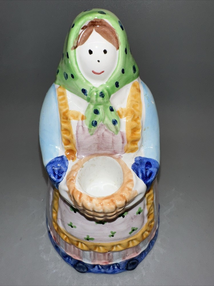 This listing is for a vintage Pier 1 Imports taper candle holder. The piece is a farmer woman holding a basket and dressed in country dress and apron with a polka dotted babushka. She stands about 7" tall and is about 4.5" wide. She is made in Italy. Great pre-displayed condition with 2 small chips on backside. See pix for details. Shipping $9.95. I strive for happy customers so please email me any questions prior to leaving neutral or negative feedback; I always work with my customers for their satisfaction. See my eBay store 'SweetJerez Sells Stuff' for more unique items as I combine shipping when possible. My pre-owned items have been cleaned and wiped with antibacterial wipes as appropriate. BID WITH CONFIDENCE! I entertain all fair offers. Thank you for looking!