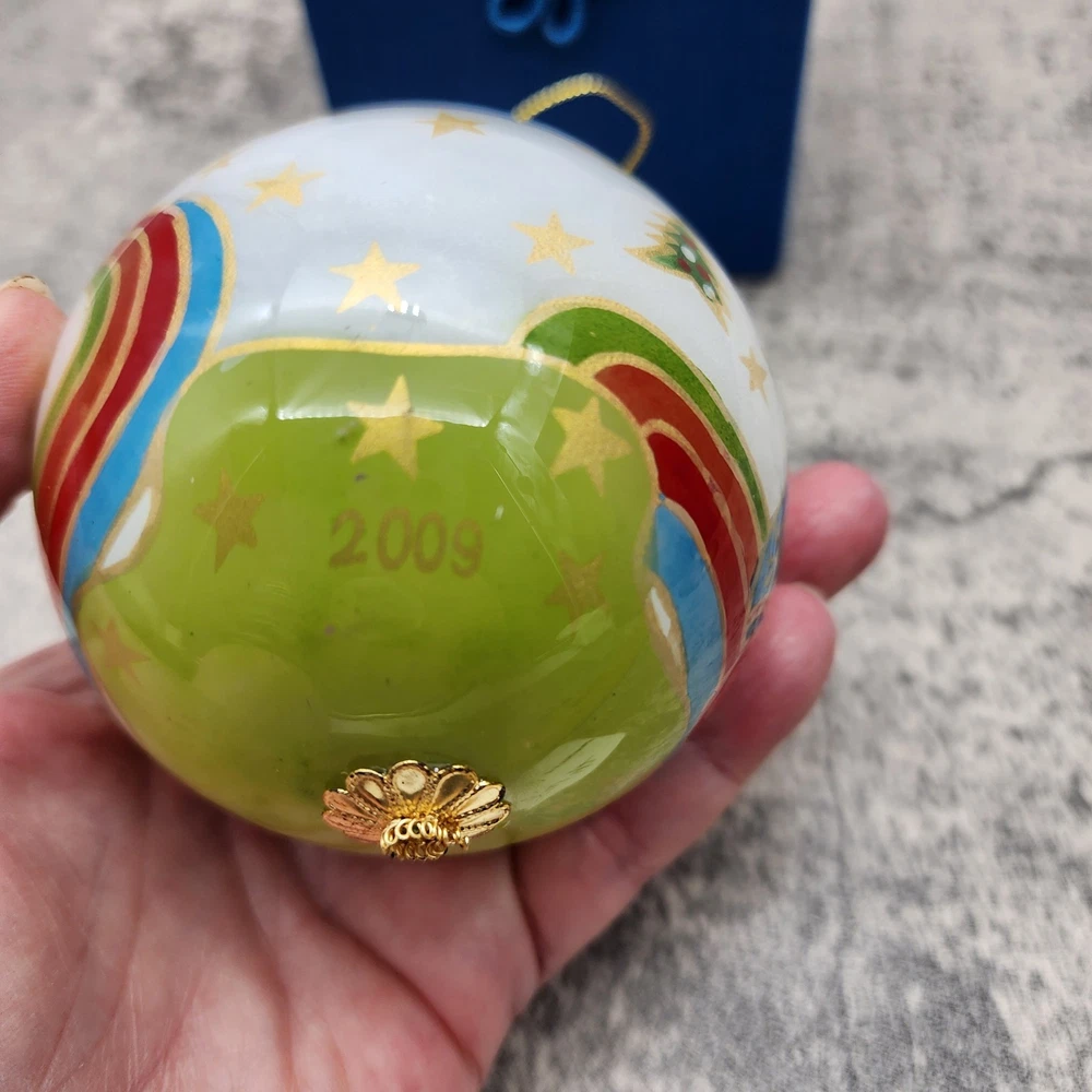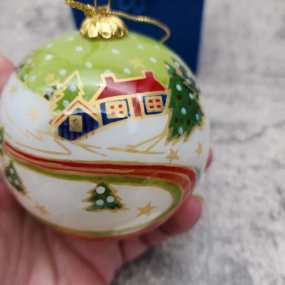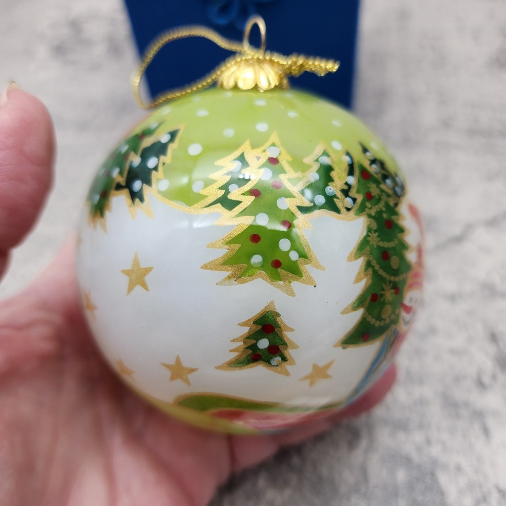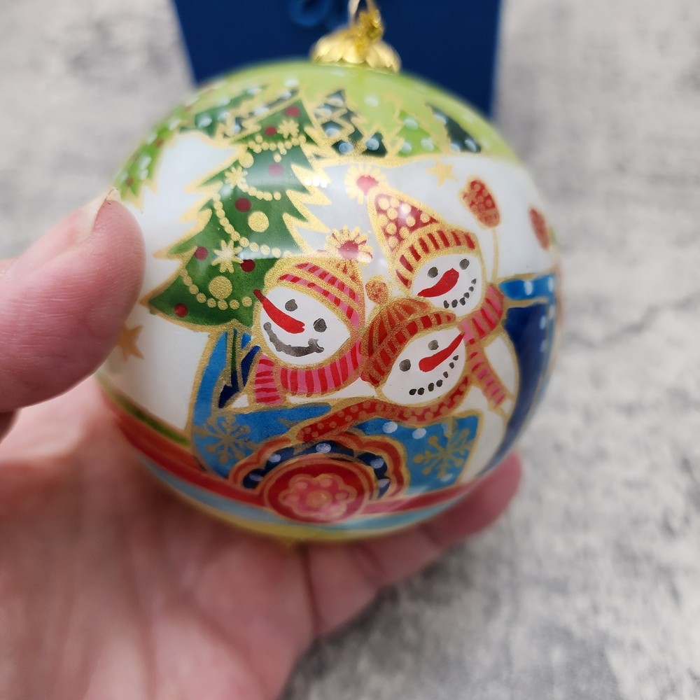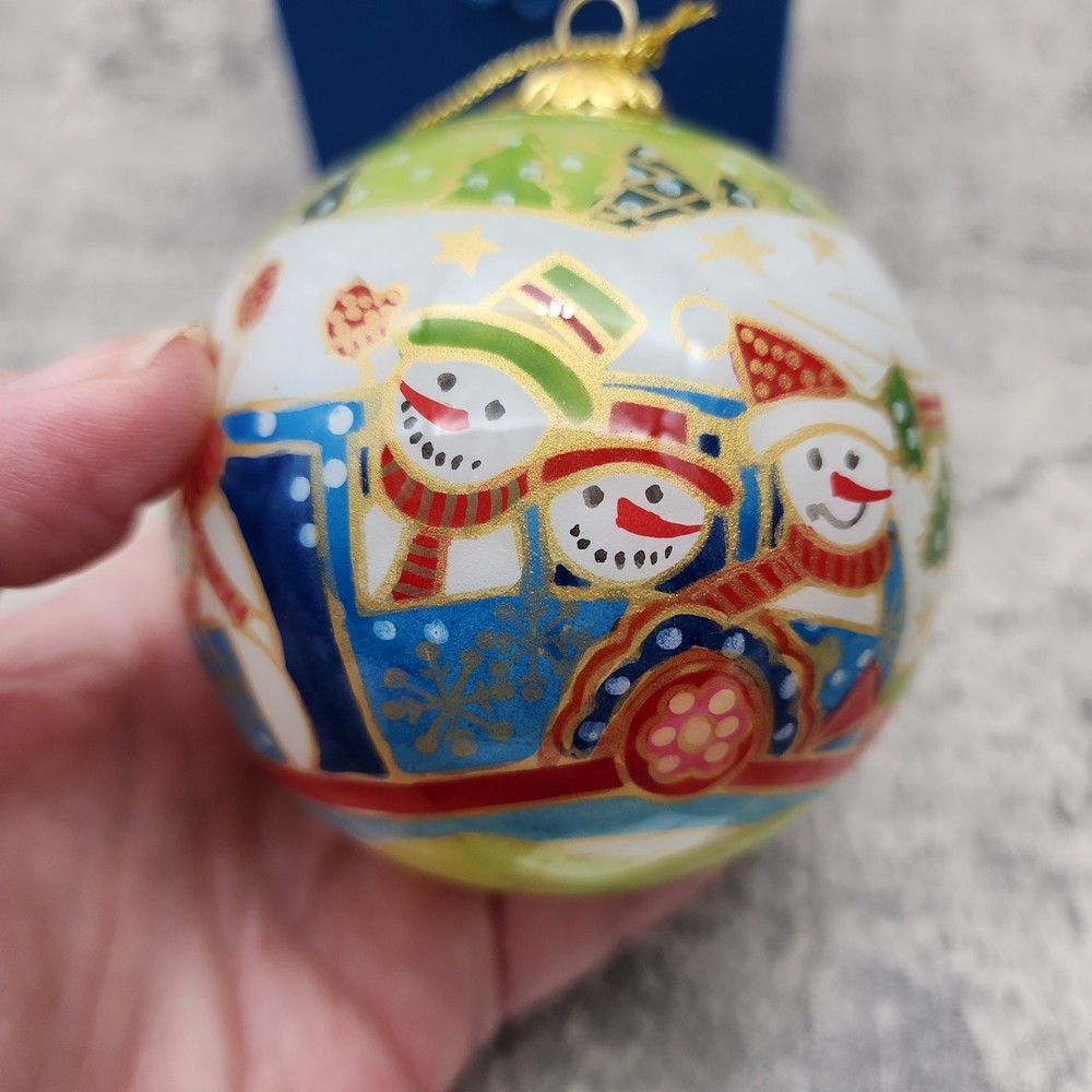 The PIER 1 IMPORTS Li Bien Snowmen Christmas Ornament 2009 is a beautifully crafted hanging ornament featuring a round shape and a medium size of 3 inches in height. This artist-designed ornament is reverse painted with traditional style and features a multicolored design with snowmen characters. Made of glass using a mouth-blown production technique, this handmade ornament comes in a set of two with an original design from the Pier 1 Imports franchise. The ornament is a perfect addition to any Christmas décor collection and is sure to bring joy to anyone over 18 years of age. Ornament is in great condition. Original Box has staining noted. Please see photos for details.