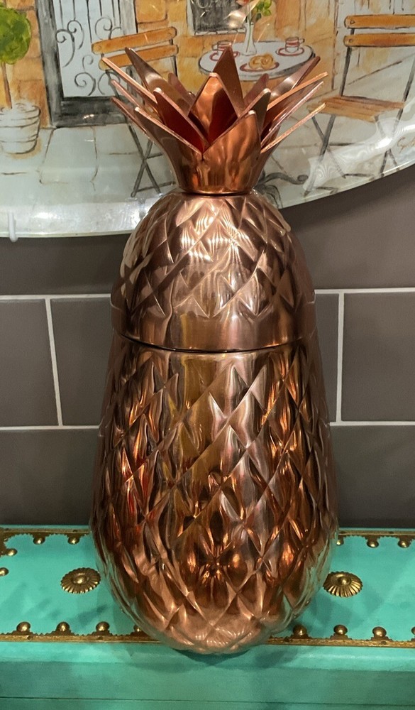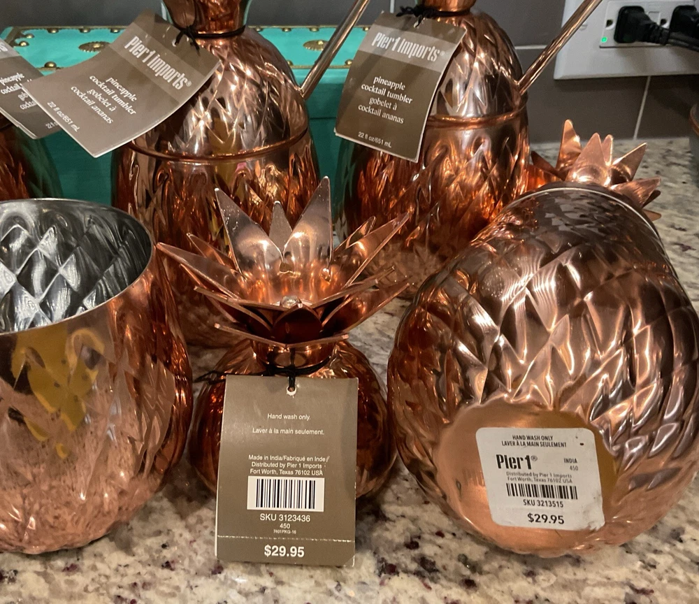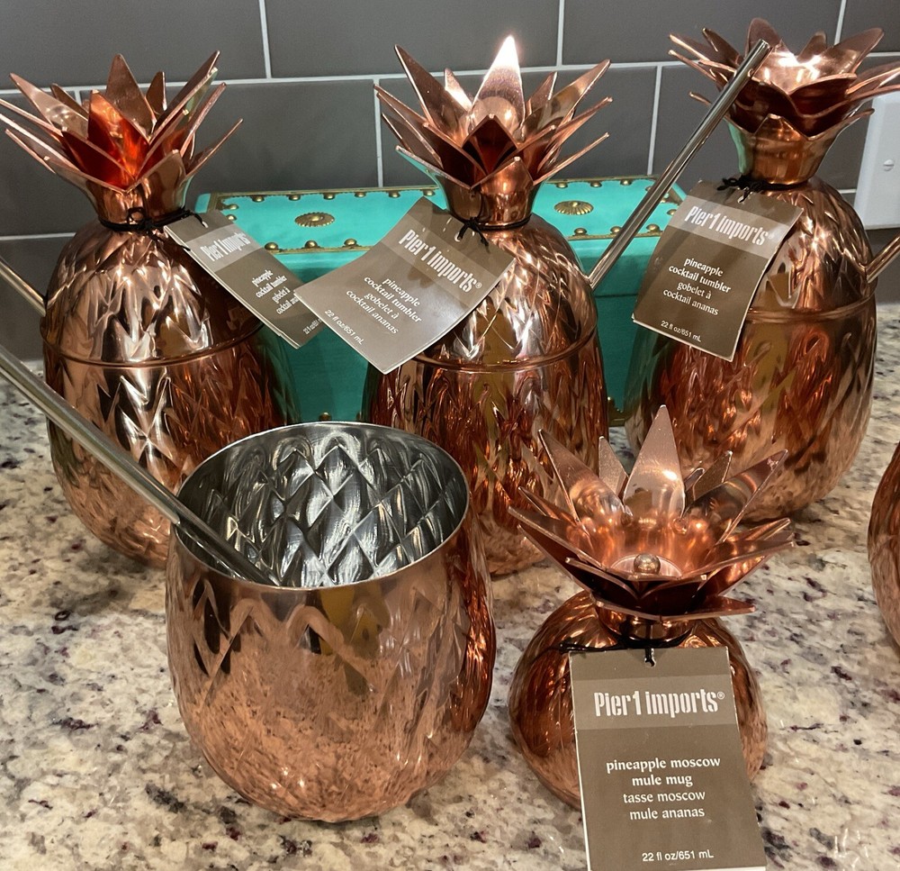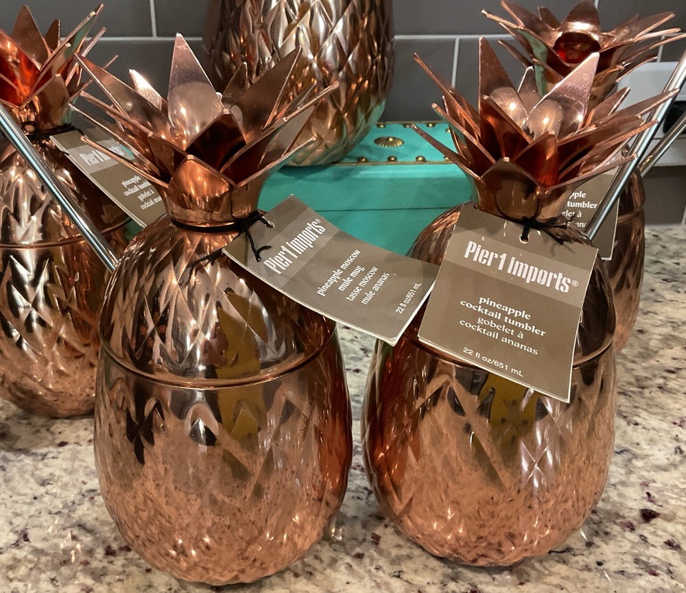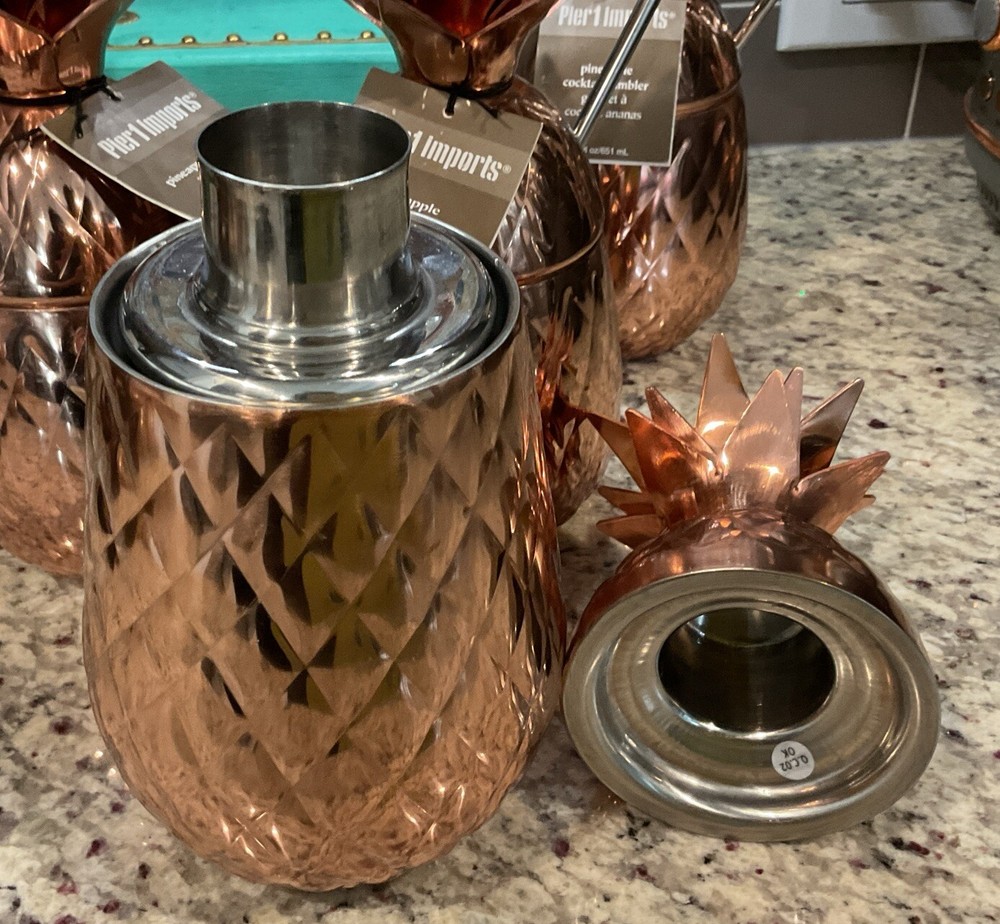 MSRP $149.75 Add a touch of contemporary style to your cocktail parties with this set of four Pier 1 Imports Pineapple Cocktail Tumblers. The pear-shaped tumblers are made of stainless steel and have a copper color with a pineapple pattern that will make your guests smile. Each tumbler has a capacity of 22 fl.oz./651 mL and comes with a straw, making it easy to hold and enjoy your favorite cocktails. The set includes four tumblers and a cocktail shaker, perfect for all occasions and service for four people. The tumblers are hand wash only and have features like with straw and hand wash. The Pier 1 Imports Pineapple Cocktail Tumbler is a perfect addition to your glassware collection and will make your parties unforgettable.