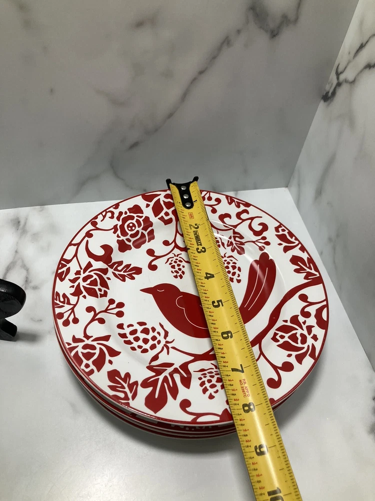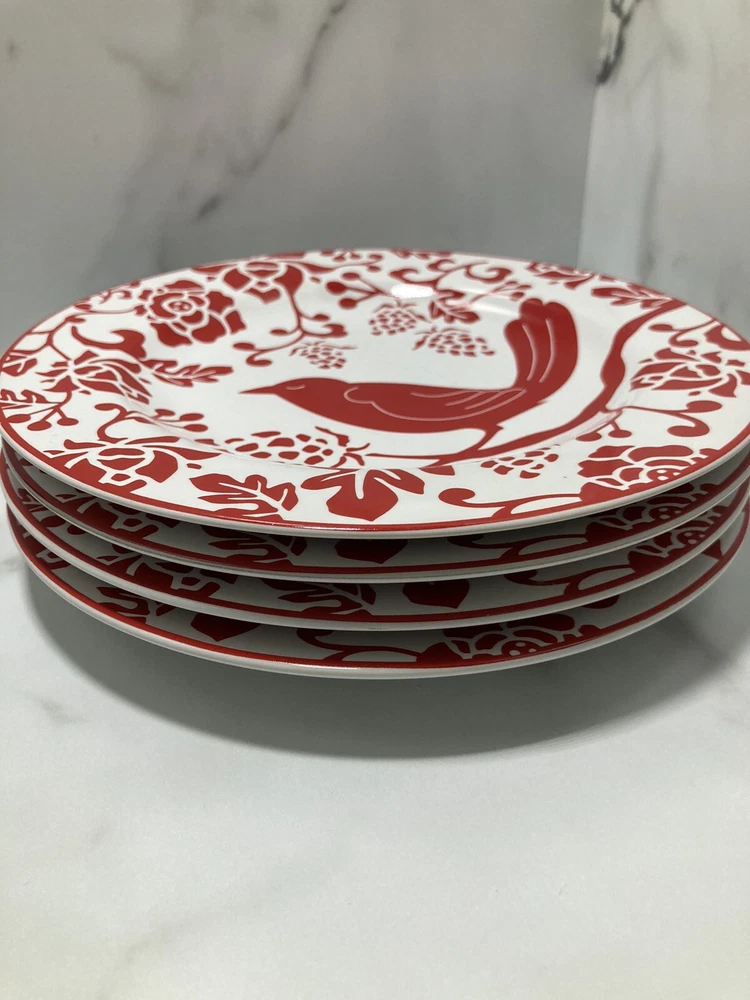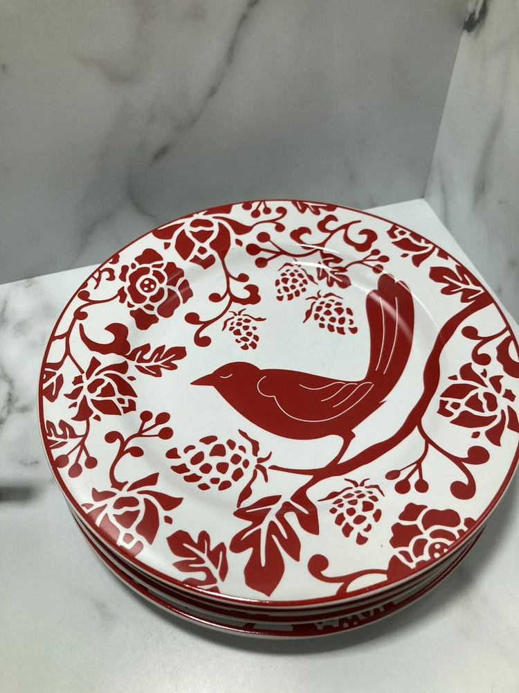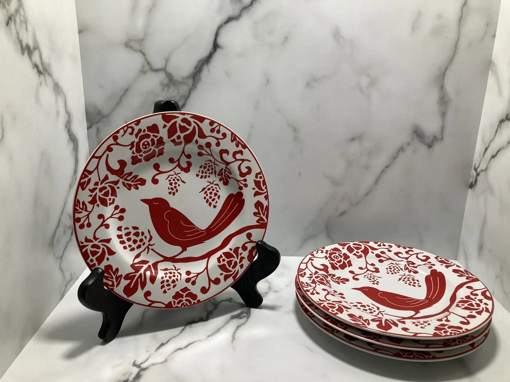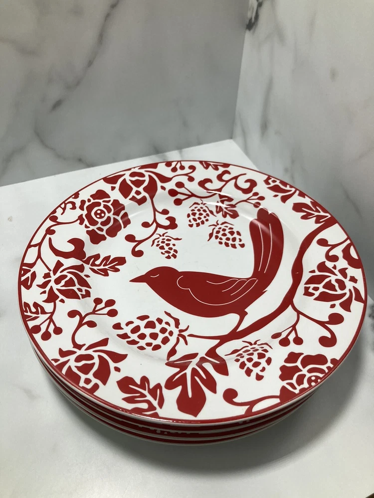 PIER 1 IMPORTS Red Bird Salad Dessert Plates 8” - Set of 4. See pictures Silverware marks on plate...