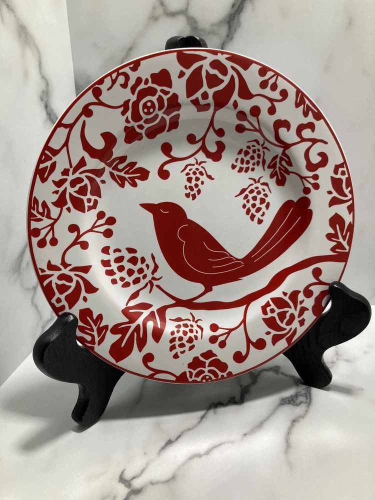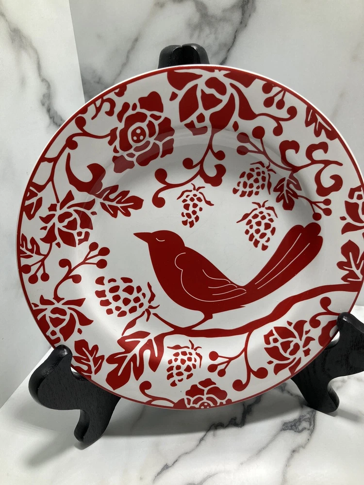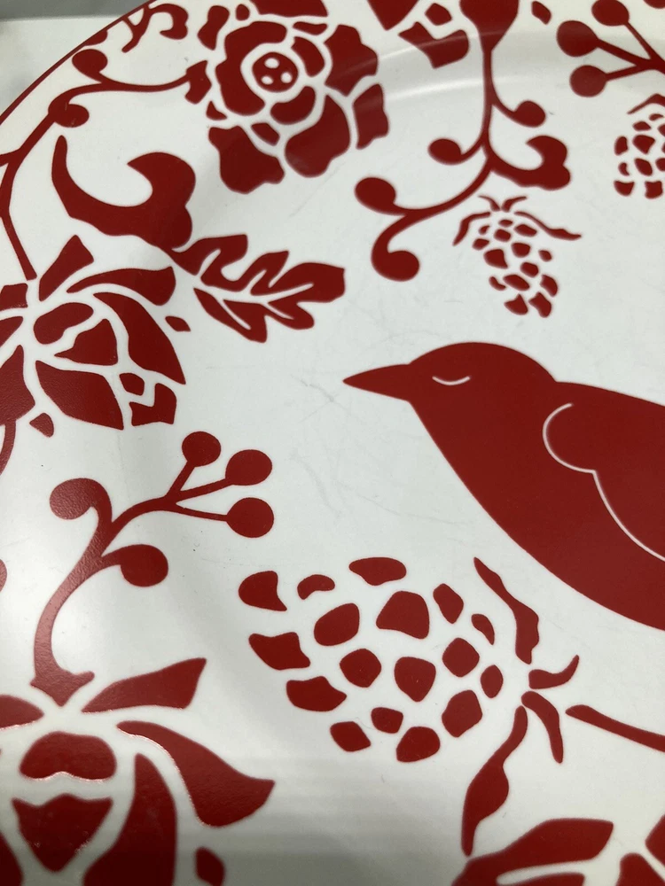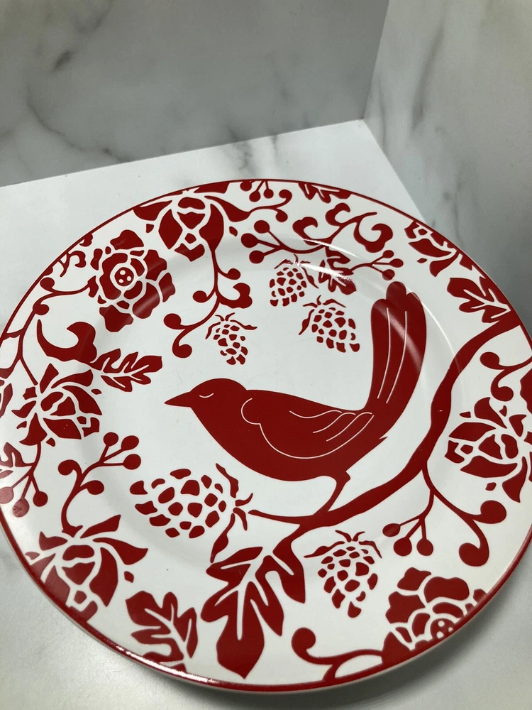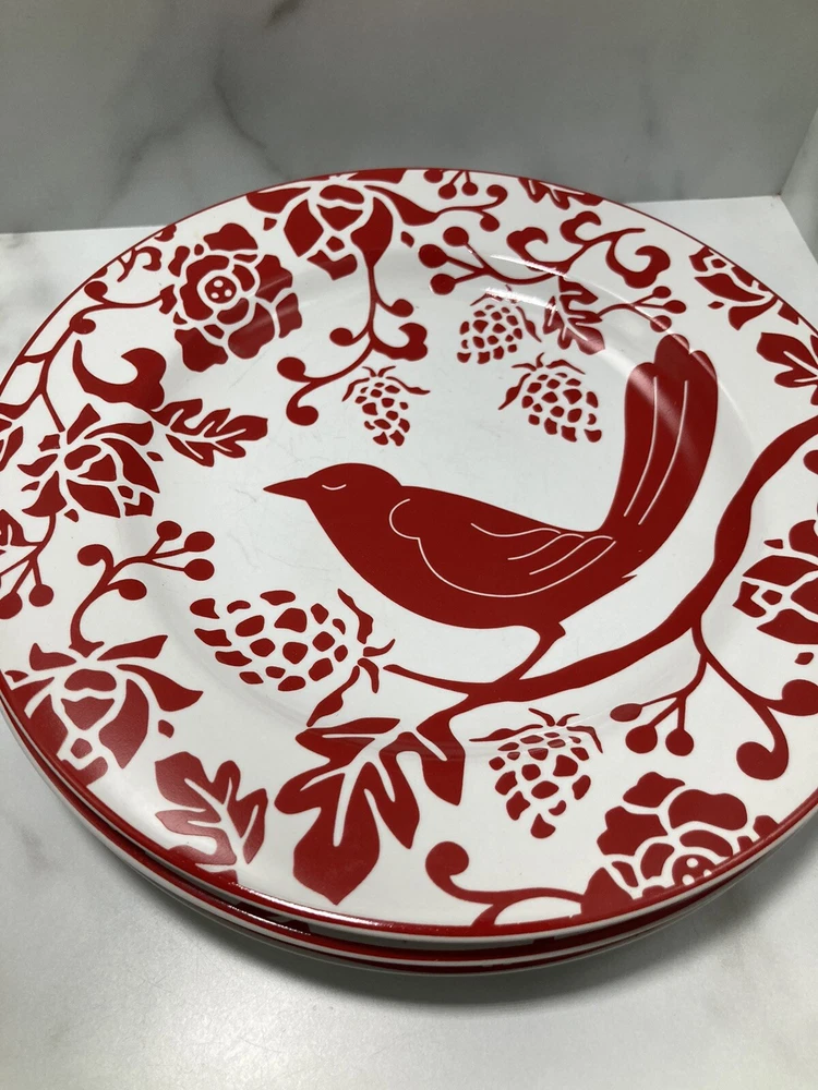 PIER 1 IMPORTS Red Bird Salad Dessert Plates 8” - Set of 4. See pictures Silverware marks on plate...