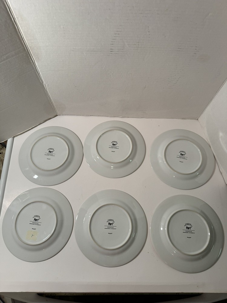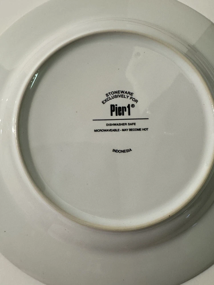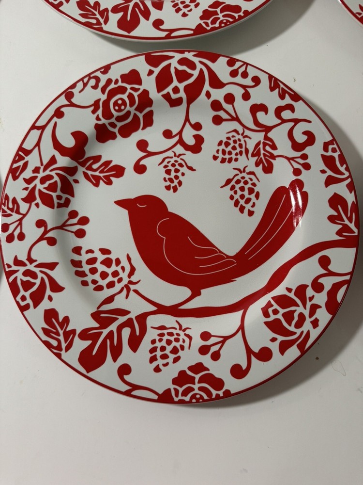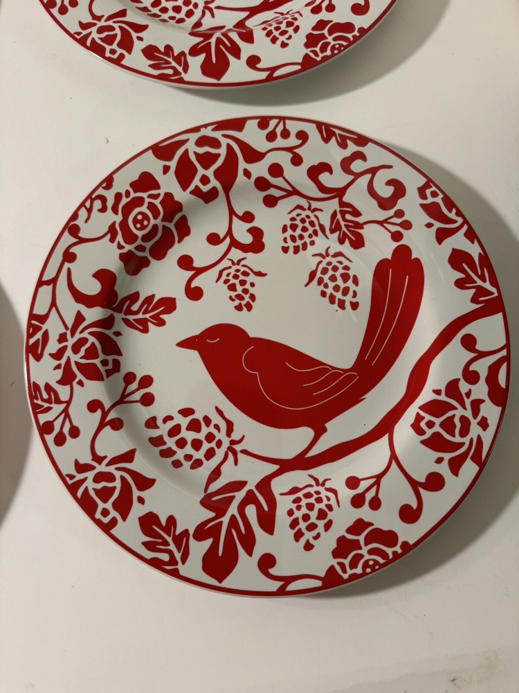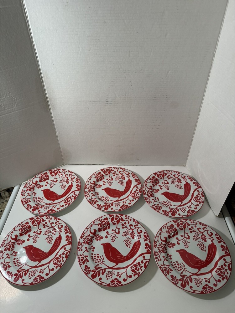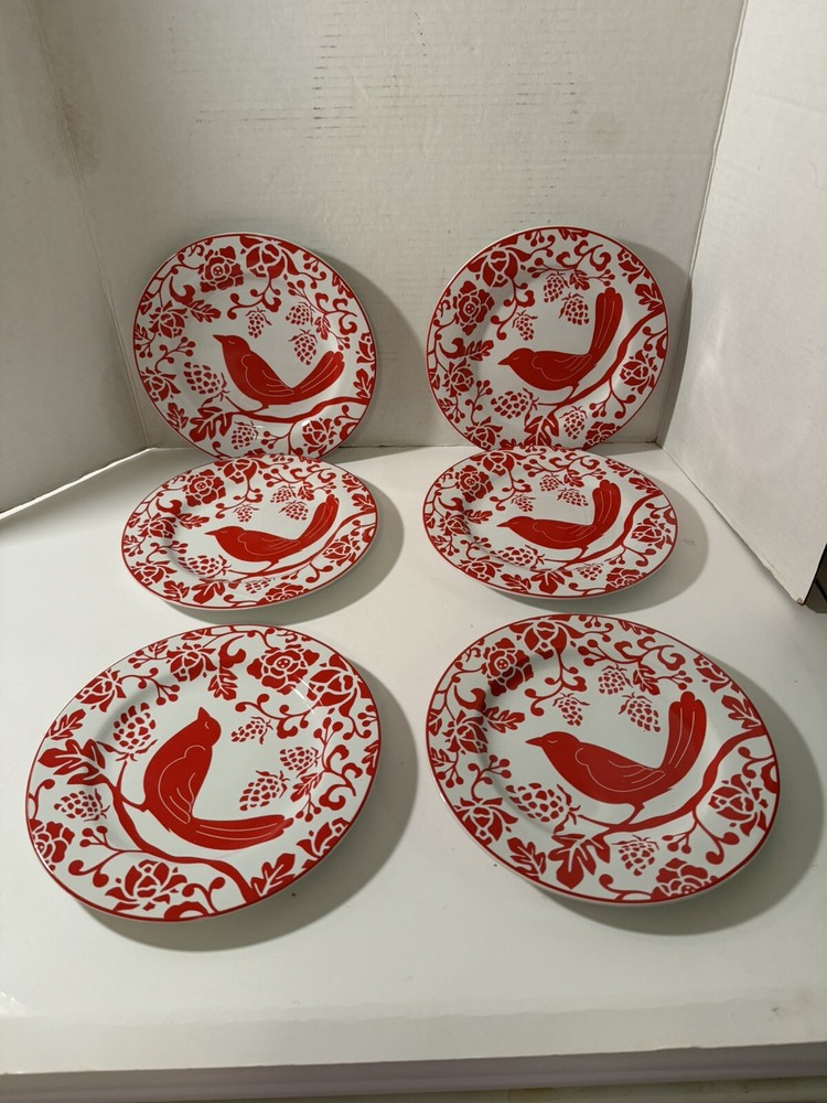 Add a touch of contemporary elegance to your dining table with this set of six Pier 1 Imports red bird salad dessert plates. Crafted from glazed stoneware, these round plates measure 8.25 inches in diameter and 1 inch in height, making them perfect for all occasions. The plates feature a delightful red bird pattern that adds a playful touch to your dining experience. This five-piece set includes both dessert and salad plates, with a printed backstamp .The plates are oven-safe and were manufactured in Indonesia using a stoneware production technique. Ideal for adults, these plates are a great addition to any 21st-century dinnerware collection.