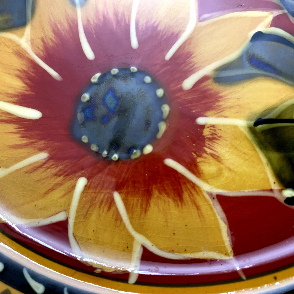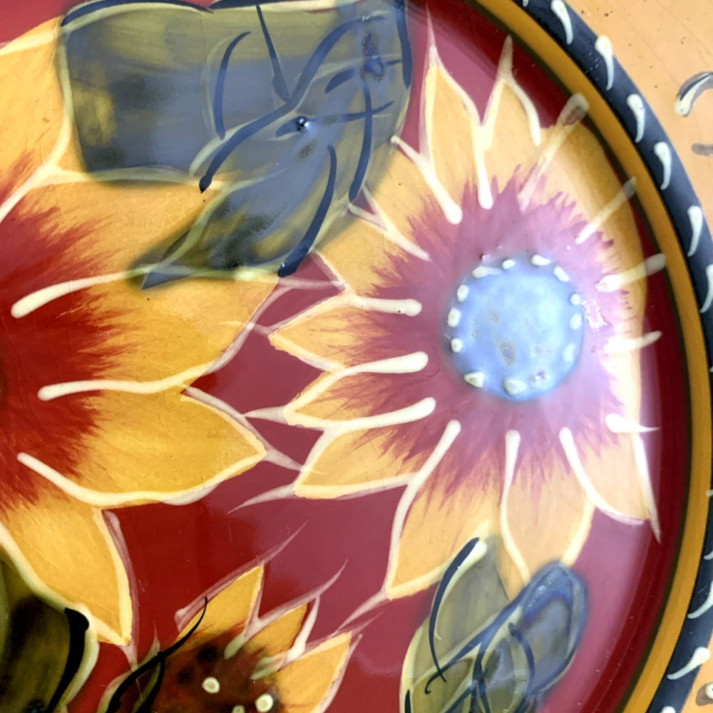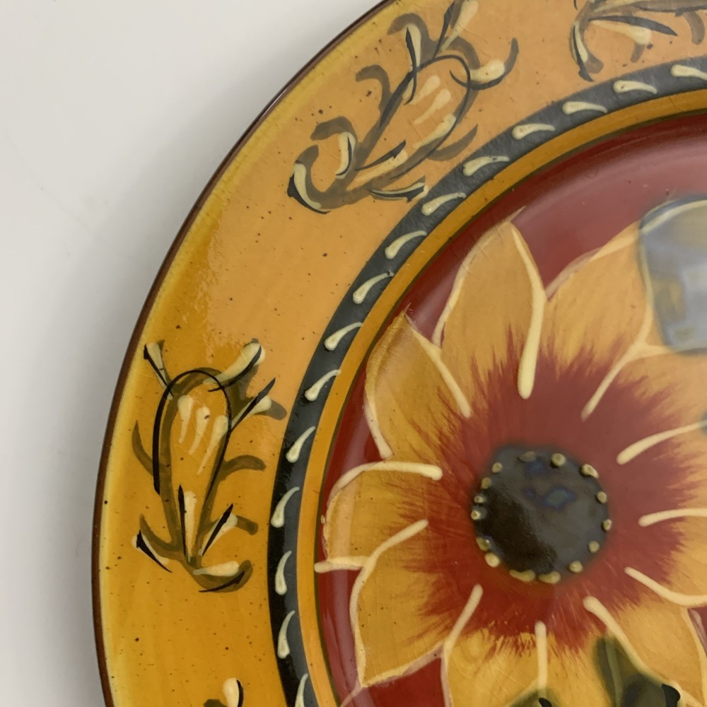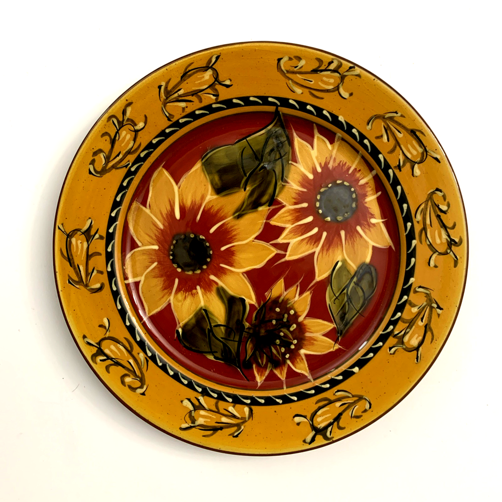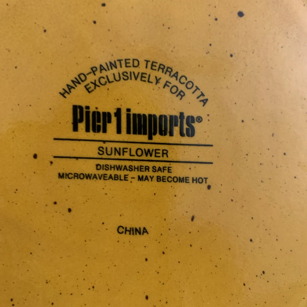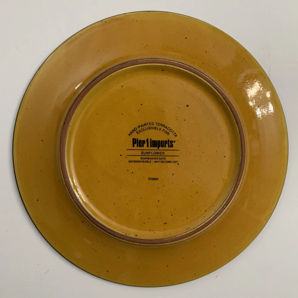 PIER 1 IMPORTS Dessert or salad plate Sunflower pattern 8 1/2" in diameter Hand painted design Terra cotta Very heavyweight -- Each plate weighs a little over 1 pound Some of the pattern is raised up / 3D textured Dark gold with a dark red center. There are black paint spots along the outer rim -- deliberately added Dishwasher safe Microwaveable -- But it will get hot Excellent pre-owned condition. No chips, crazing, cracks, repairs, or other flaws detected. Each is a tiny bit unique due to being hand painted Please send a message if you have any questions, and thanks for looking! ***** I have 7 plates available. This listing is for ONE PLATE, but you can save shipping costs by having more than one combined into the same box. I also have dinner plates, one bowl and one pitcher listed separately