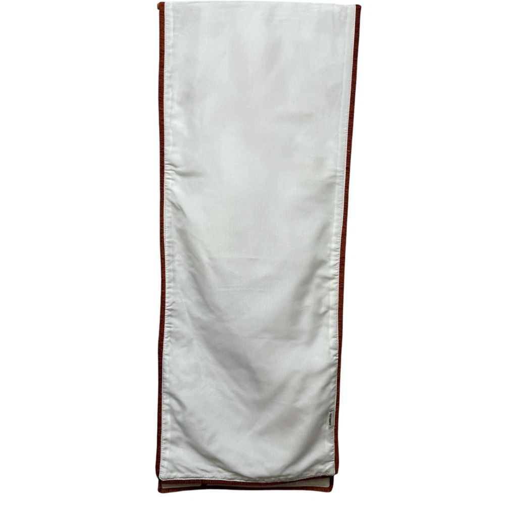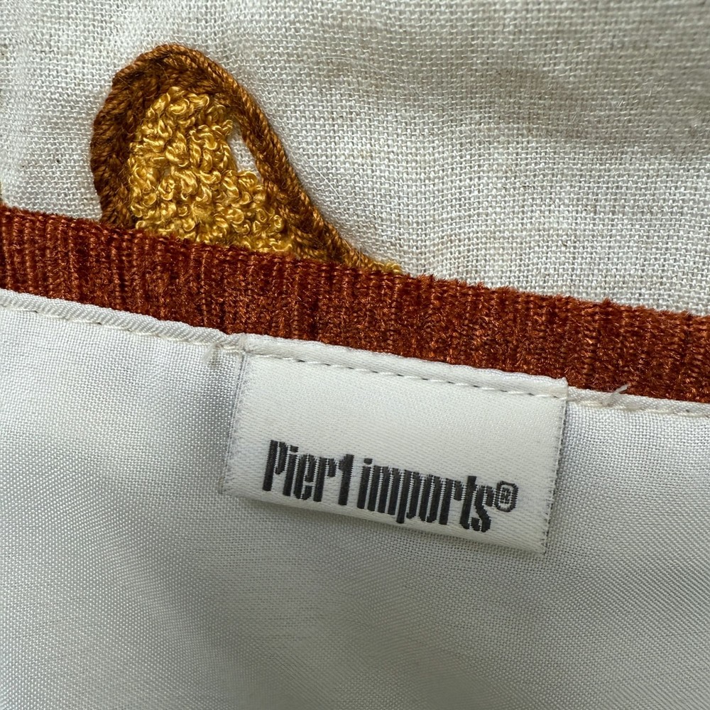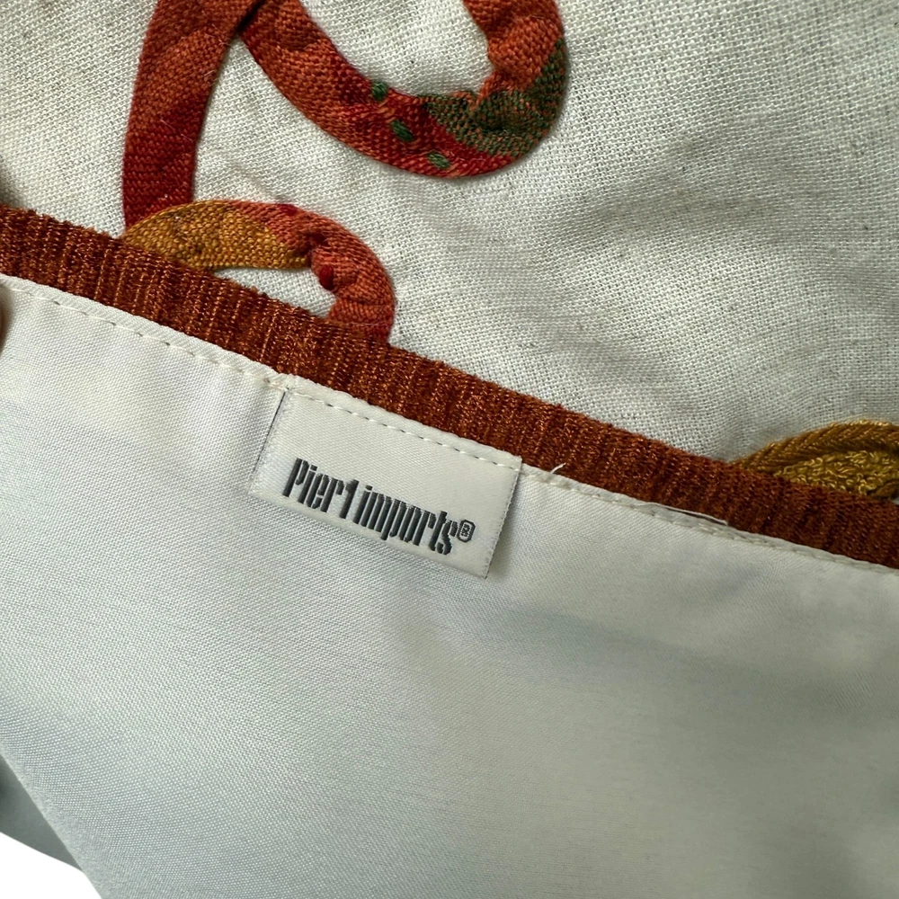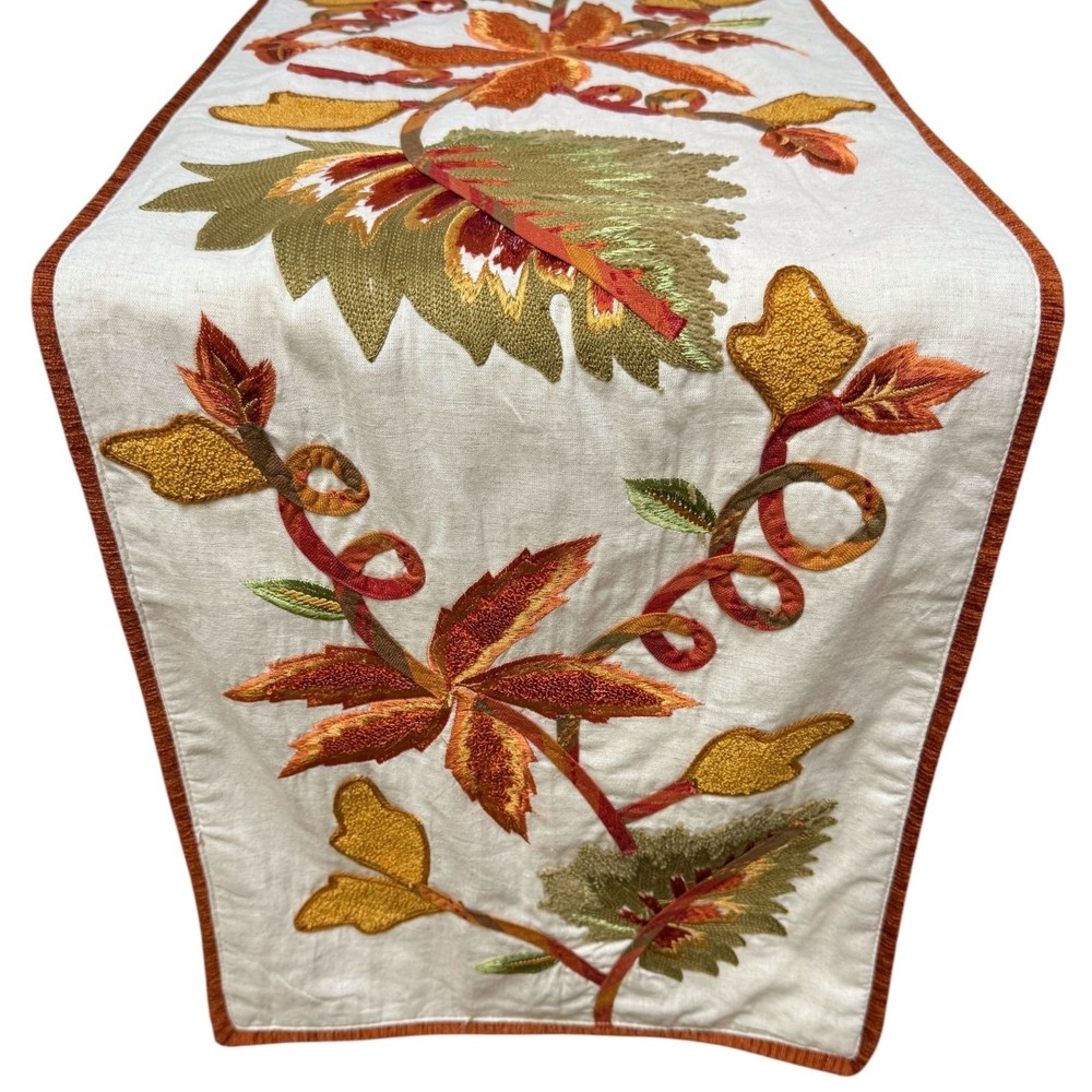 PIER 1 IMPORTS Table Runner Elegant Harvest Colors and Leaves Beautiful Embroidered Detail Feels like a Cotton blend Solid lined back Fringed border Excellent pre-owned condition Measures approx: 14x70"