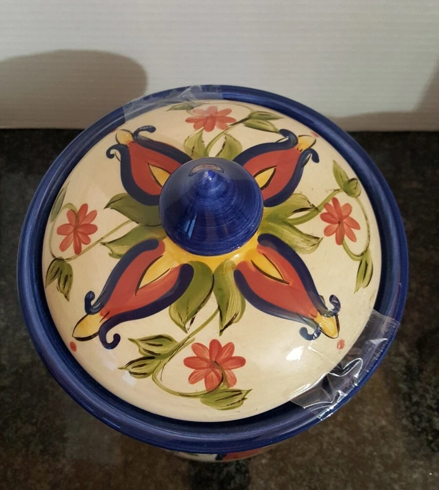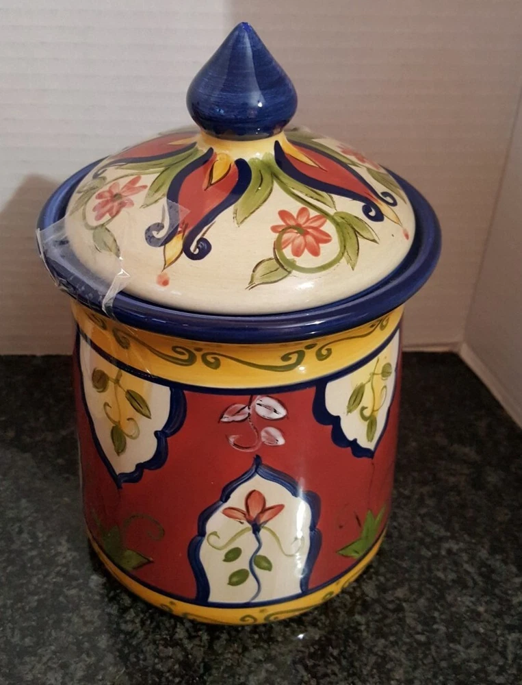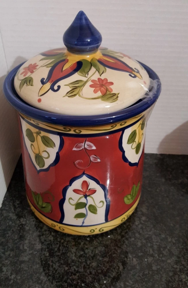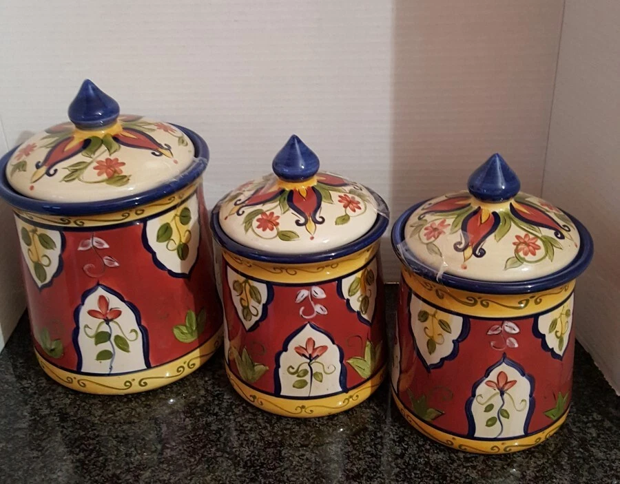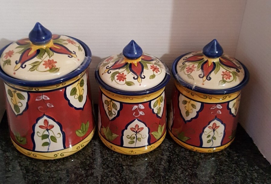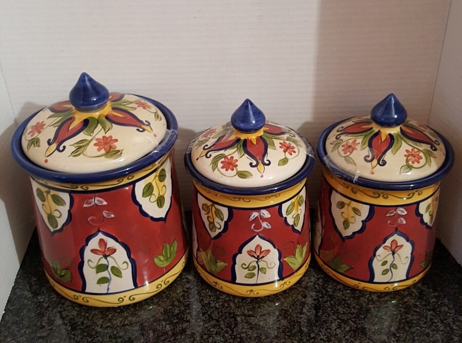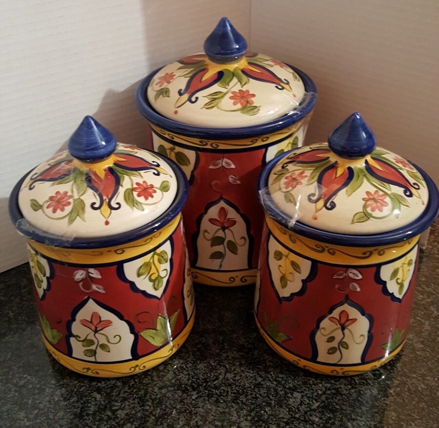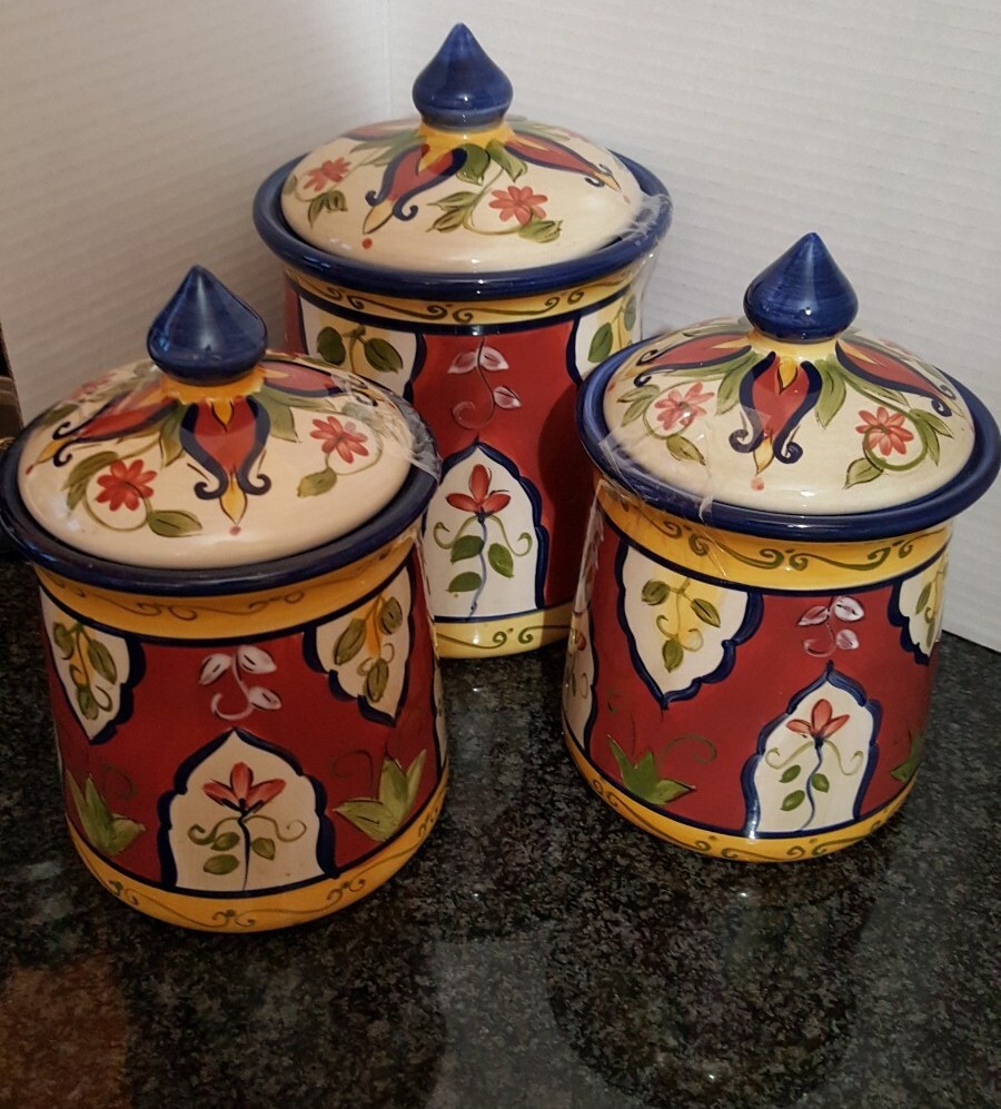 PIER 1 IMPORTS VALLARTA DESIGN CANISTER SET - SET OF THREE - HAND PAINTED - DISCONTINUED. LIDS HAVE AIR TIGHT SEALS. BRIGHT VIBRANT COLORS OF RED - BLUE - YELLOW. DISHWASHER AND MICROWAVE SAFE. PERFECT ADDITION TO ANY DECOR. DAMAGE FREE WITH NO CHIPS OR CRACKS. COMES FROM SMOKE FREE AND PET FREE HOME. PLEASE ASK ALL AND ANY QUESTIONS PRIOR TO PURCHASE AS I DO NOT ACCEPT RETURNS. PLEASE SEE MY OTHER LISTINGS FOR THE MATCHING VALLARTA DESIGN PIECES.