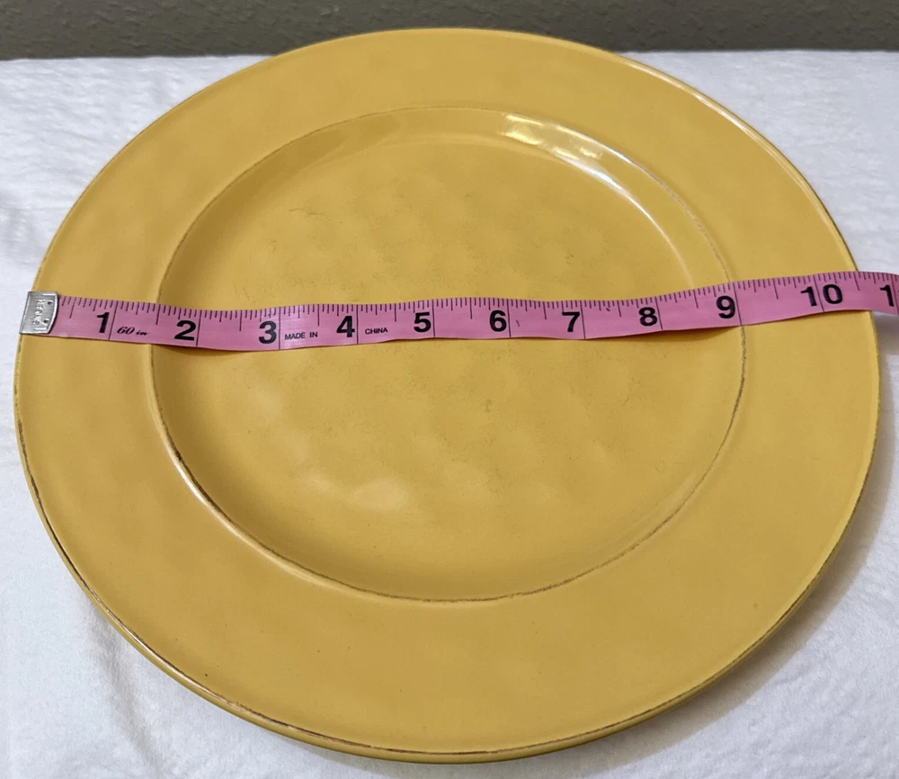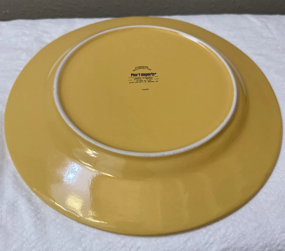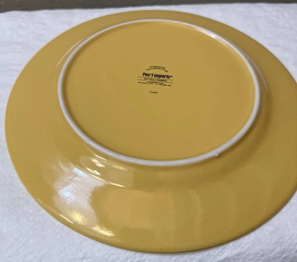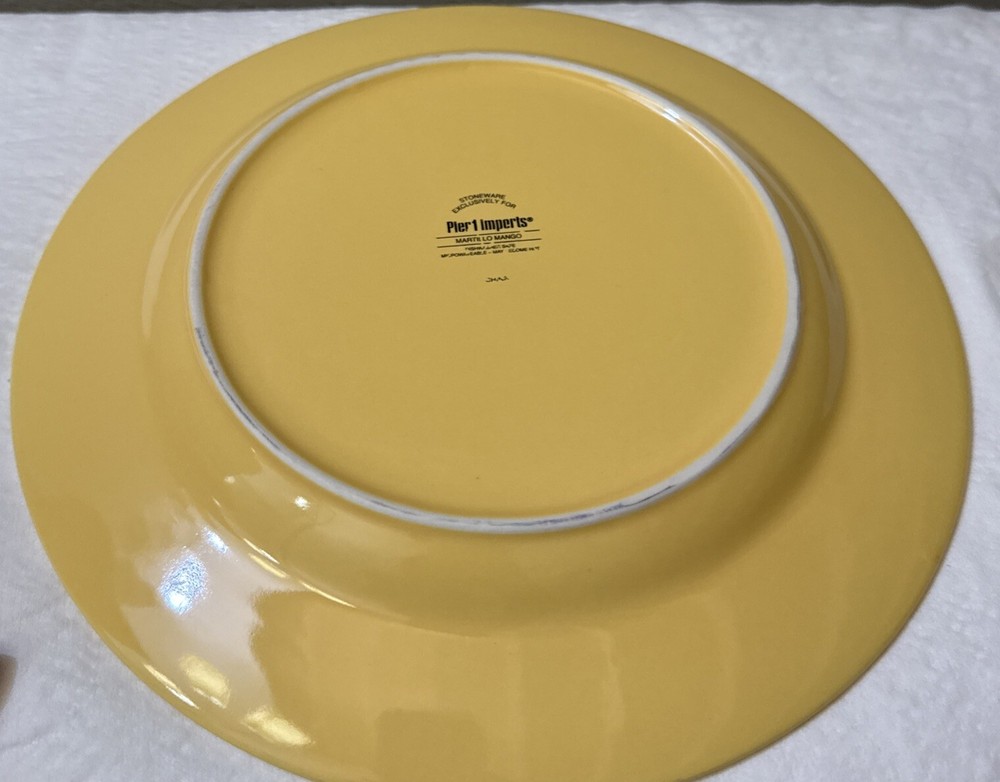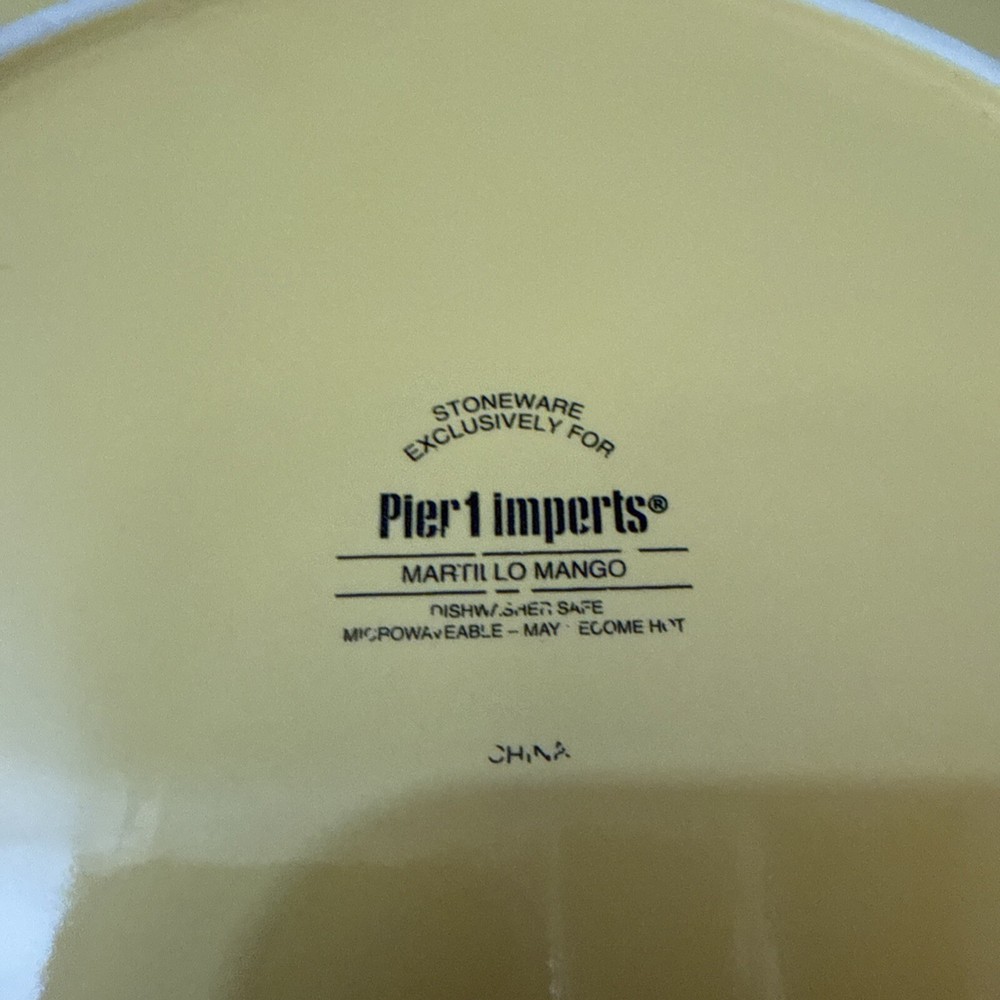 Elevate your dining experience with the Pier 1 Imports Martillo Mango Set of 5 Sun Dinner Plates. Each plate features the vibrant Martillo Mango pattern, a testament to modern design and contemporary style. The round stoneware plates, with a diameter of 10.5 inches, offer a glossy finish that enhances their visual appeal and makes them a striking addition to any table setting. Crafted for versatility, these plates are suitable for all occasions, whether it's a casual family dinner or a sophisticated gathering with friends. The set is made in China, reflecting the quality and craftsmanship that Pier 1 Imports is known for. With a printed backstamp, these plates confirm their authenticity and are a perfect choice for those who appreciate the blend of functionality and aesthetic elegance. These Pier One dinner plates are in very good condition. There are no chips or cracks. The front of the plates do show some wear from utensils.