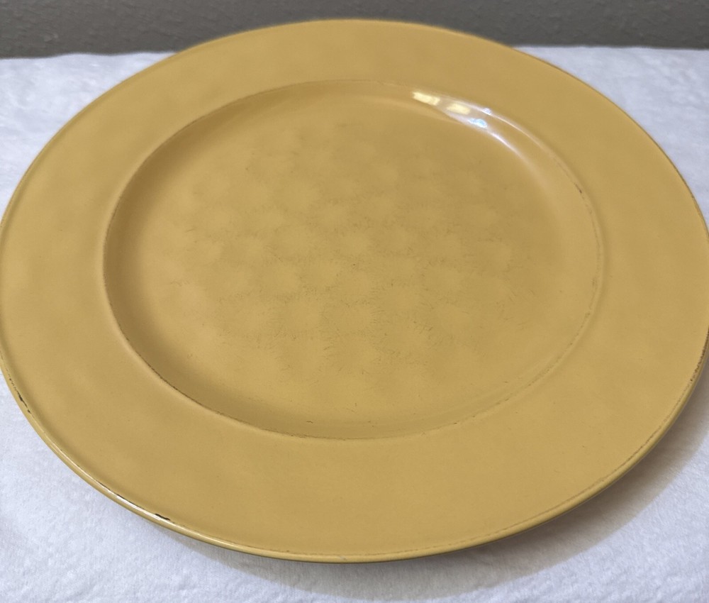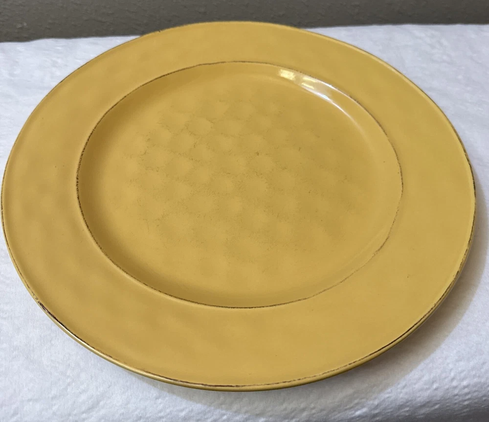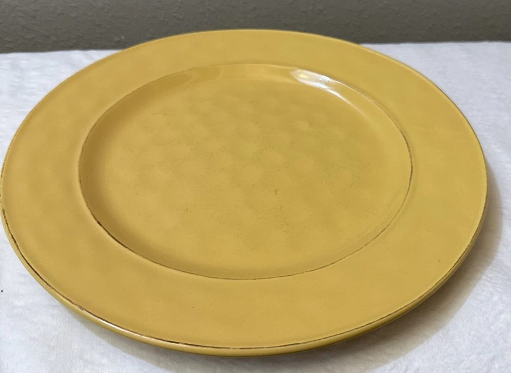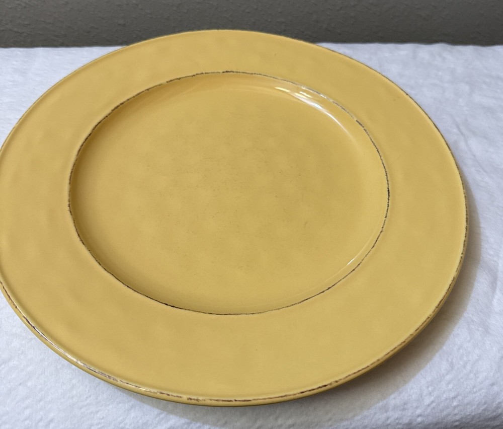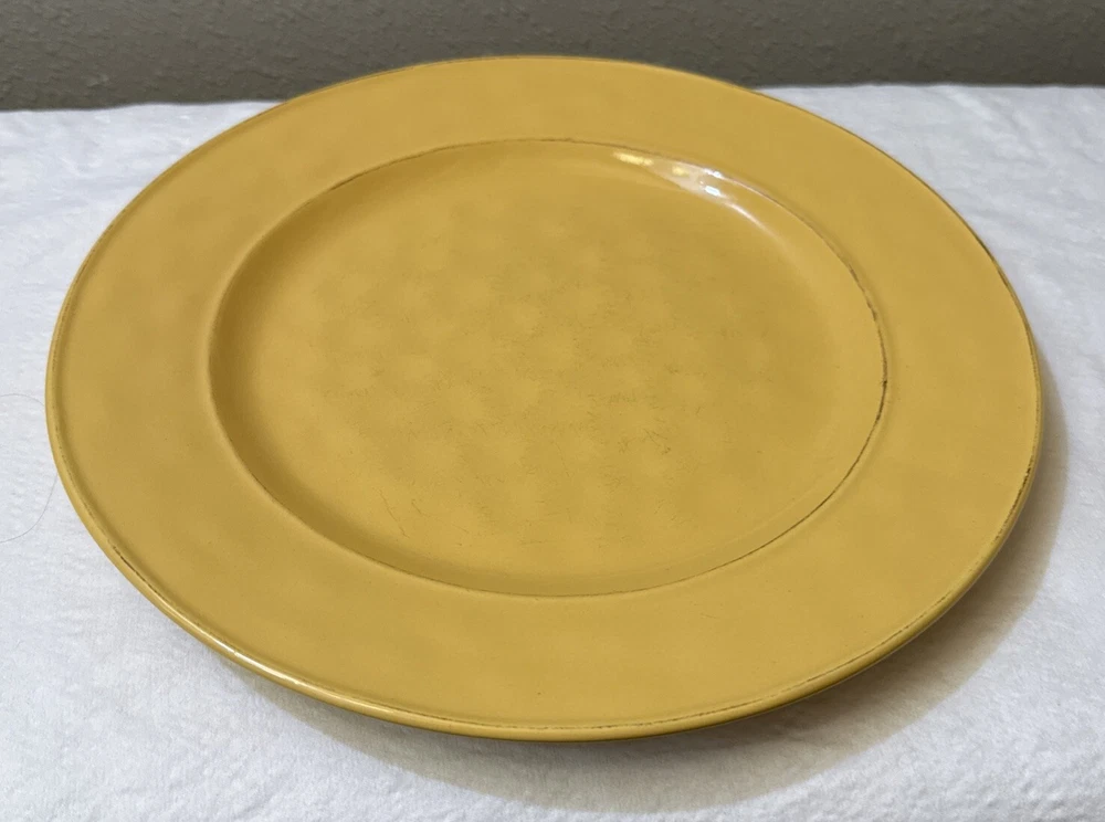 Elevate your dining experience with the Pier 1 Imports Martillo Mango Set of 5 Sun Dinner Plates. Each plate features the vibrant Martillo Mango pattern, a testament to modern design and contemporary style. The round stoneware plates, with a diameter of 10.5 inches, offer a glossy finish that enhances their visual appeal and makes them a striking addition to any table setting. Crafted for versatility, these plates are suitable for all occasions, whether it's a casual family dinner or a sophisticated gathering with friends. The set is made in China, reflecting the quality and craftsmanship that Pier 1 Imports is known for. With a printed backstamp, these plates confirm their authenticity and are a perfect choice for those who appreciate the blend of functionality and aesthetic elegance. These Pier One dinner plates are in very good condition. There are no chips or cracks. The front of the plates do show some wear from utensils.