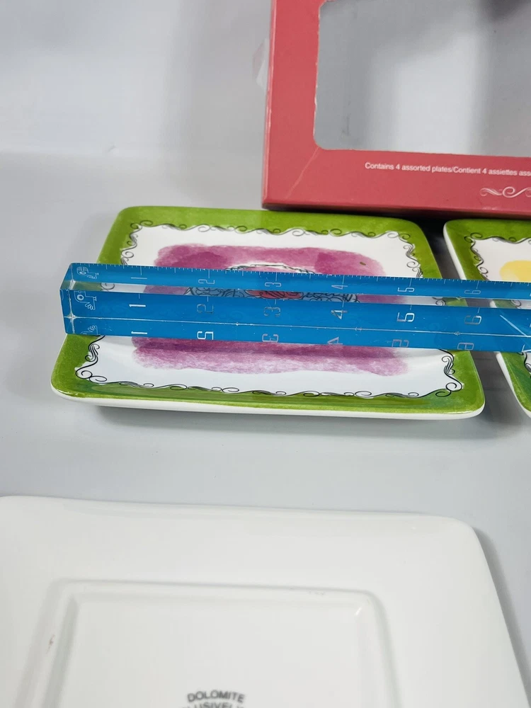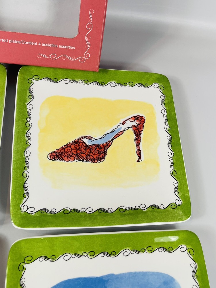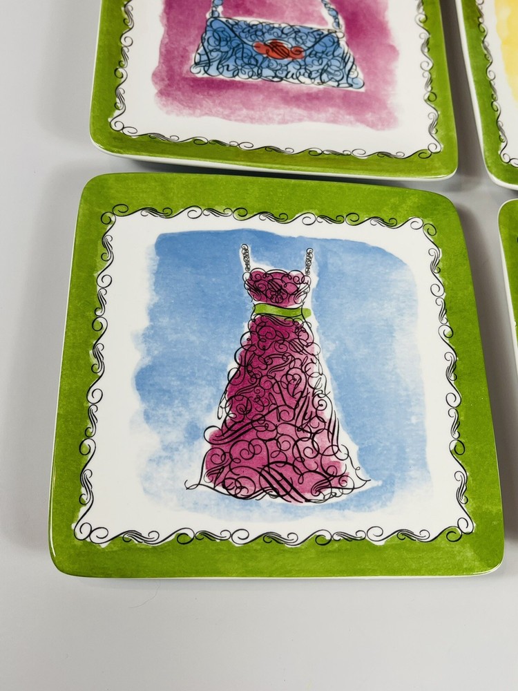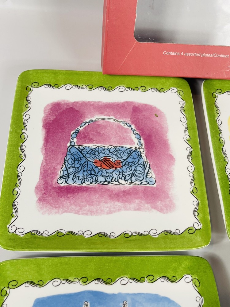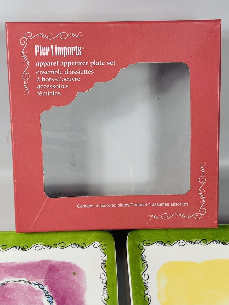 PIER 1 Imports Apparel Appetizer Dessert Plates Set of 4 Dress Hat Purse Shoe Brand new in box. Removed soley for these photos....