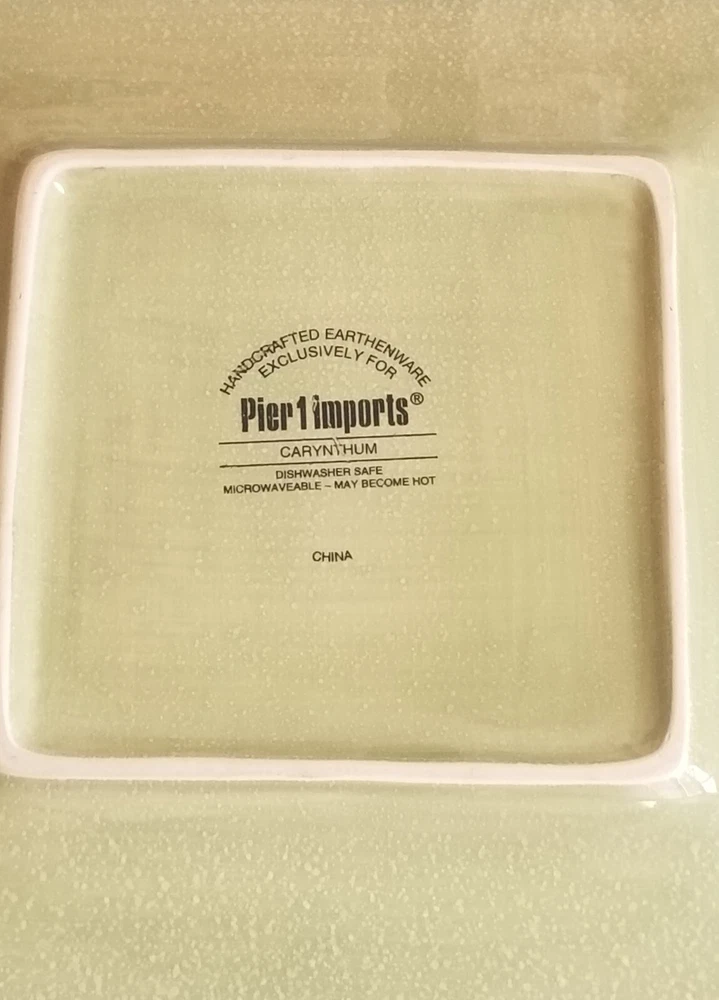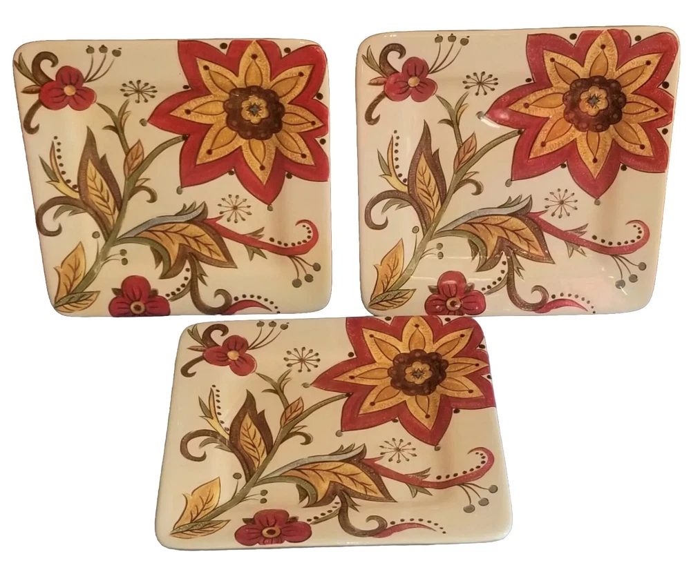 Set of 3 Pier 1 Imports, Carynthum, square earthenware salad plates in LIKE NEW condition. Measure approx 8-7/8" square. No nicks, chips or glaze crazing. Little to NO scratches on the plates. Possibly never used. Dishwasher & microwave safe. Could get hot in microwave. Handpainted, so all not exactly the same. Choice of S&H. Thanks for shopping with SugarBarn.