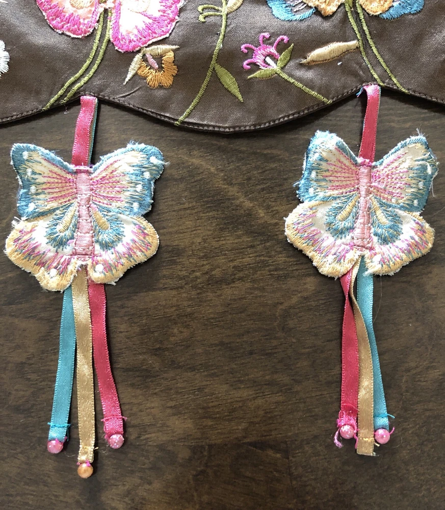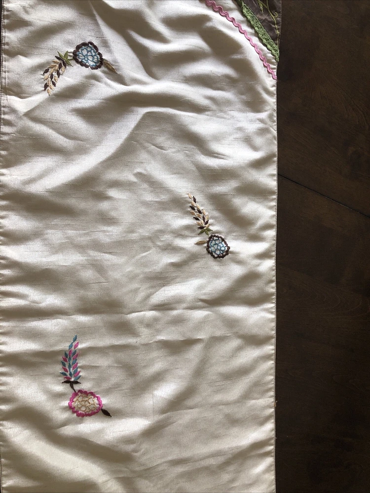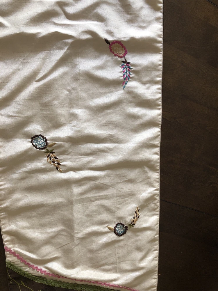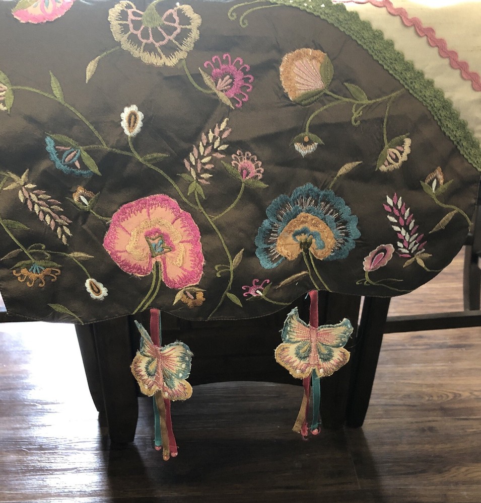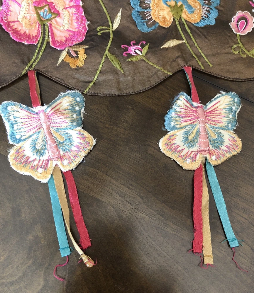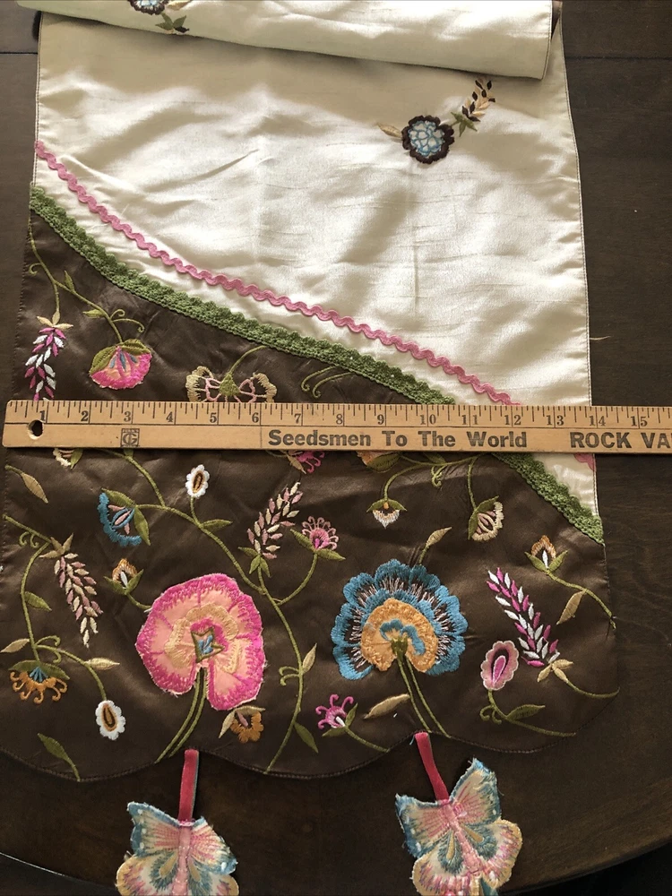 PIER 1 Multi-Color Cream Brown Embroidered Floral Butterfly TABLE RUNNER 72x14” Butterfly tassels table runner Pier 1 Imports SKU 2451604 The butterflies dangle off the edge on colorful ribbons. There’s supposed to be beads on the end and they’re missing. Cute design, never even used.