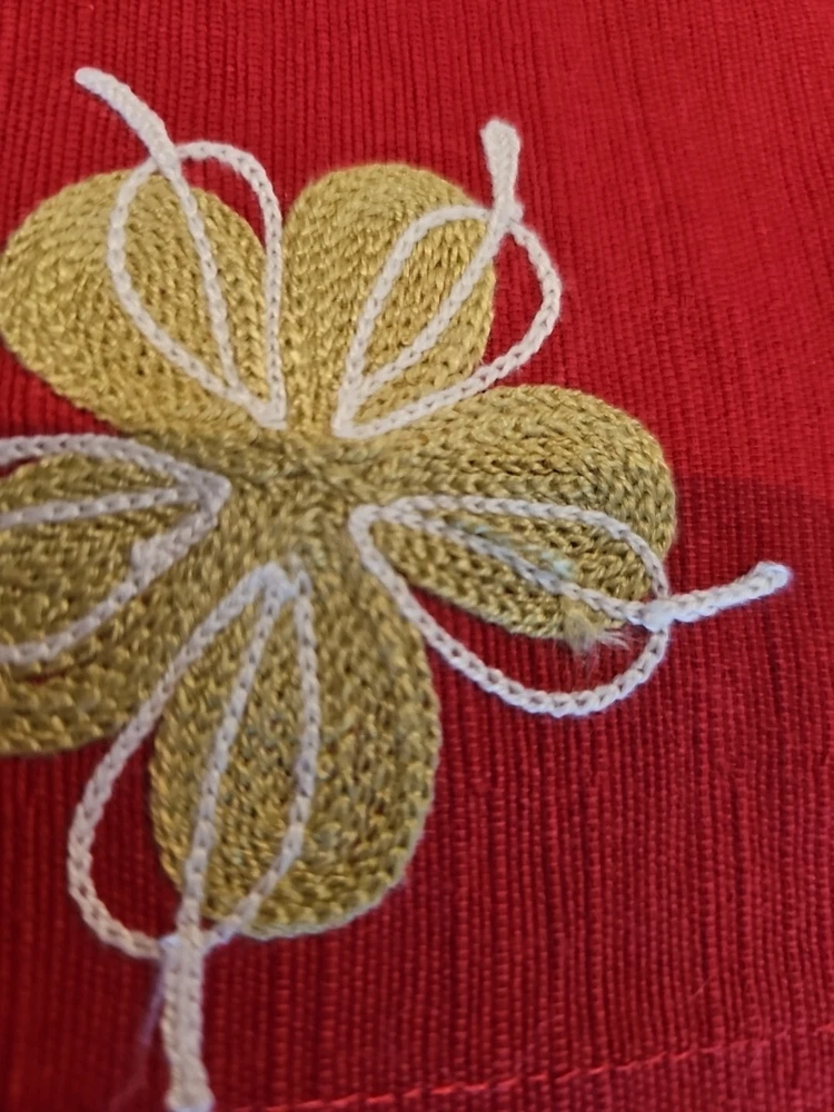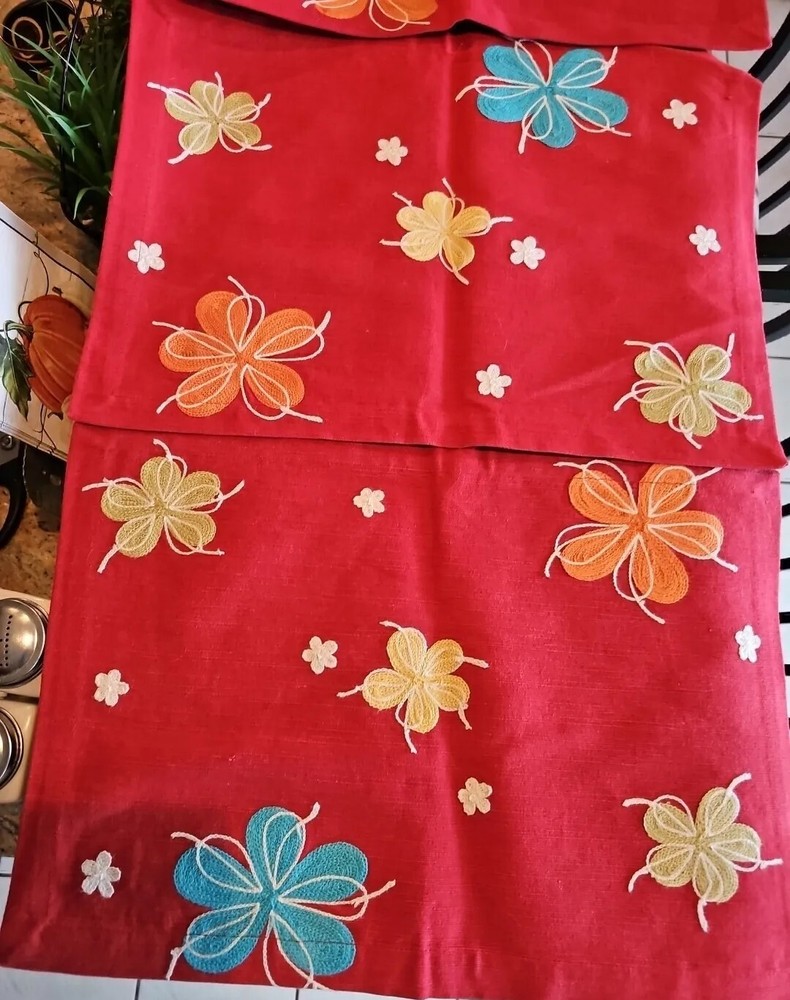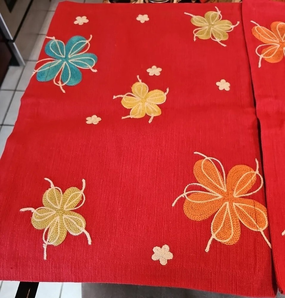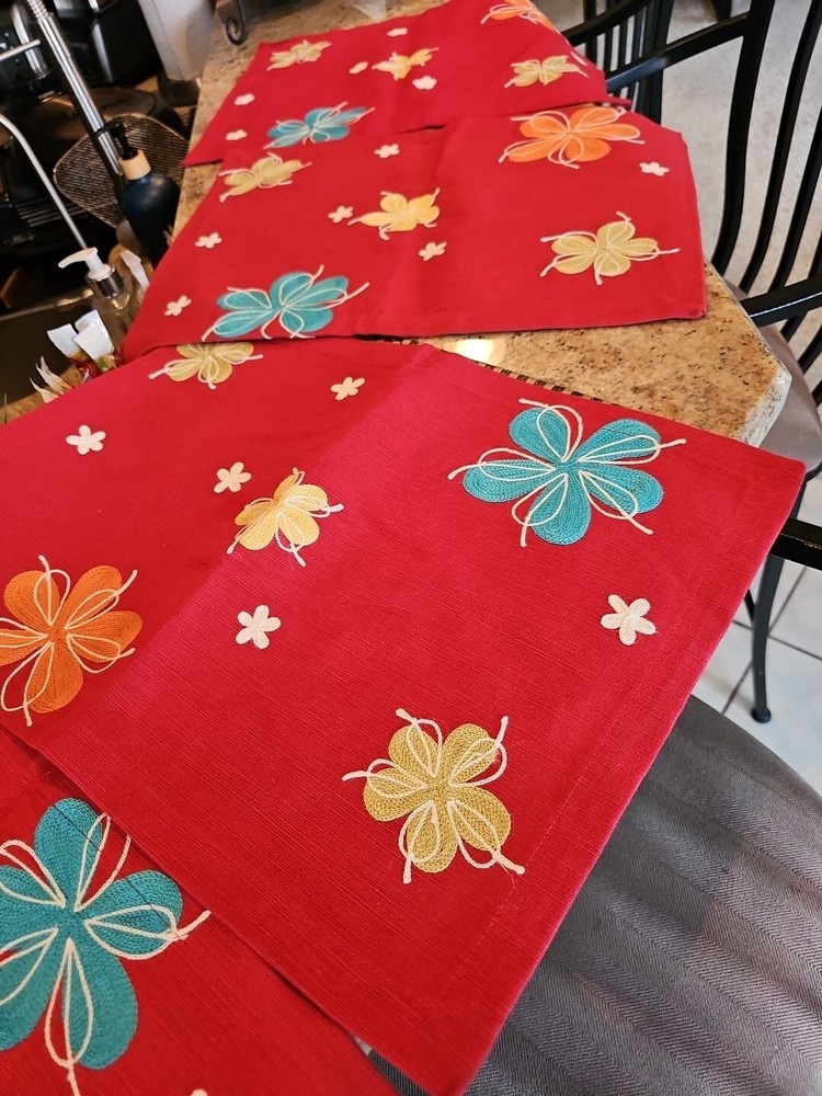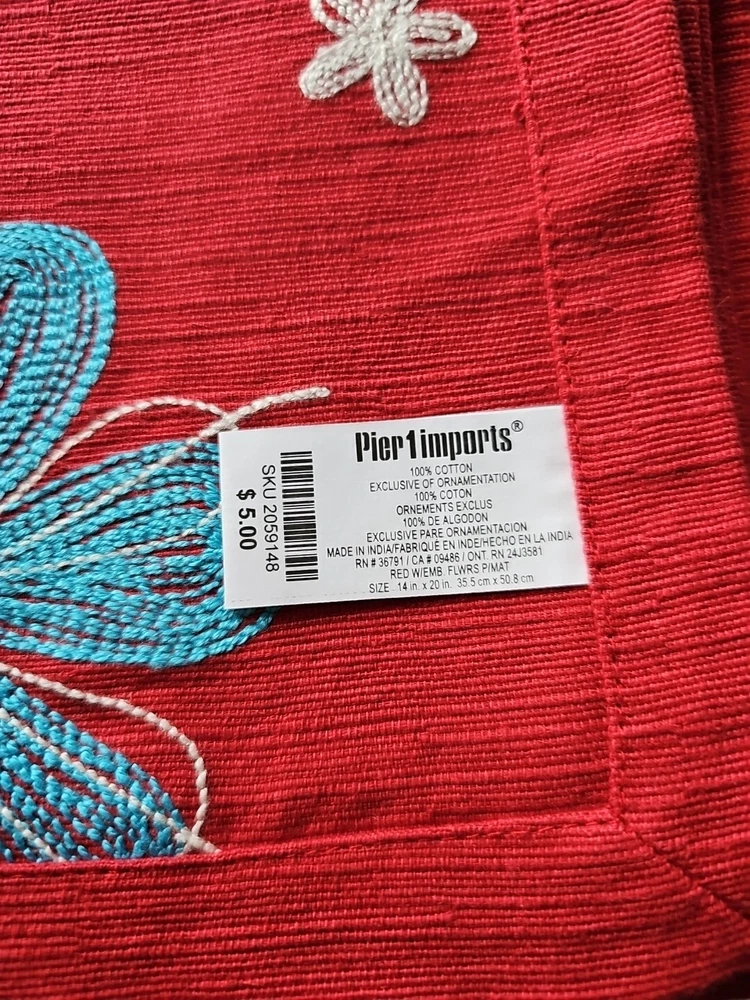 PIER 1 PLACEMATS SET/5 RED MULTI FLORAL COTTON 14"X20" EMBROIDERED - RETAIL $5 EA - VERY LIGHTLY USED - CLEAN & SMOKE FREE...SEE PICS AS PART OF DESCRIPTION ~ ESTATE SALE FIND - Add a pop of color to your table with this set of four Pier 1 placemats. The vibrant red with turquoise, yellow, green, white & orange floral pattern on a rectangular shape will add a bohemian fashion theme to any occasion. Made of cotton material and embroidered, these placemats are not only stylish but also durable. Each placemat measures 14 inches in width and 20 inches in length, making them perfect for multipurpose use. Care instructions recommend hand washing only, and they are iron safe. Made in India, these placemats are a perfect addition to your dining and kitchen collection. PLEASE PAY WITHIN 2 DAYS OF END OF SALE - NO RETURNS - WILL SHIP INTERNATIONALLY THROUGH THE EBAY INTERNATIONAL SHIPPING PROGRAM - CHECK OUT MY OTHER LISTINGS! 011224
