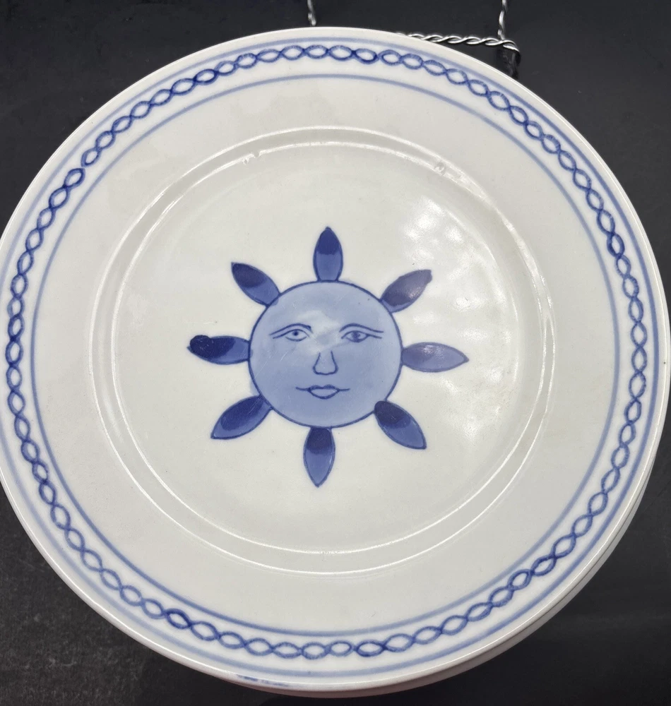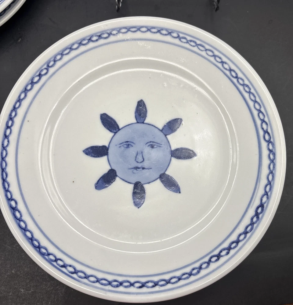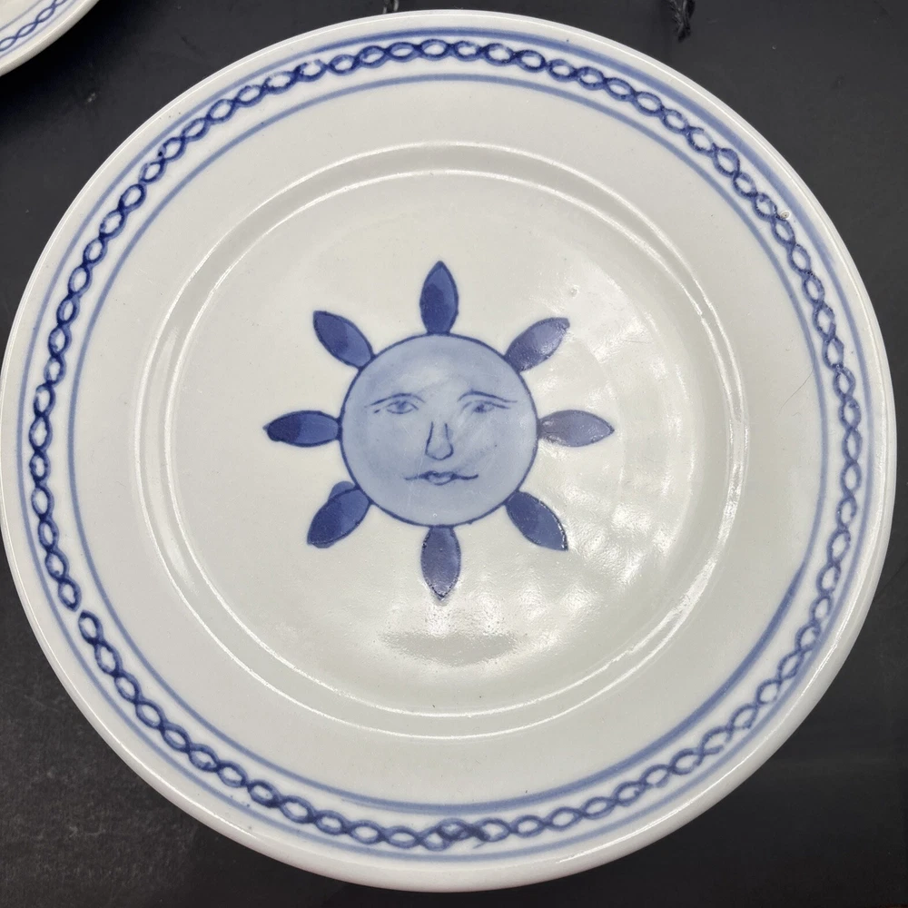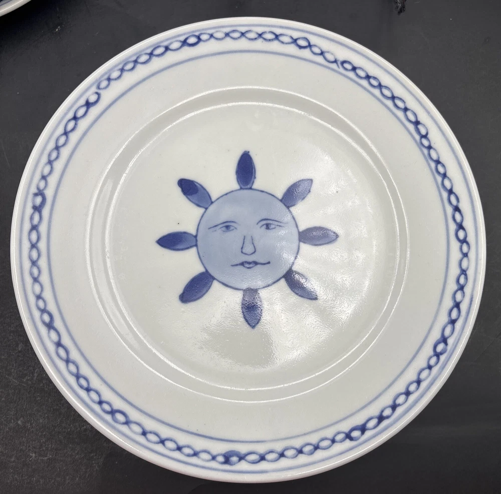 Each handpainted plate has its own little personality, so I have photographed the faces individually. Retired Pier 1 Imports plates, 8 inches in diameter, with the sun, or possibly a flower, giving you a nice serious look instead of a grin. Very refreshing and original. Every plate is in excellent condition without chips, cracks, or crazing. The Pier 1 English-language backstamp ihas been consciously done in a Chinese style, with the lines of the letters overlapping to make crisscross designs. The plates weigh over a pound each. This set will be packed and shipped with great care.