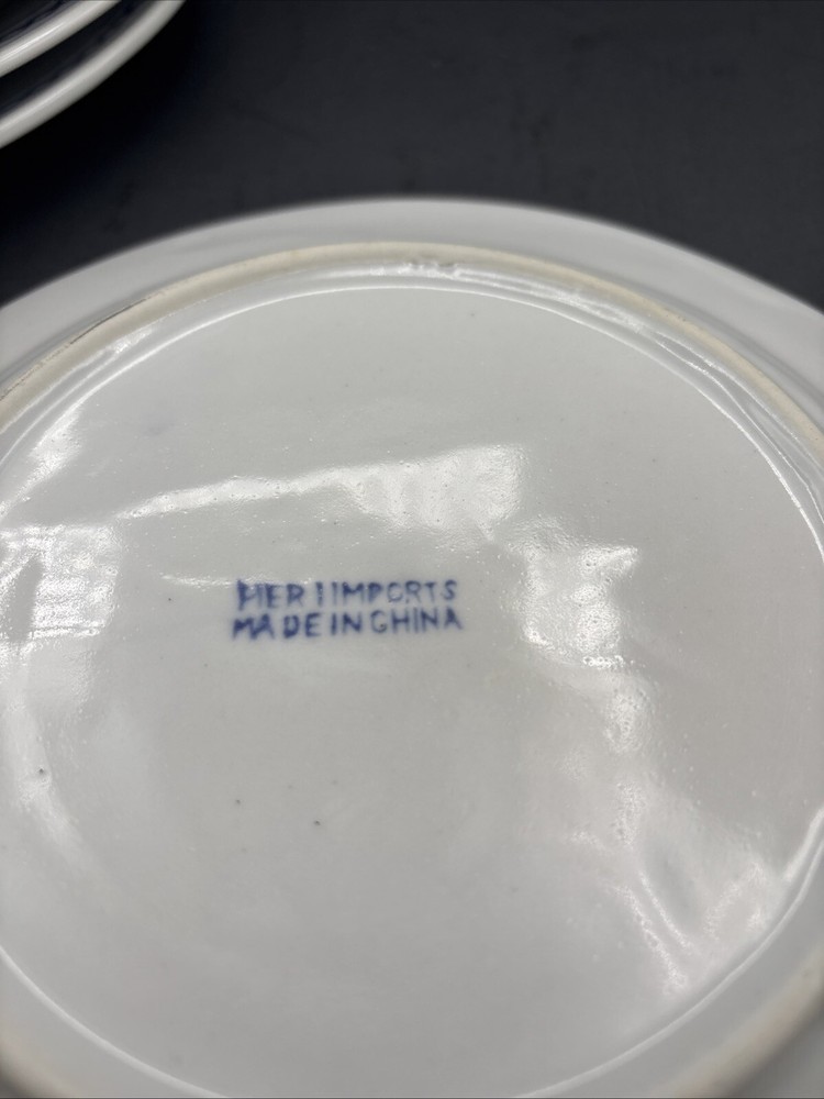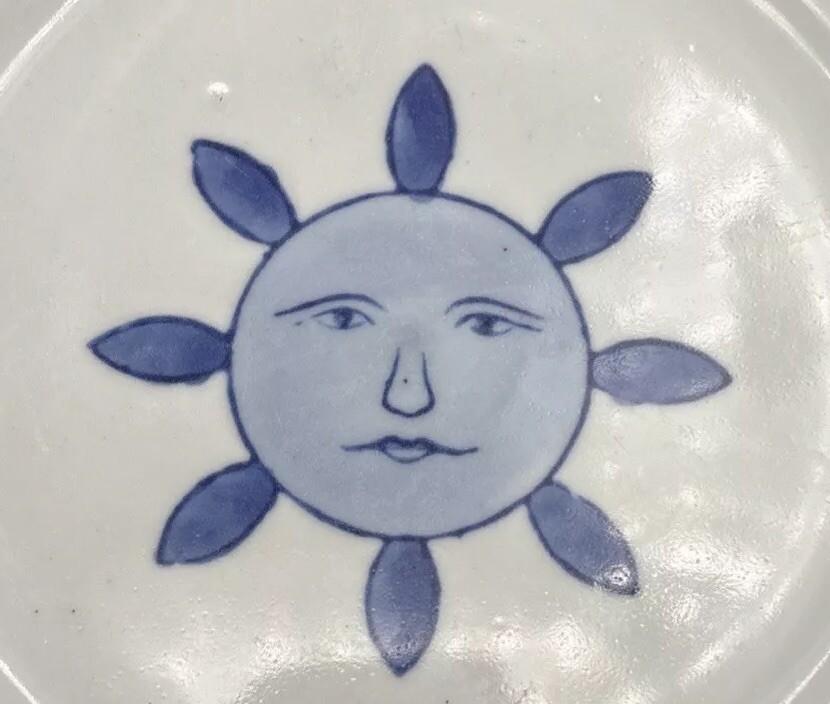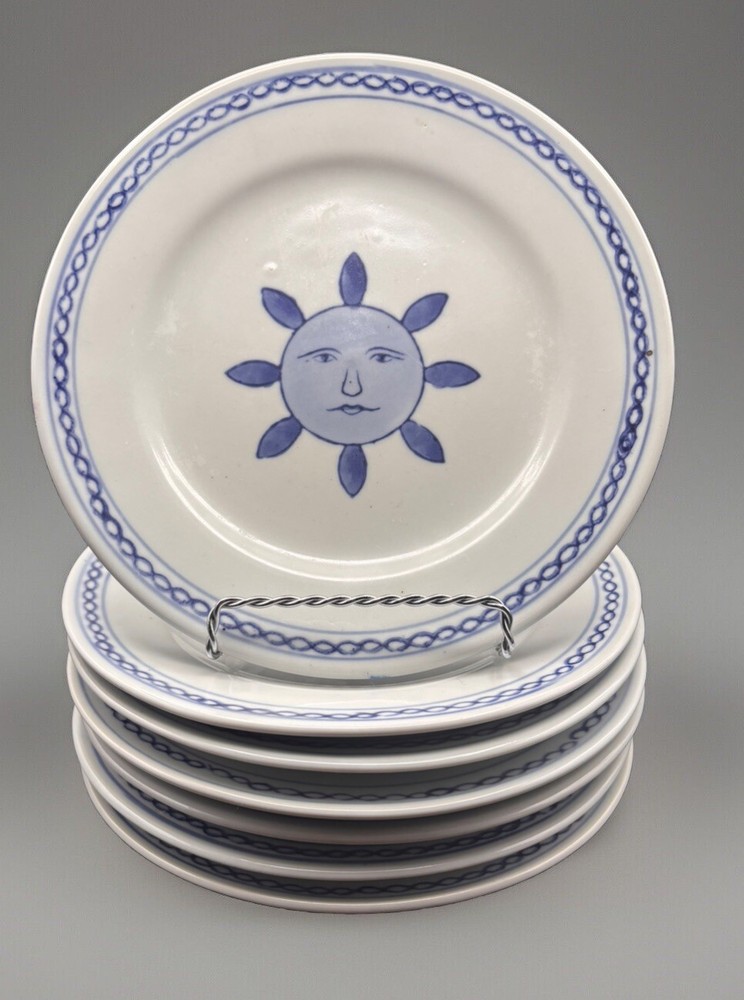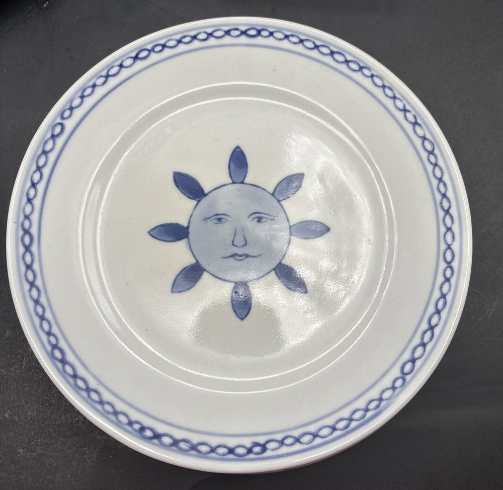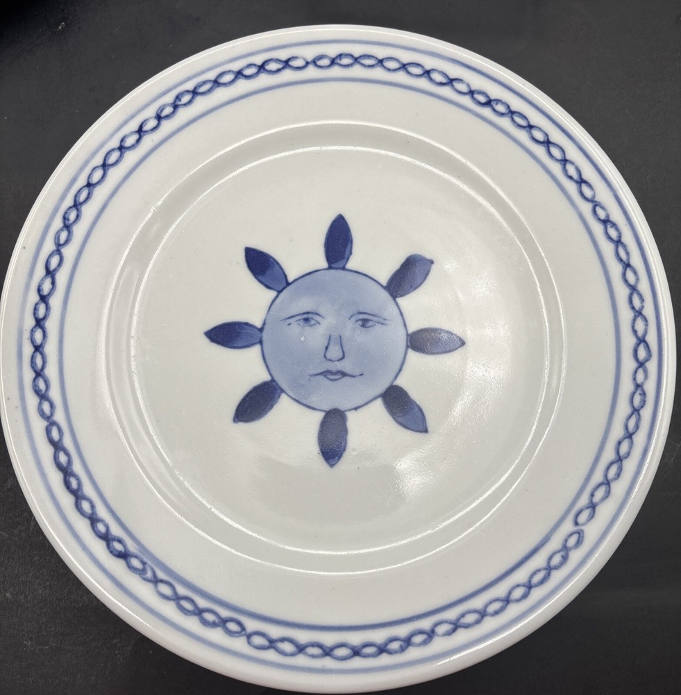 Each handpainted plate has its own little personality, so I have photographed the faces individually. Retired Pier 1 Imports plates, 8 inches in diameter, with the sun, or possibly a flower, giving you a nice serious look instead of a grin. Very refreshing and original. Every plate is in excellent condition without chips, cracks, or crazing. The Pier 1 English-language backstamp ihas been consciously done in a Chinese style, with the lines of the letters overlapping to make crisscross designs. The plates weigh over a pound each. This set will be packed and shipped with great care.