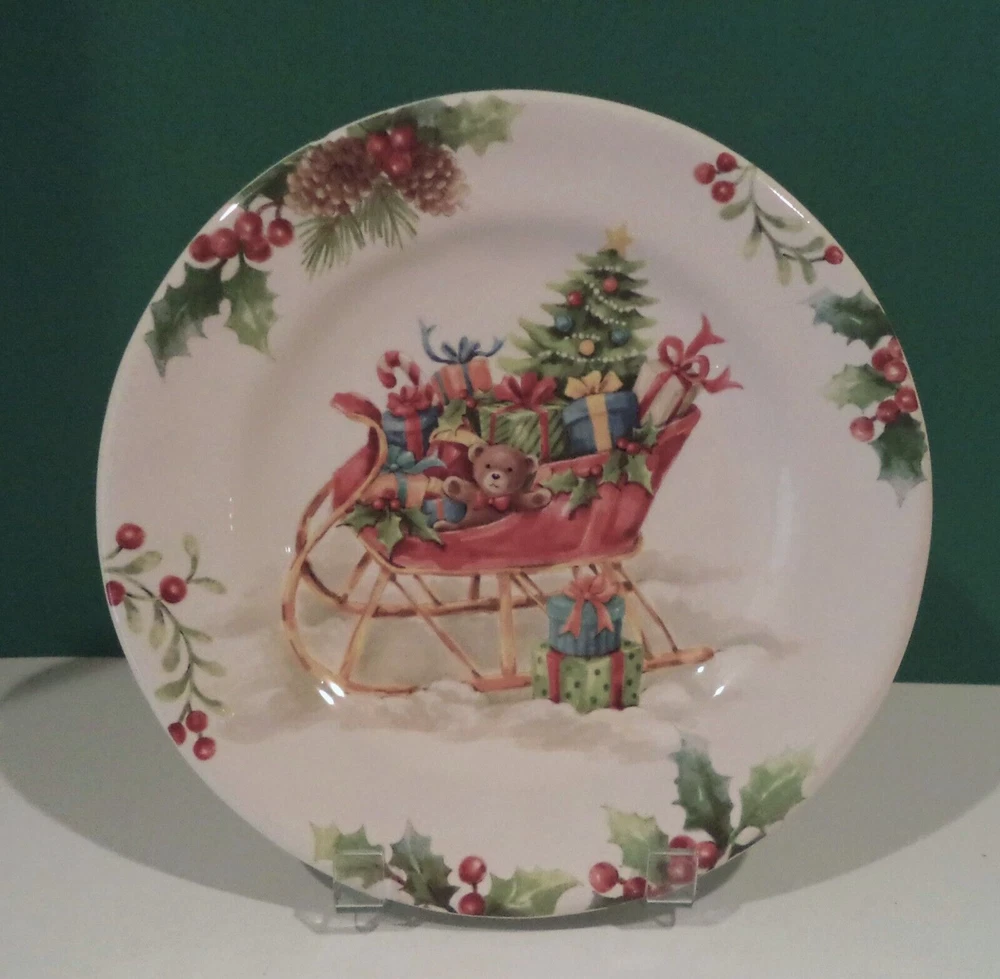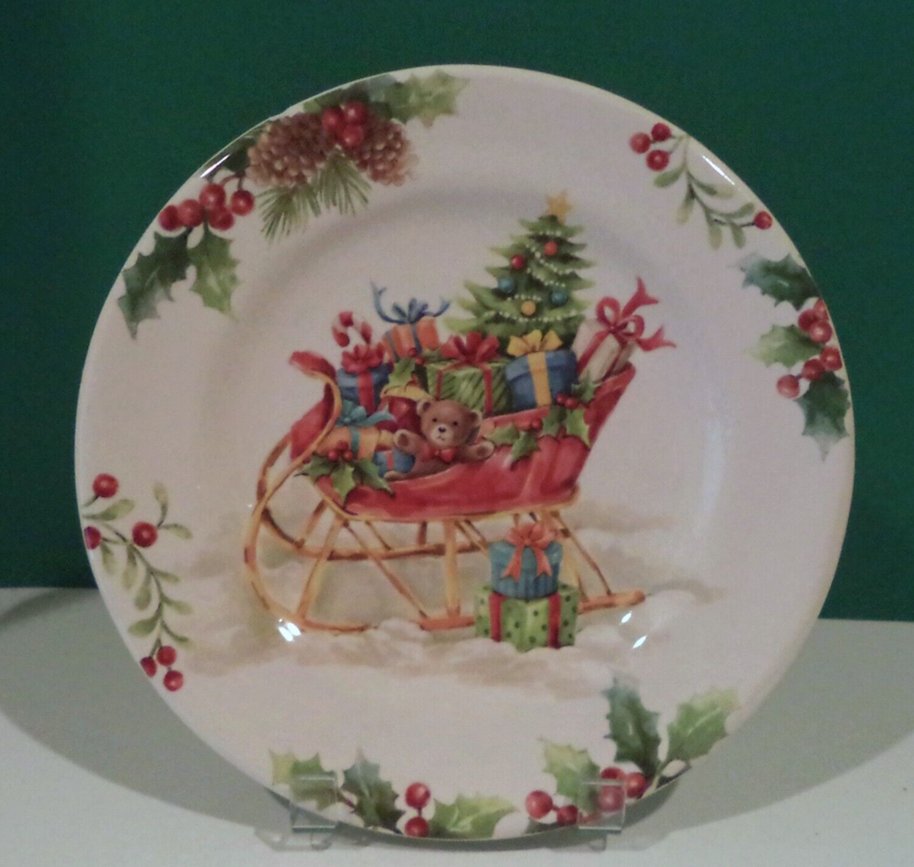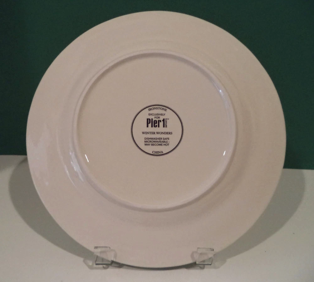 This beautiful 8 1/2" salad plate from Pier 1 Imports features a winter wonderland theme with a Christmas sleigh, bear, and gifts. The plate is made of durable and dishwasher safe ironstone and stoneware materials, making it perfect for everyday use or special occasions. The plate is microwave safe and measures 8 1/2" in diameter. It is an original piece from the Winter Wonders product line and was manufactured in China using pottery techniques. The stand is not included. The retired plate is in excellent condition, no cracks or crazing. It has a printed back stamp and is perfect for adults, teens or just to display!. THANKS FOR LOOKING AND PLEASE CHECK OUT MY OTHER TREASURES!!