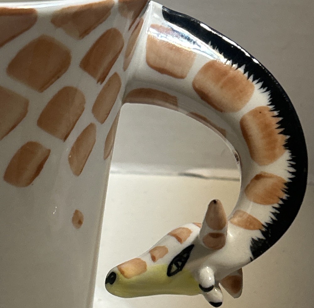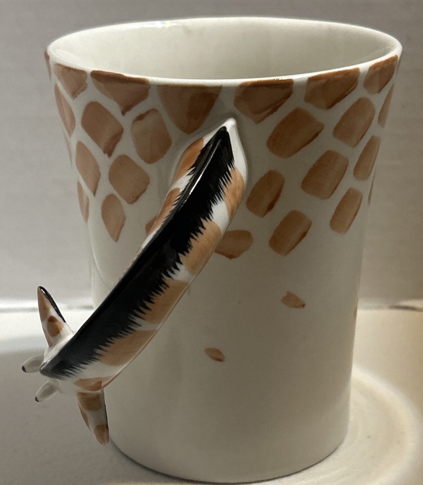 This Pier 1 Imports coffee mug features a large size with a capacity of 16oz and a unique 3D hand-painted giraffe head design on the front. The mug is round in shape and beige in color, with an abstract animal print pattern. It is made of ceramic & porcelain material, manufactured in 2018 in China. This unisex adults' mug is suitable for hot or cold beverages and can be machine washed up to 85°F. Perfect for animal lovers or collectors of unique mugs, this item is a standout piece for enjoying your favorite drink.