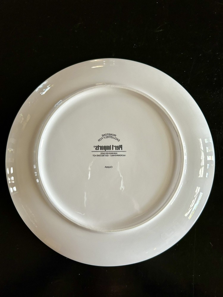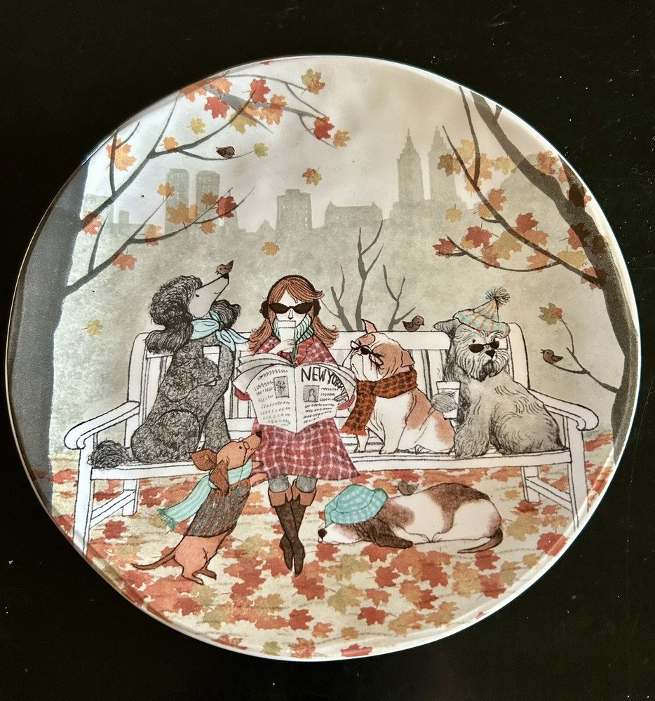 An adorable plate with an autumn theme, lady on a park bench with five dogs around her. A large poodle is the dominant dog on her right side. A City skyline is behind them with little brown birds in the trees and on the poodles nose. In excellent condition. The measurement is 8 3/4” across. A fun plate to display or to use. You are buying one plate. I have a few others available if you would like to purchase more than one. *Cost of shipping will be adjusted accordingly. See Photos. On this plate shown, the Pier 1 logo on the backside is backwards. The others are normal.
