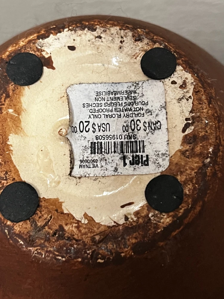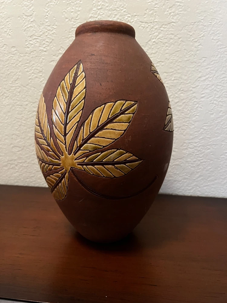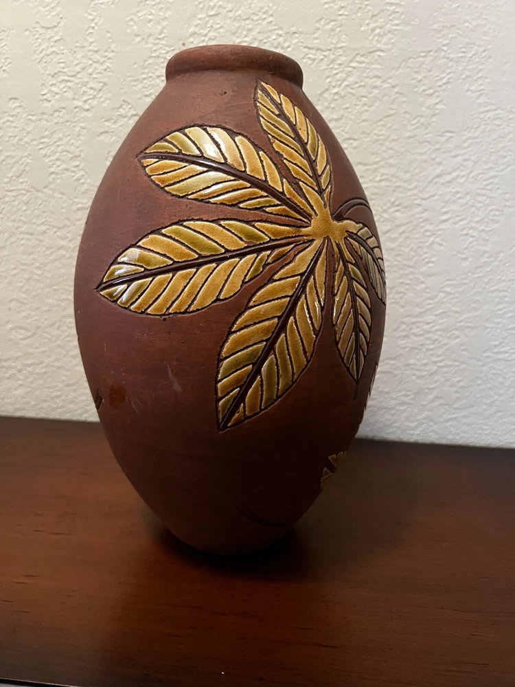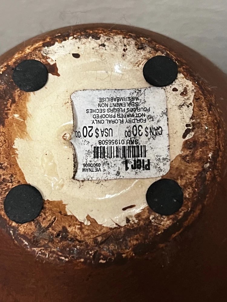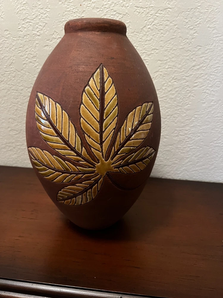 PIER ONE BROWN VASE - CERAMIC LEAF DESIGN - HAND CRAFTED - LARGE - VINTAGE Vintage Large Pottery Leaf Vase / Glazed / St ands 12 1/2 Beautiful large pottery vase by Pier One Imports. The leaves are highly glazed giving it an enamel glow. It stands 12 1/2 inches tall with the opening a diameter of 2 inches. Perfect for home decor or a touch of vintage class on the patio or pool side. Please see some of the images for some markings on the vase.