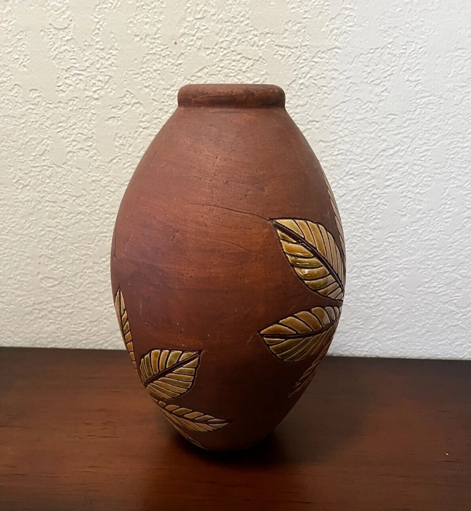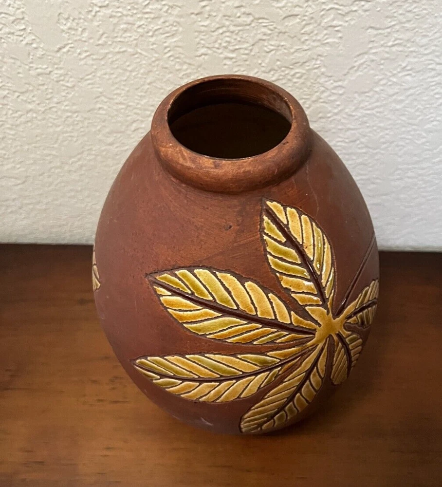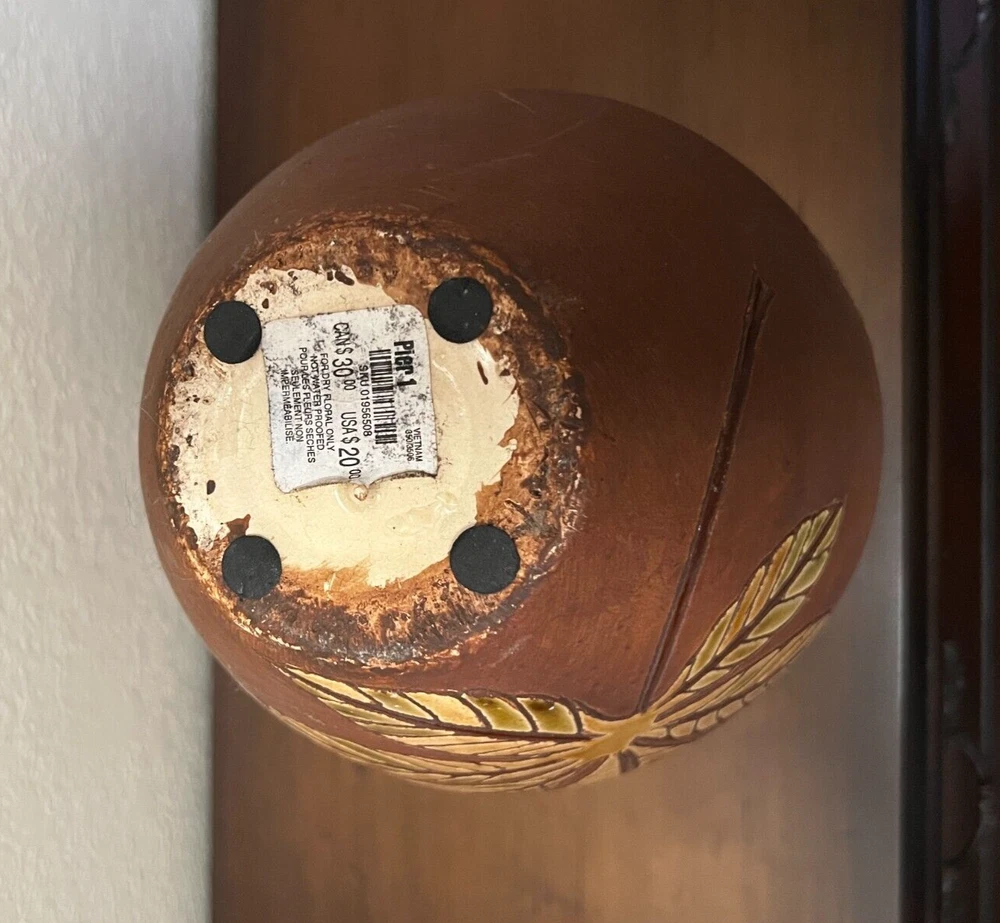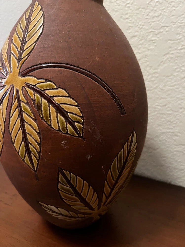 PIER ONE BROWN VASE - CERAMIC LEAF DESIGN - HAND CRAFTED - LARGE - VINTAGE Vintage Large Pottery Leaf Vase / Glazed / St ands 12 1/2 Beautiful large pottery vase by Pier One Imports. The leaves are highly glazed giving it an enamel glow. It stands 12 1/2 inches tall with the opening a diameter of 2 inches. Perfect for home decor or a touch of vintage class on the patio or pool side. Please see some of the images for some markings on the vase.