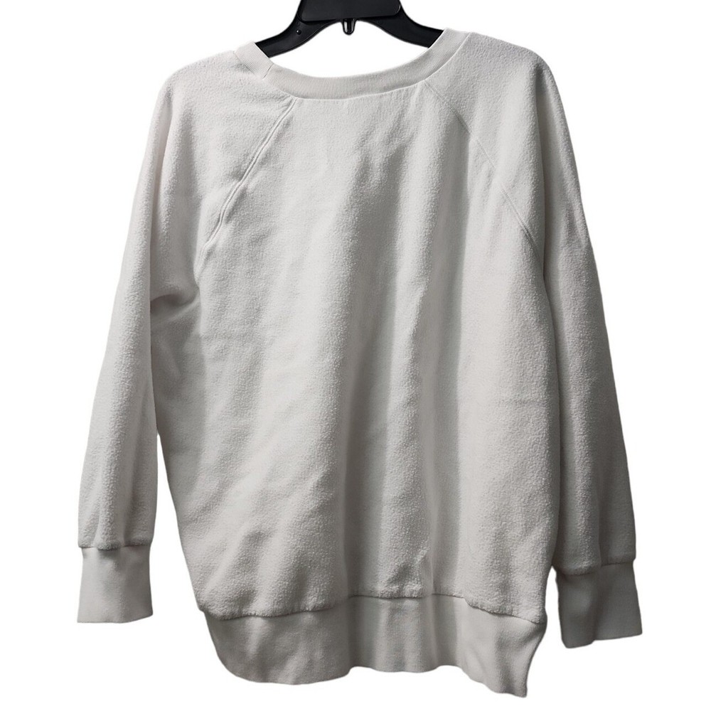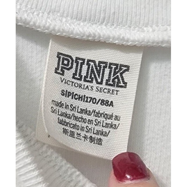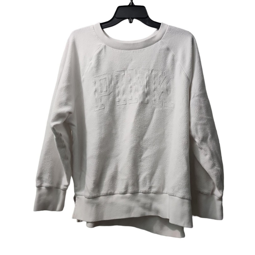 Cozy and stylish, this PINK pullover sweatshirt offers a blend of comfort and casual style. The tunic-length design provides extra coverage and a relaxed fit, perfect for layering or wearing on its own. Featuring an embossed PINK logo, this sweatshirt adds a touch of brand recognition without being overly flashy. The soft fabric ensures all-day comfort, making it ideal for lounging at home, running errands, or meeting friends for a casual outing. 23 inches pit to pit 24 inches in length Shirt has a couple of small stains on front. Keywords: PINK sweatshirt, pullover sweatshirt, tunic top, white sweatshirt, embossed logo, casual sweatshirt, comfortable sweatshirt, loungewear, women's sweatshirt, long sleeve sweatshirt, relaxed fit, crewneck sweatshirt