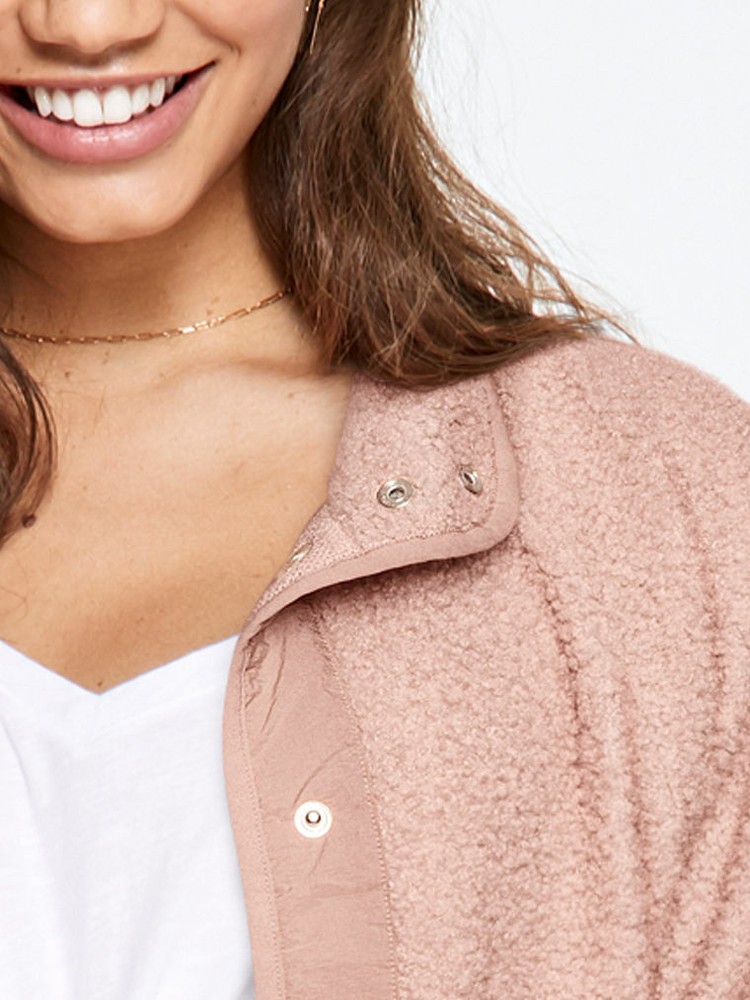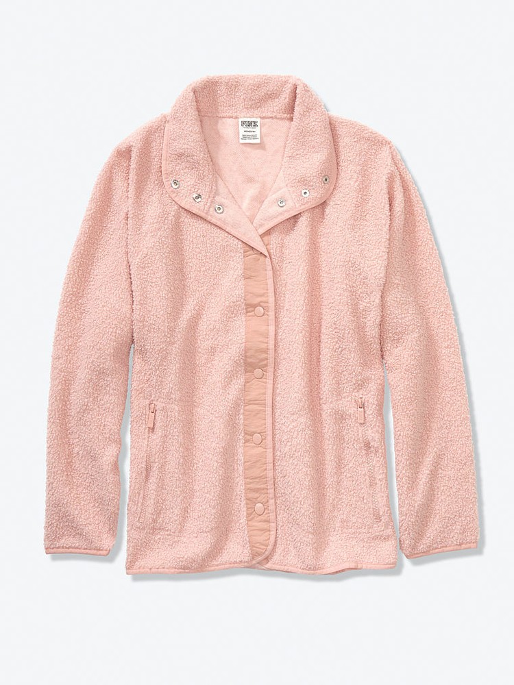 VICTORIA'S SECRET PINK COZY SNAP JACKET Relaxed fit Cozy & taffeta fabric Mock neckline Snap front closure Zipper pockets Imported polyester Color: misty rose Size: M Some items might have a black line on the tag or on the inside band. VS tag has been removed to prevent store returns, size and care label remains. All items are shipped in poly envelopes and bras may get wrinkled in shipping but are removed when washed.