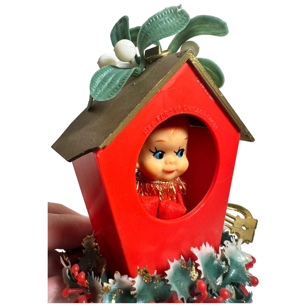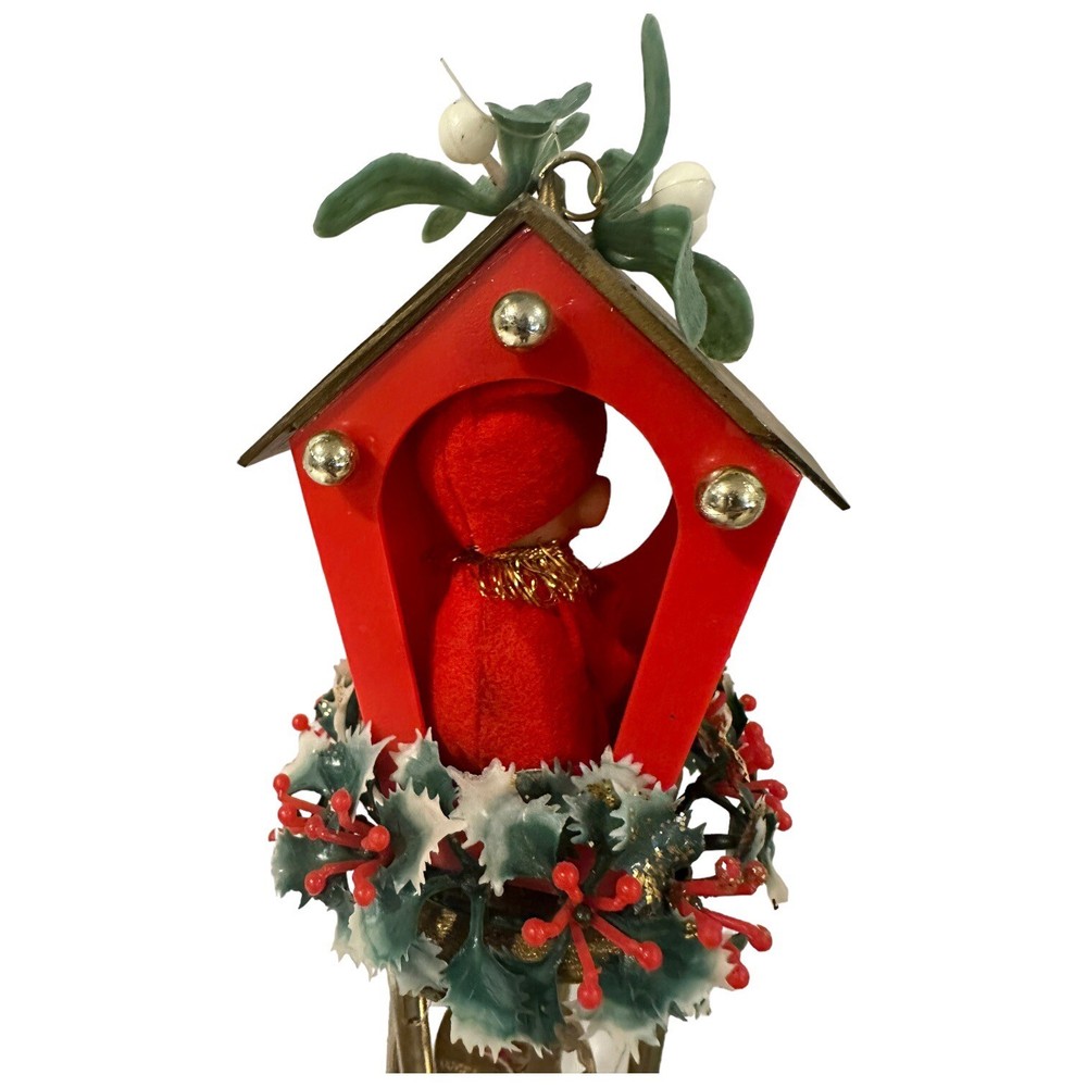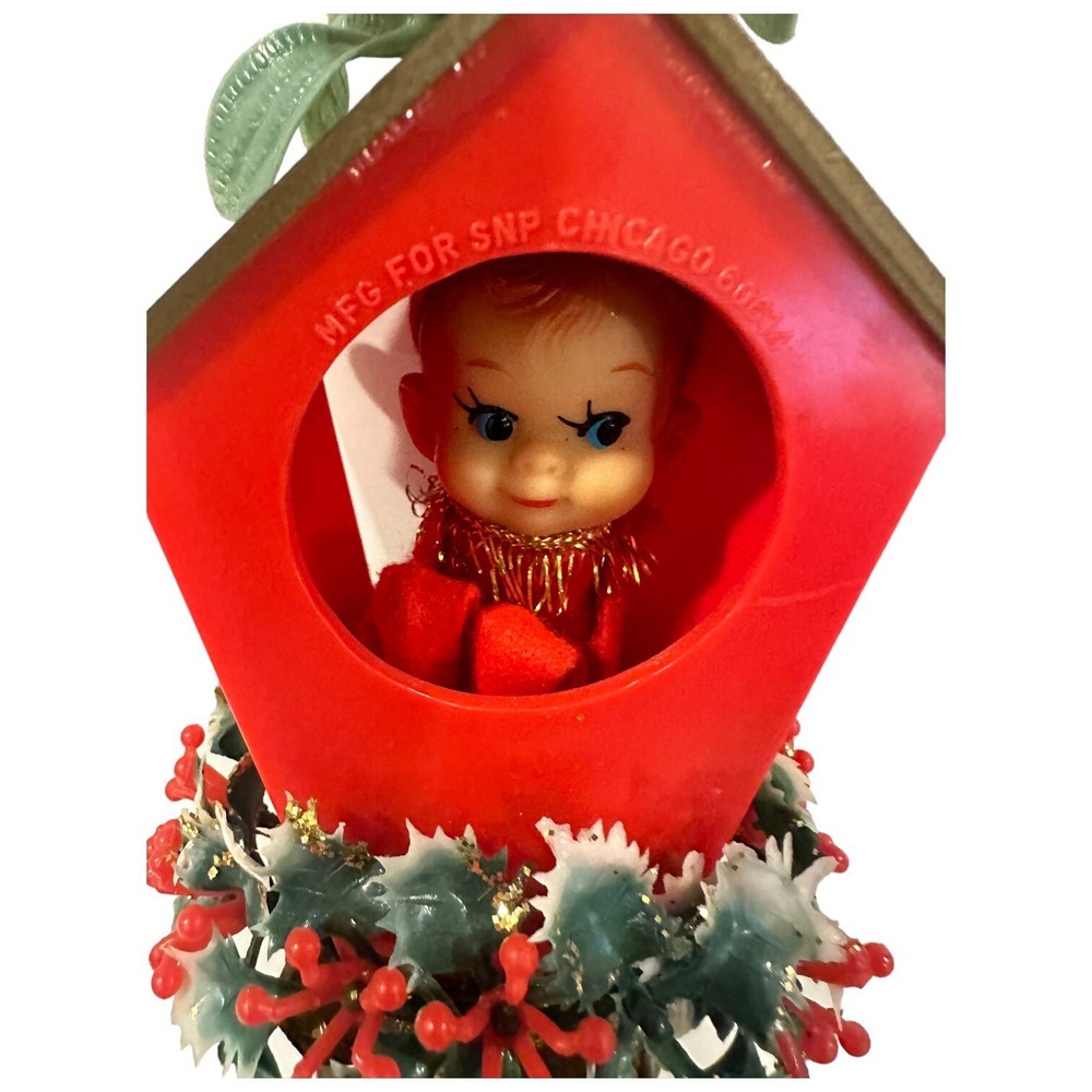 Vintage Christmas Elf KNEE HUGGER Pixie Wind Chime Soft Plastic Made Hong 14" Plastic Greenery Wool Felt Body and plastic face NOTE the roof has chips in the fiber board (the roof is not a plastic) Ch...