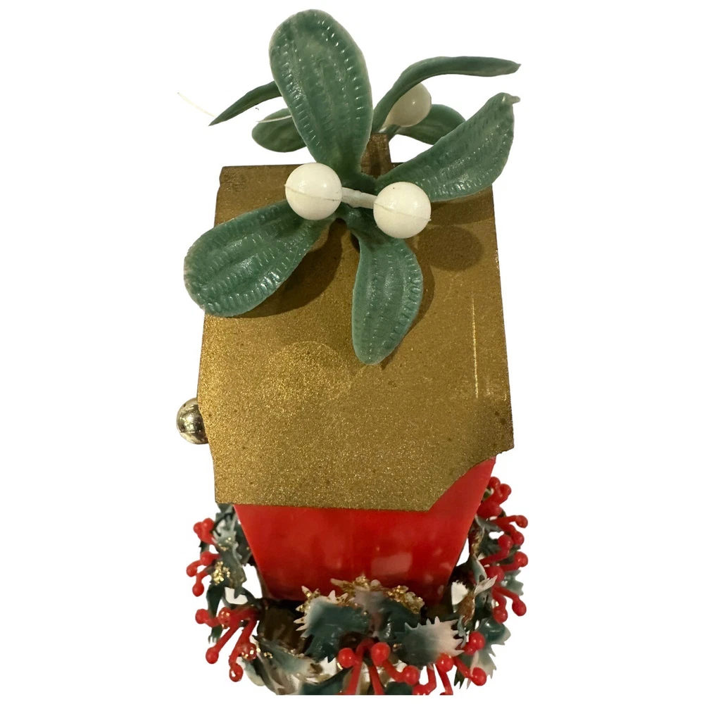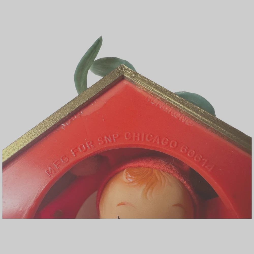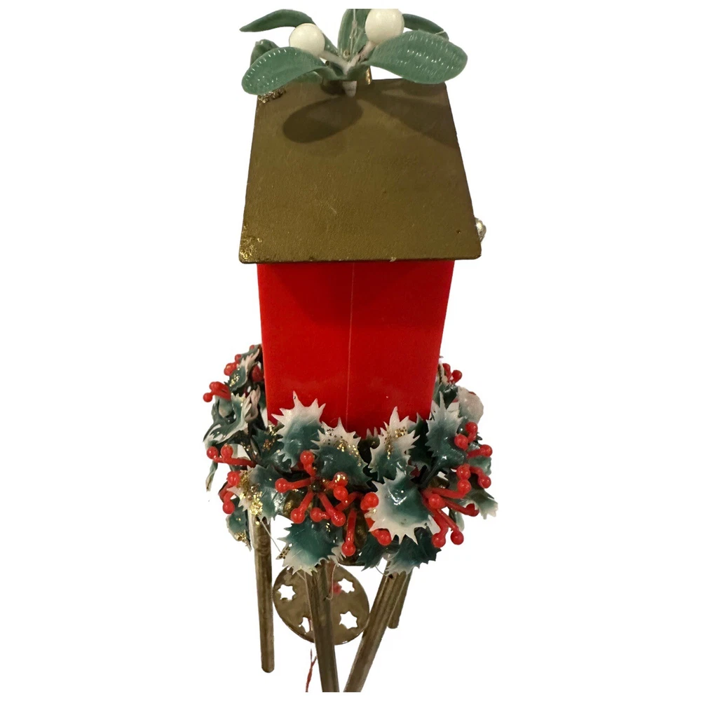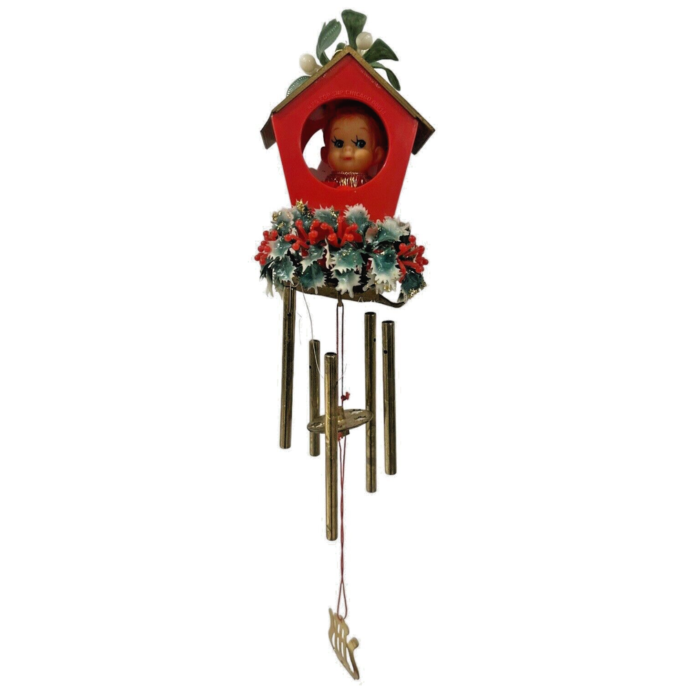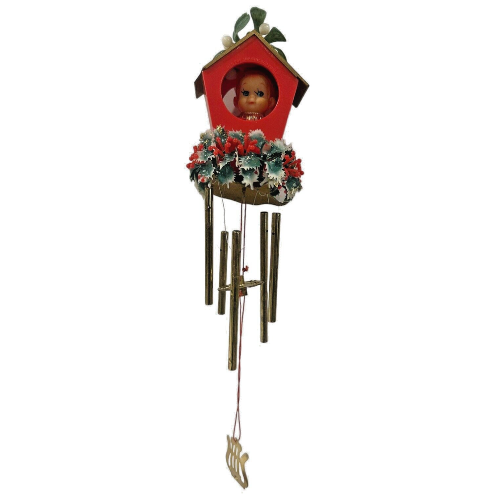 Vintage Christmas Elf KNEE HUGGER Pixie Wind Chime Soft Plastic Made Hong 14" Plastic Greenery Wool Felt Body and plastic face NOTE the roof has chips in the fiber board (the roof is not a plastic) Chimes are a metal.
