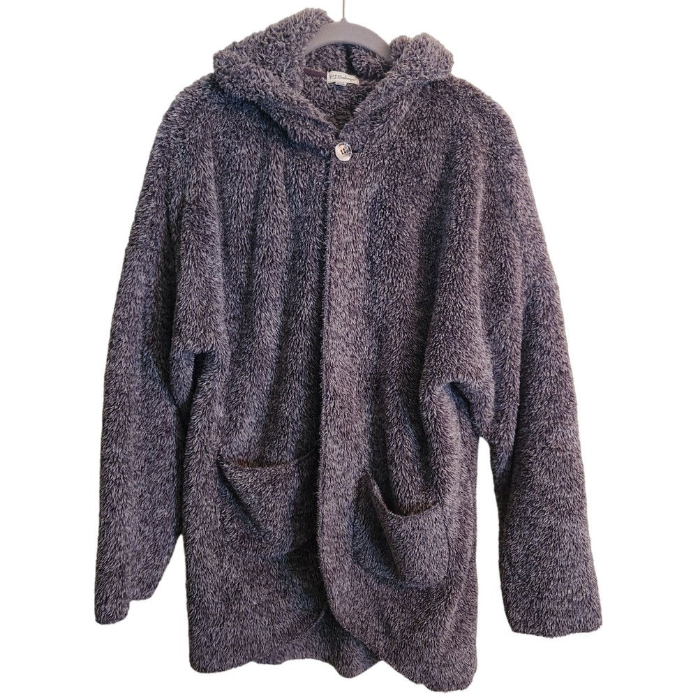 Stay cozy in this PJ Salvage Gray Hooded Fluffy Cardigan, With its plush material and comfortable hood, it's the perfect piece for cool weather. The black/gray color makes it easy to pair with any outfit, One Button Closure, Patch Pockets, Rounded Hem, Retail $135 • PJ Salvage Cozy Cardigan • Features a comfortable hood • Ideal for cool weather • Easy to pair with any outfit • Gray color Pit to pit 25" Shoulder to hem 32" Features: • Cozy Size: Womens L Condition: Pre-Owned Good