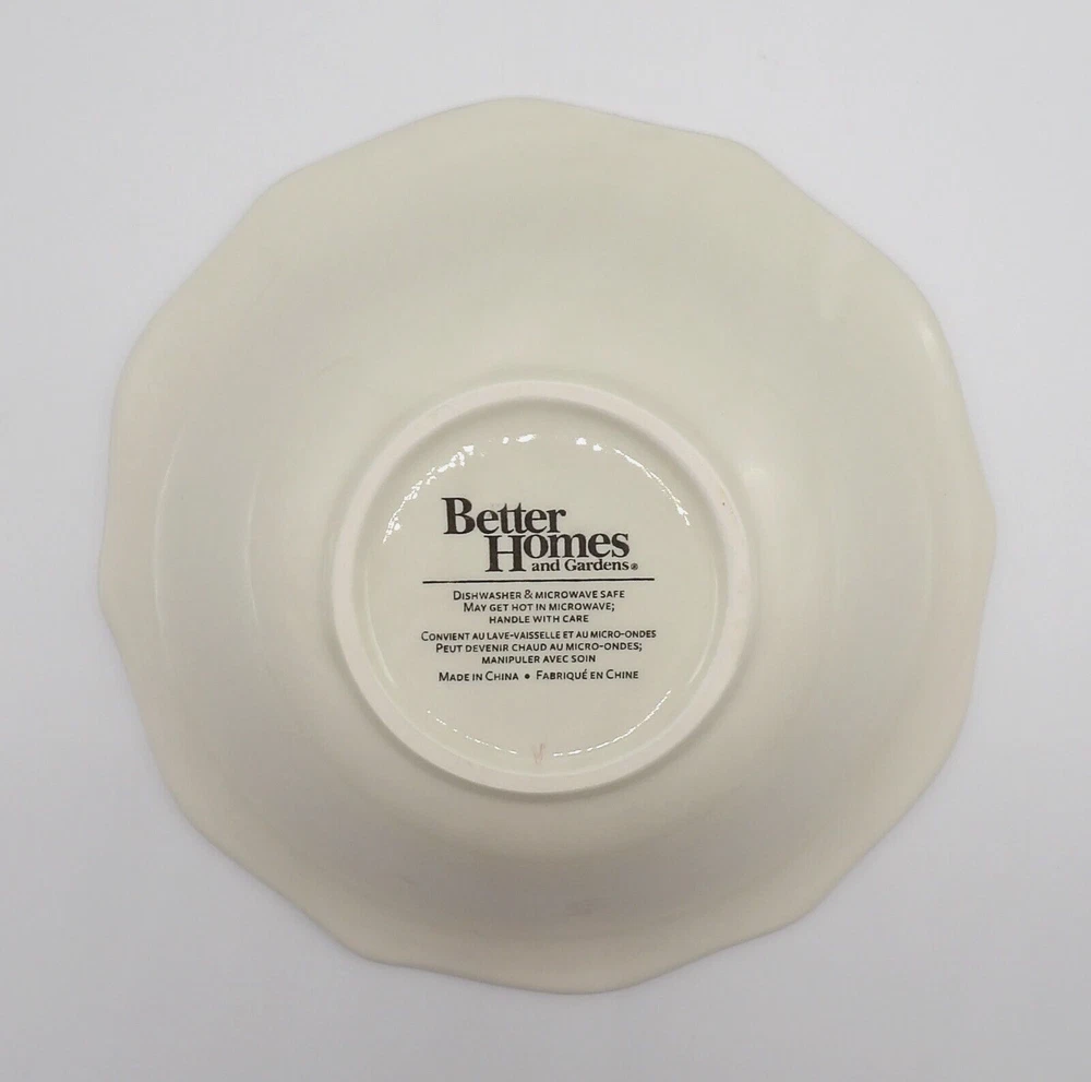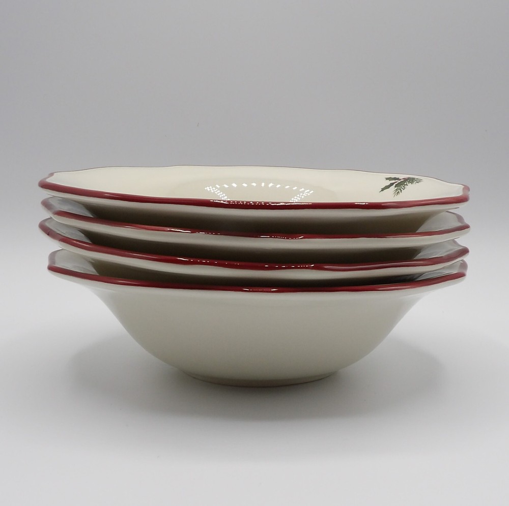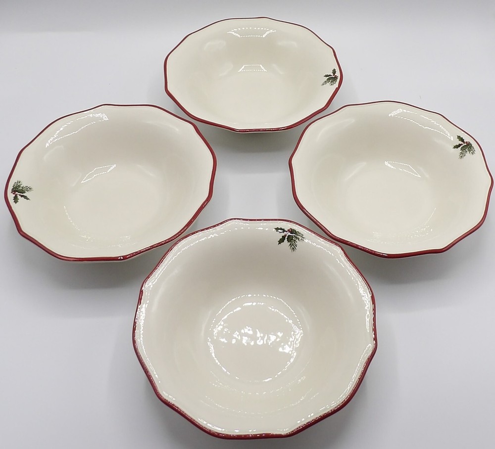 POINSETTIA BY BETTER HOMES AND GARDENS SOUP/CEREAL BOWLS SET OF 4 MINT · Brand: Homes and Gardens · Pattern: Poinsettia · Type: Soup/Cereal Bowls · Features: Scalloped Edge, Red Trim · Material: Ceramic · Status: 7 1/2”W x 2 1/8”H · Status: Discontinued. Circa: 2009 – 2010 I strive to describe every item listed with complete accuracy. Please review the photographs carefully as they comprise a major part of the description. Feel free to contact me with any questions or concerns before bidding or purchasing the item. Thanks for stopping! Come back for more great items!