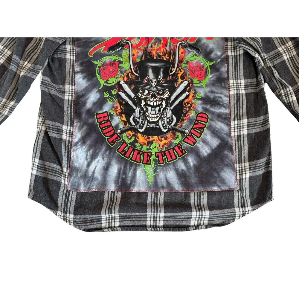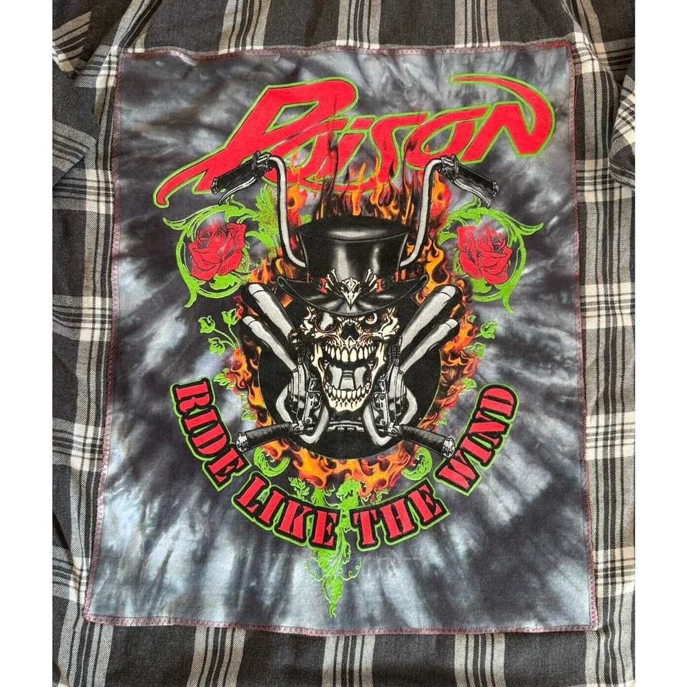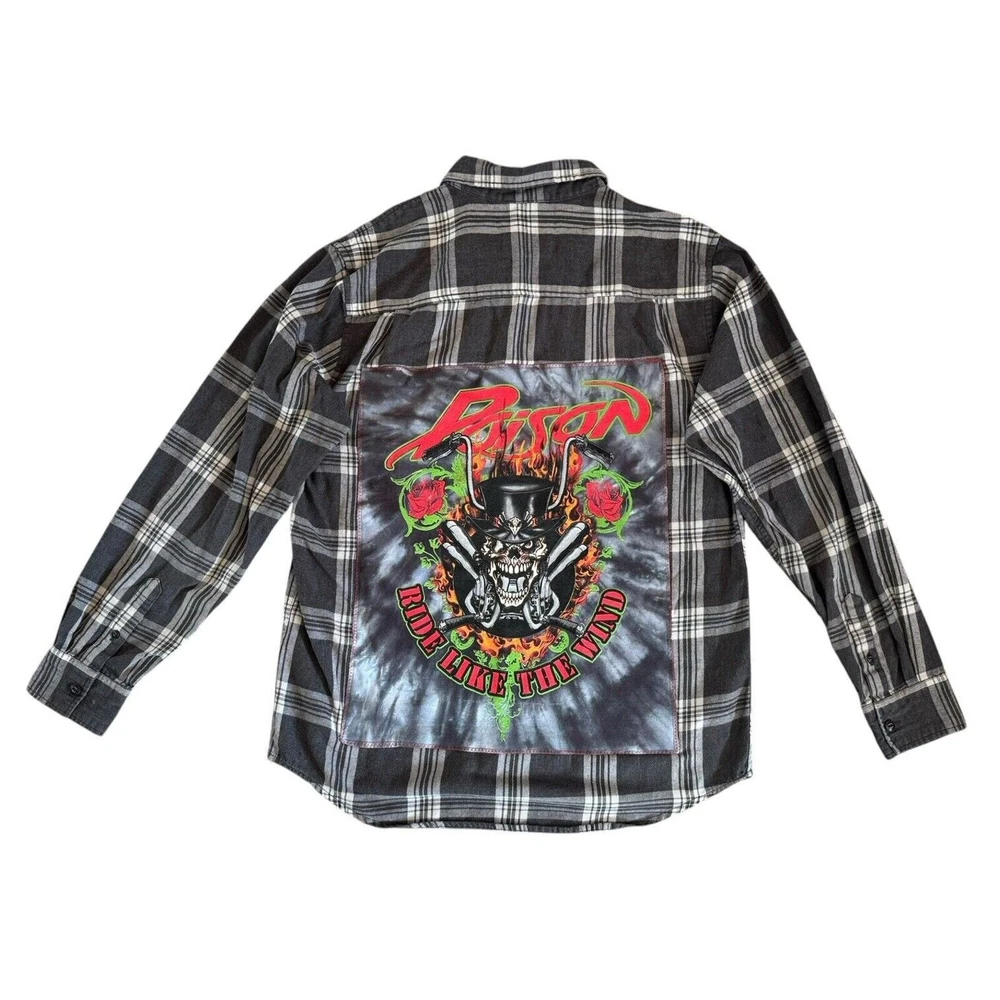 <![CDATA[<div>POISON Ride Like The Wind Upcycled Grunge Flannel Shirt 80s Retro Vintage Size Medium MINT CONDITION! Custom made!! Model is 5'7” and normally wears a size M. Lying flat Shoulder 17.5” Chest 22” Bottom hem 21.5” Front height shoulder to hem 27” Back middle height 30.5” Sleeve 19” Cuff 4” I make MANY upcycled retro vintage band patch flannel shirts and denim jackets! See my listings or message me for details and best price! casual, relaxed, cozy, effortless, surf, skater, beach, retro, vintage, grunge, alternative, classic, simple, versatile, poison, rock, heavy metal, 80s, 90s, rock and roll, concert, band, festival, music, trendy, urban, edgy