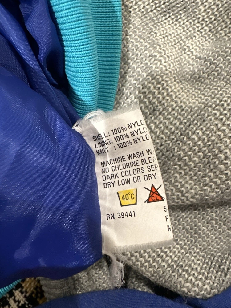 This Pacific Trail Women's Jacket is a vintage 80's or 90's windbreaker in size Large, made of nylon with a rayon fabric lining. Featuring a stand-up collar, it has a full zip and button closure, with accents of buttons, a strap, and zipper. The jacket is insulated, water-resistant, wind-resistant, and lightweight, suitable for all seasons. With a mid-length and elastic waist, this jacket is perfect for travel and offers a stylish yet functional design for women who appreciate retro fashion. Right arm has a few black marks on it.