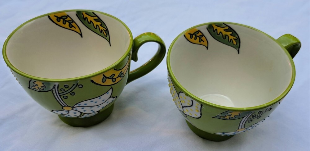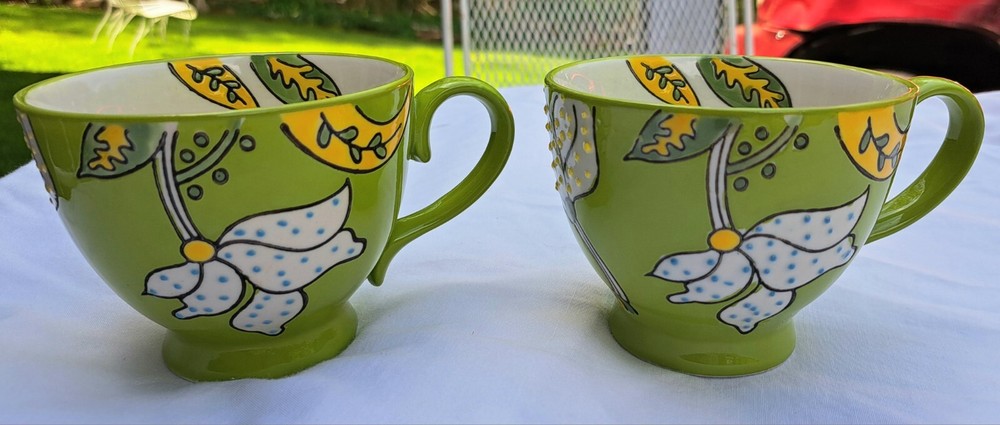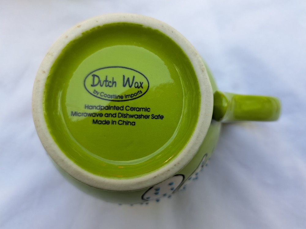 You get the 2 mugs shown. They measure about 3 1/2" tall and 4 1/2" across the top. Hand painted Dutch Wax by Coastline Imports. These may have never been used, but, I can't know for sure. No chips, cracks, or crazing. Please see the pictures and ask any necessary questions.