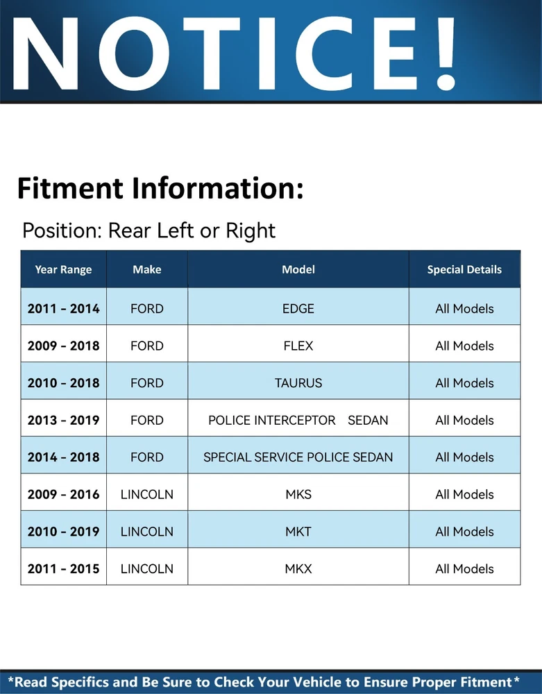 Warranty Details Click here for Warranty Details Questions? Call us! Monday-Friday 8am – 6pm ET Saturday 8am - 4pm ET Set (2) Rear Wheel Hub and Bearing Assembly Fits Driver and Passenger Sides Kit Includes: 2x Rear Wheel Hub and Bearing Assembly - 513275 Hub Specifications Position: Rear Left and Right Lugs: 5-Bolt ABS on Hub: Encoder Flange Type: 4-Bolt Square FITS: MAKE MODEL YEAR RANGE SPECIFIC DETAILS FORD EDGE 2011 - 2014 All Models FORD FLEX 2009 - 2018 All Models FORD TAURUS 2010 - 2018 All Models FORD POLICE INTERCEPTOR SEDAN 2013 - 2019 All Models FORD SPECIAL SERVICE POLICE SEDAN 2014 - 2018 All Models LINCOLN MKS 2009 - 2016 All Models LINCOLN MKT 2010 - 2019 All Models LINCOLN MKX 2011 - 2015 All Models Not what you were looking for? Search our Store Page to find the right part! Brand Information Detroit Axle offers parts and accessories for the perfect combination of quality and value. Detroit Axle offers cost-conscious customers a full range of parts to a broad range of application. Provides extensive coverage of bearings for a broad range of automotive and heavy-duty 4x4 wheel applications. Manufactured in ISO 9000 / ISO 9001 / ISO 9002 certified facilities gives the fit, performance Reliability and durability of OE. Detroit Axle offers an extensive lineup of Wheel Bearings, CV Axles, Power & Manual Steering Rack & Pinions, Gear Boxes, Ready Struts, Drive Shafts, Prop Shafts and much more. Manufacturer Information Detroit Axle offers an extensive coverage of bearings for a large range of automotive and heavy-duty wheel end applications. Our Products are manufactured in ISO 9000 / 9001 / 9002 certified facilities. Detroit Axle products delivers the look, feel, fit and performance of OE. Manufactured with Internal bearing seals that are specifically designed to combat all types of road conditions to keep debris out and keep the bearing turning. With am OE design, simple installation and and long life as a guarantee Payment Paypal, Visa, and MasterCard are the accepted forms of payment. Please use the eBay checkout system when paying for your order. Immediate payment is required for all orders. Shipping All orders placed before 2pm (Eastern Standard) will be shipped the same business day. Orders made after 2pm (Eastern Standard) will be shipped the following business day. All orders in the continental 48 States will be shipped FREE of charge via FedEx or USPS at our discretion. Orders outside the continental 48 States (Alaska, Hawaii, Puerto Rico, US territories, or International) will be required to pay a surcharge for shipping. International orders will be shipped via USPS Priority Mail International. Return Policy Customer must contact Detroit Axle within 30 days of receiving shipment for approval of any return or exchange. Returns or exchanges will be subject to a 15% restocking fee of the original item purchased plus cost of return shipping and replacement shipping. Exchanges due to shipping errors by Detroit Axle will not be subject to a restocking fee or shipping charges. Track Page Views With Auctiva's FREE Counter