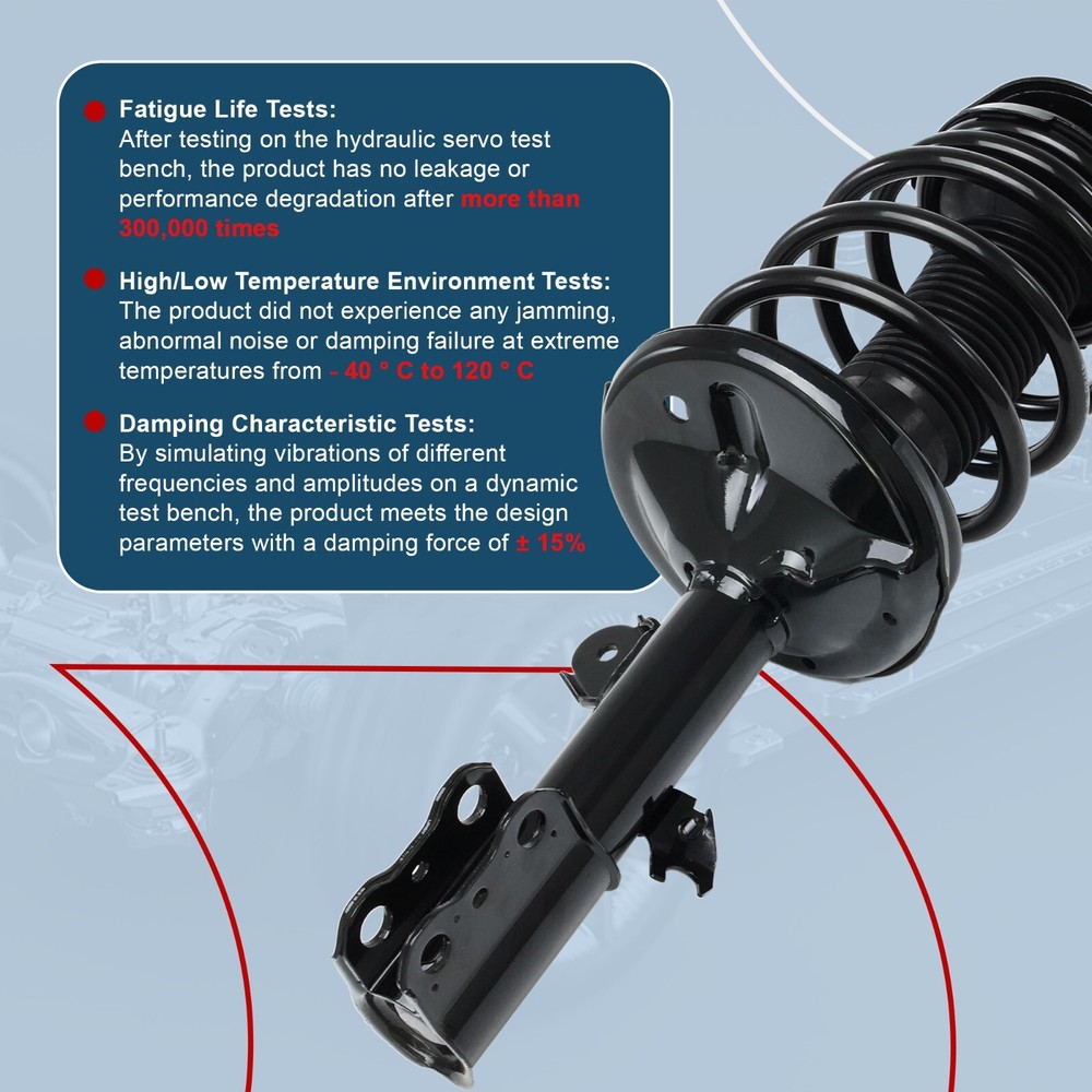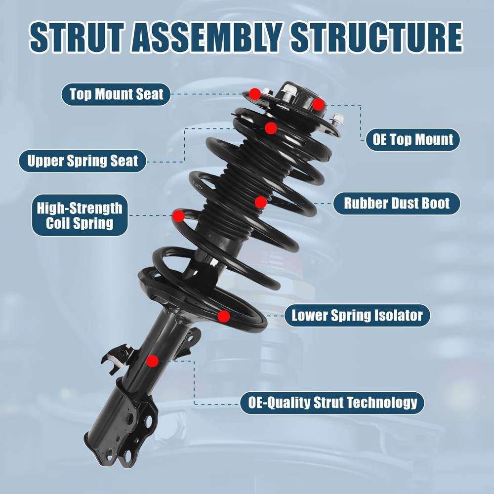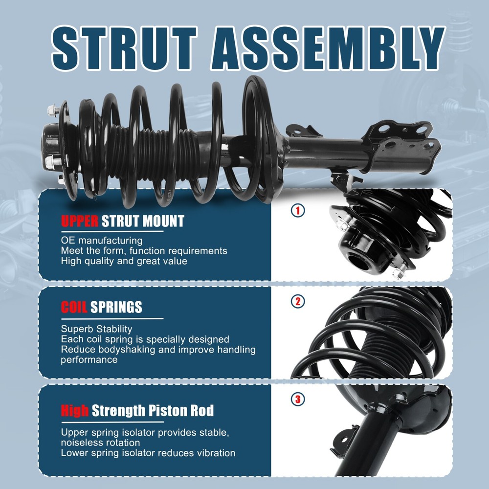 FITMENT 1998 - 2003 TOYOTA SIENNA 7 PASSENGER; EXC. 8 PASSENGER, COMMERCIAL & HANDYVAN; Built Before 12/2002 FEATURE QUICKER, SAFER, EASIER AND COMPLETE REPAIR -- Includes everything you need for strut replacement in a single, fully assembled unit with no need for a spring compressor RESTORES RIDE HEIGHT -- Precisely calibrated to meet the OE design, each application-specific coil spring type is engineered to restore ride height and support the vehicle’s weight VEHICLE-SPECIFIC DESIGN -- Application-specific coil spring, mount and strut designs ensure optimized ride and handling experience unique to each vehicle profile OE QUALITY -- Preassembled upper strut mount, coil spring, and strut feature an OE-style design for seamless fit, form, and function MAINTAINS VEHICLE CONTROL -- Reduces body sway, vibration and road harshness before it reaches the passenger cabin for improved vehicle handling RUST RESISTANCE -- Protective coating resists rust and corrosion while salt spray testing ensures it’s ready for the elements BUY WITH CONFIDENCE -Offers 30-day returns and 24-hour customer service
