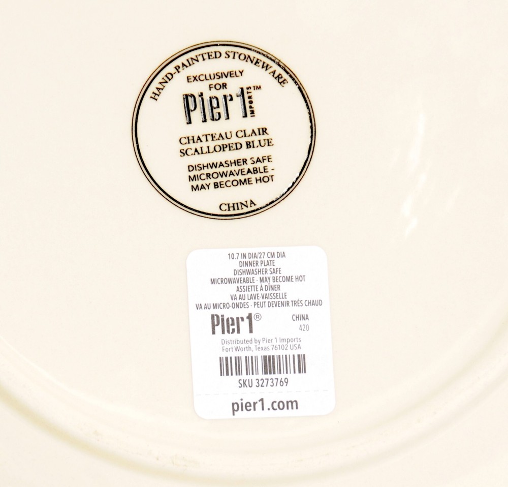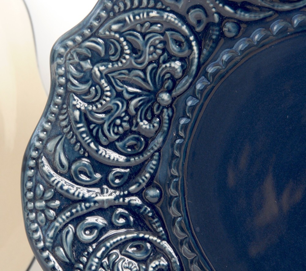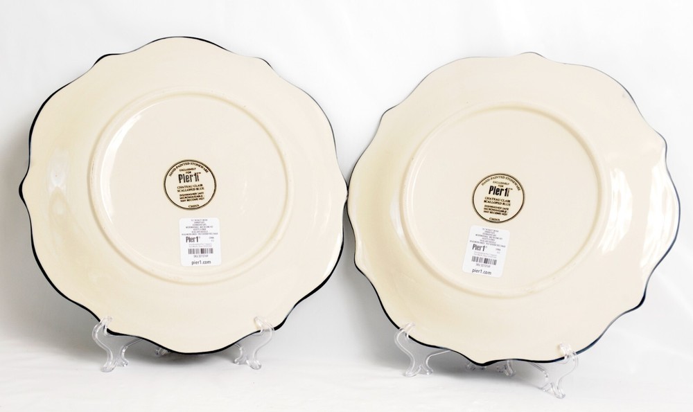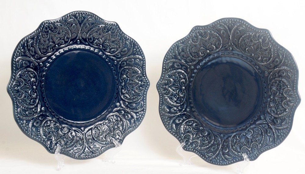 This is a pair of dinner plates from Pier 1's Chateau Clair Indigo line. The plates feature an elaborate embossed lace border and a scalloped rim. Each plate measures 11 inches in diameter. Previously owned items are sold "as is". These, plates appear to have not been used as the original stickers remain intact on the bottom.