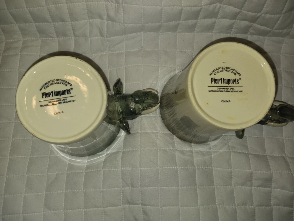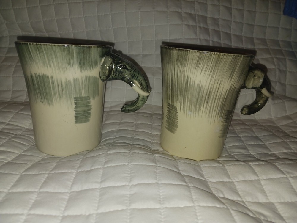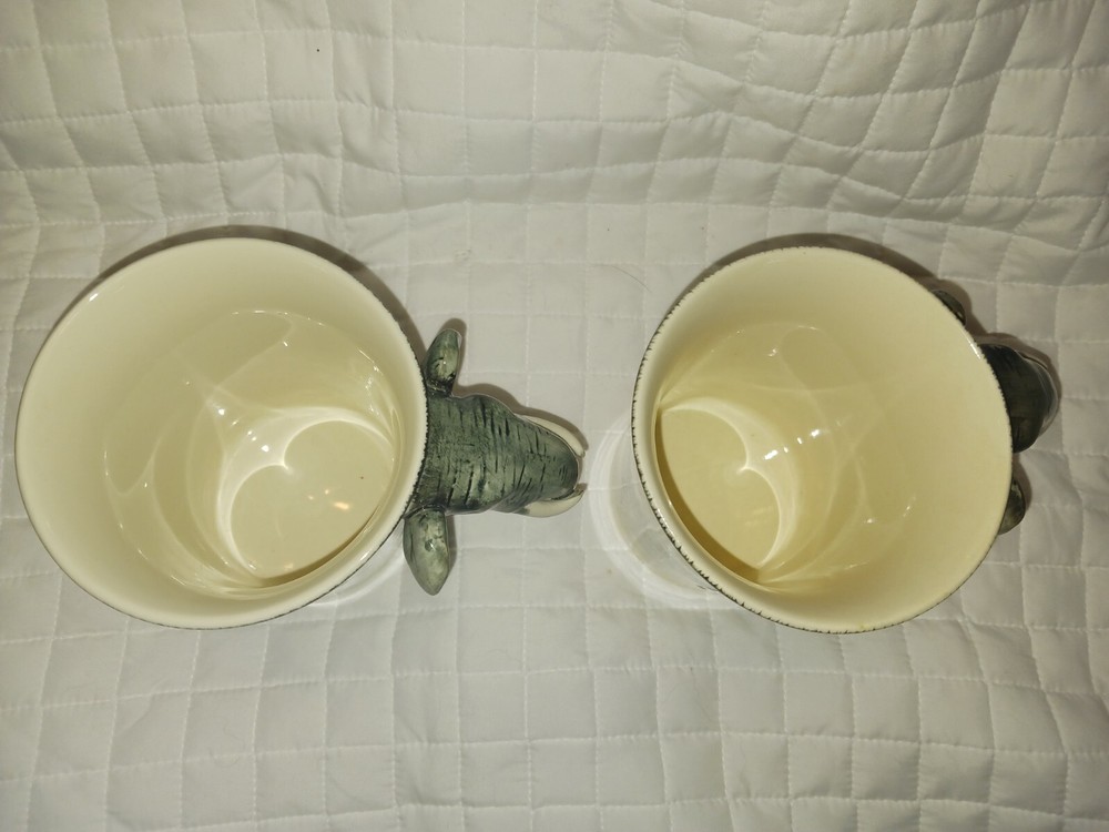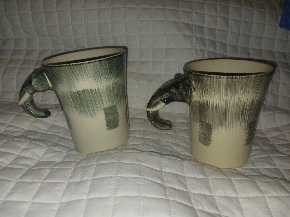 This unique pair of mugs features a charming elephant design with a trunk for a handle. The hand-painted stoneware material makes them a perfect addition to any contemporary style kitchen. These mugs are perfect for hot or cold beverages and are suitable for all occasions. The set includes two mugs with a large size of 5 inches in height and 6 inches in width. They are microwave and dishwasher safe, and come with a handle for easy grip. The gray color and animal print pattern add a touch of playfulness to your collection. These mugs are original and not a licensed reproduction, and were manufactured in China in 2020.