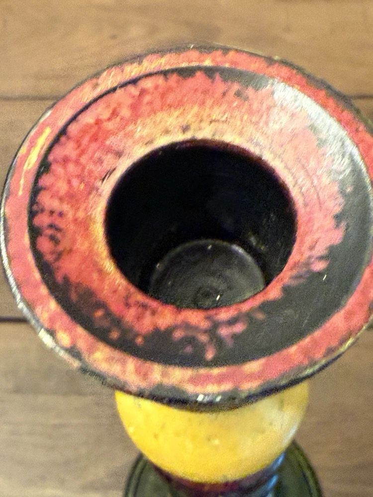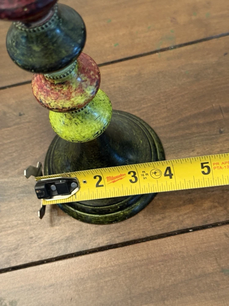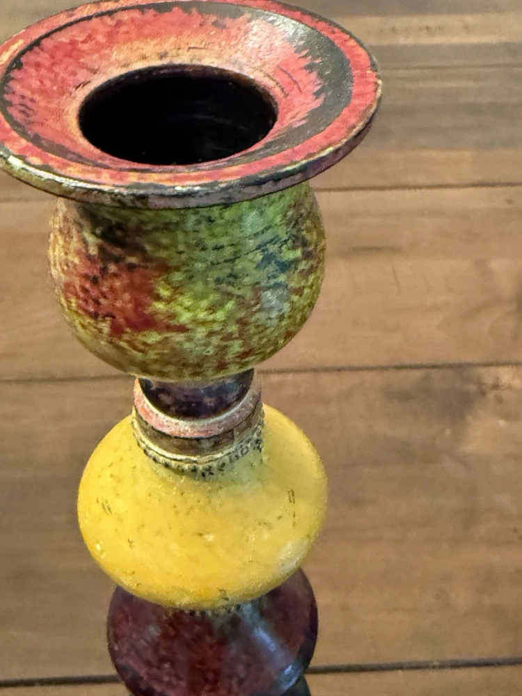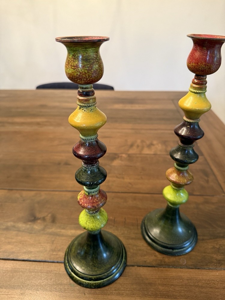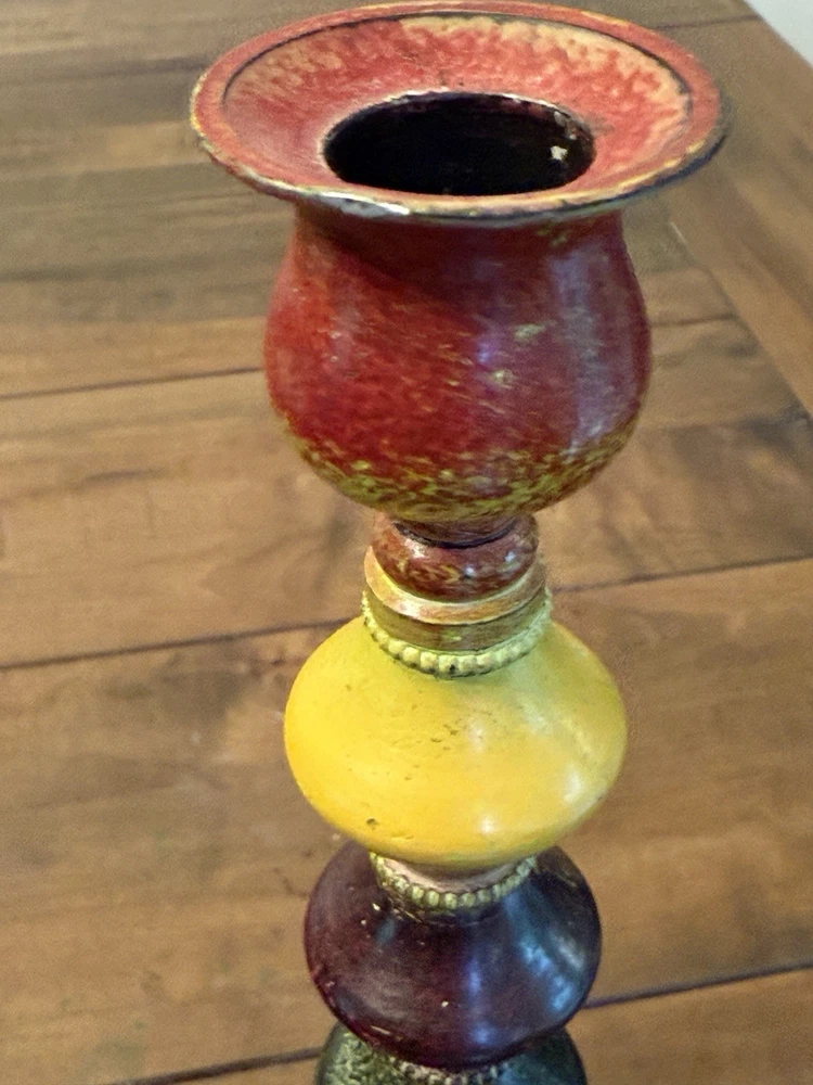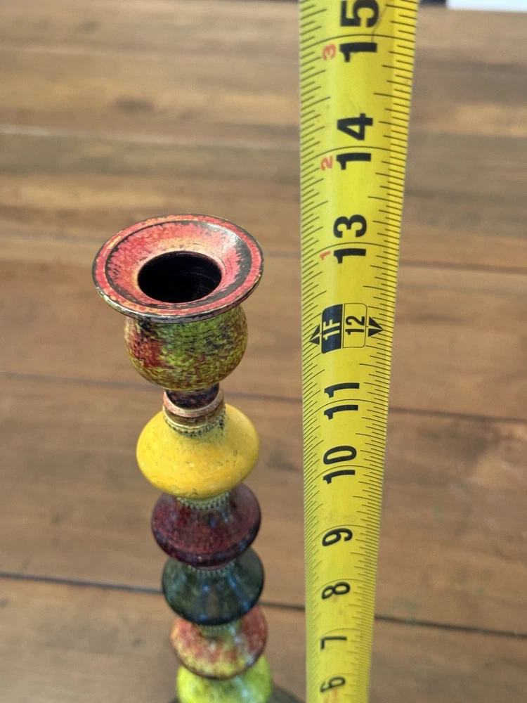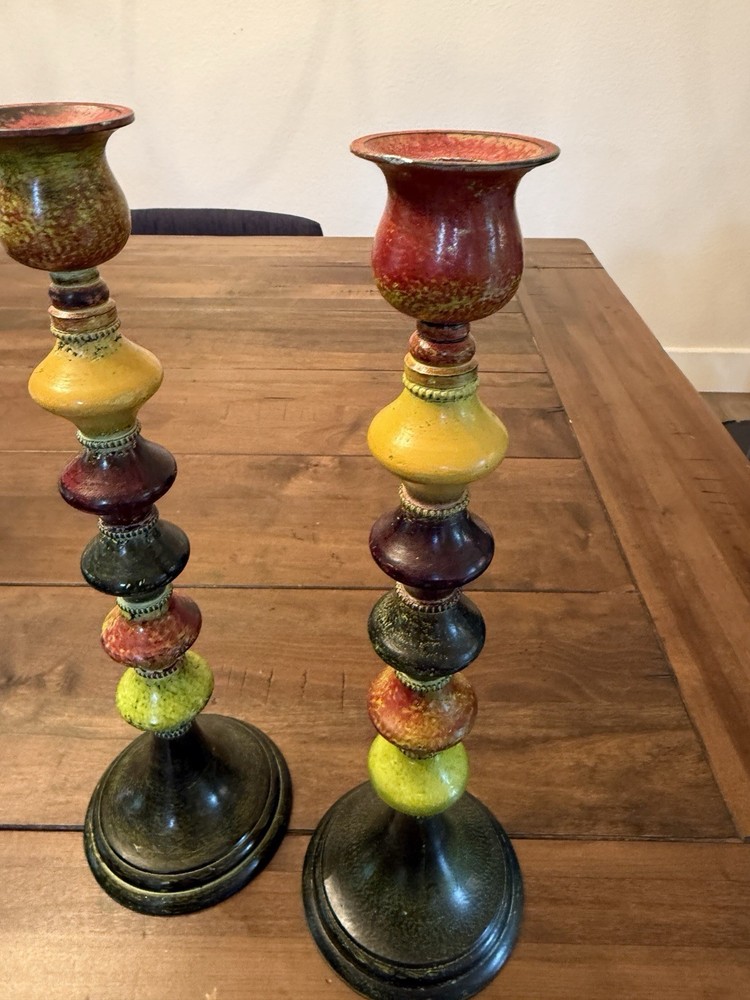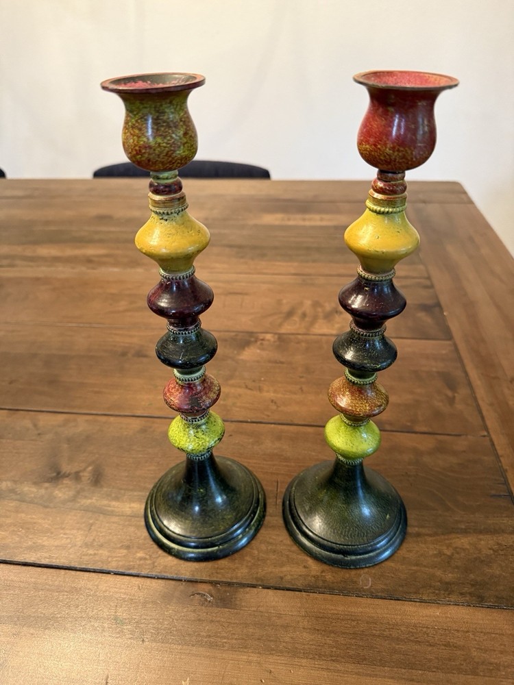 Add a touch of bohemian flair to your home decor with this pair of Pier 1 Imports candle holders. The round, painted metal holders are suitable for taper candlesticks and feature a vibrant, multicolor design inspired by Moroccan style. These vintage candle holders were manufactured in 1990 and are in excellent condition, ready to indoor use in any room. The candle holders stand at 9.5 inches tall and weigh 2 pounds each. The pair comes in an original package and is perfect for adults, teens, and tweens. These candle holders are a great addition to any collection and make a unique gift for any occasion.