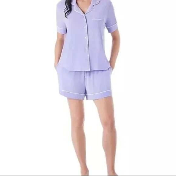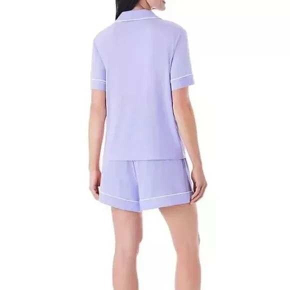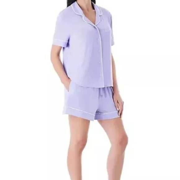 A charming pajama set perfect for comfortable nights and relaxed mornings. This set includes a short-sleeved, button-up top and matching shorts, both featuring a clean, piped trim. The top has a notched collar and a chest pocket, while the shorts have an elastic drawstring waist for an adjustable fit. Ideal for cozy evenings at home or weekend getaways. Type: Pajama Set Department: Women Color: Purple Pattern: Solid Material: Cotton Blend, Spandex, Modal, Lyocell, Cotton Character: Lavender, Dreamy, Cozy, Lilac, Cloud Fabric Type: Jersey Sleeve Length: Short Sleeve Character Family: Cozy Family, Dream Team, Relaxation Crew, Sleepy Bunch, Comfort Club Keywords: pajama set, sleepwear, loungewear, women's pajamas, short sleeve pajamas, button up pajama top, pajama shorts, nightwear, comfortable sleepwear, pajama set women, sleep set, matching pajama set, pajamas with shorts, cute pajamas