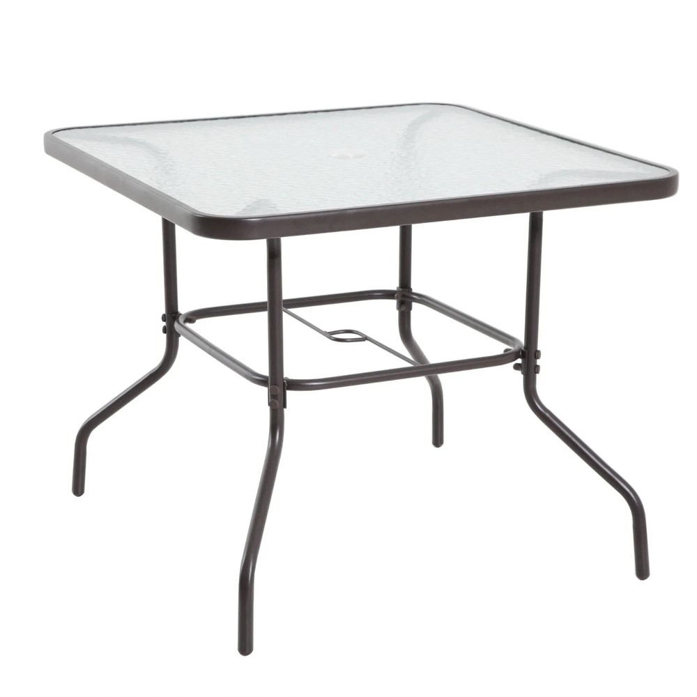 Patio Furniture Set with Umbrella Outdoor Table and Chairs Backyard Garden About this item Mainstays Albany Lane 6-Piece Outdoor Patio Dining Set, Red Casual, outdoor patio set ideal for entertaining, dining, and relaxing Includes 4 foldable, portable, easy-to-store armchairs, a square table with a water-wave, tempered glass top, and a stylish market umbrella Chairs and umbrella feature quick-drying sling fabric; black frames constructed of powder-coated, rust-and-corrosion-resistant steel Stylish, classic look complements most other outdoor furniture and decor Quaint, fun little addition to any porch, patio, or deck Instructions included for easy assembly Materials: Steel, tempered glass, PVC sling, polyester Weight capacity: 250 lbs (each chair) Assembled dimensions: 24.8"L x 22.44"W x 35.83"H (each chair), 33.8"L x 33.8"W x 27.5"H (table), 59.06"L x 59.06"W x 86.61"H (umbrella) Weight: 8.91 lbs (each chair), 28.22 lbs (table), 6.31 lbs (umbrella) Total weight: 70.17 lbs Care: Clean with mild solution of soap/detergent, rinse thoroughly, allow to air dry; do not use bleach or strong solvents as this will cause damage to both fabric and metal finishes