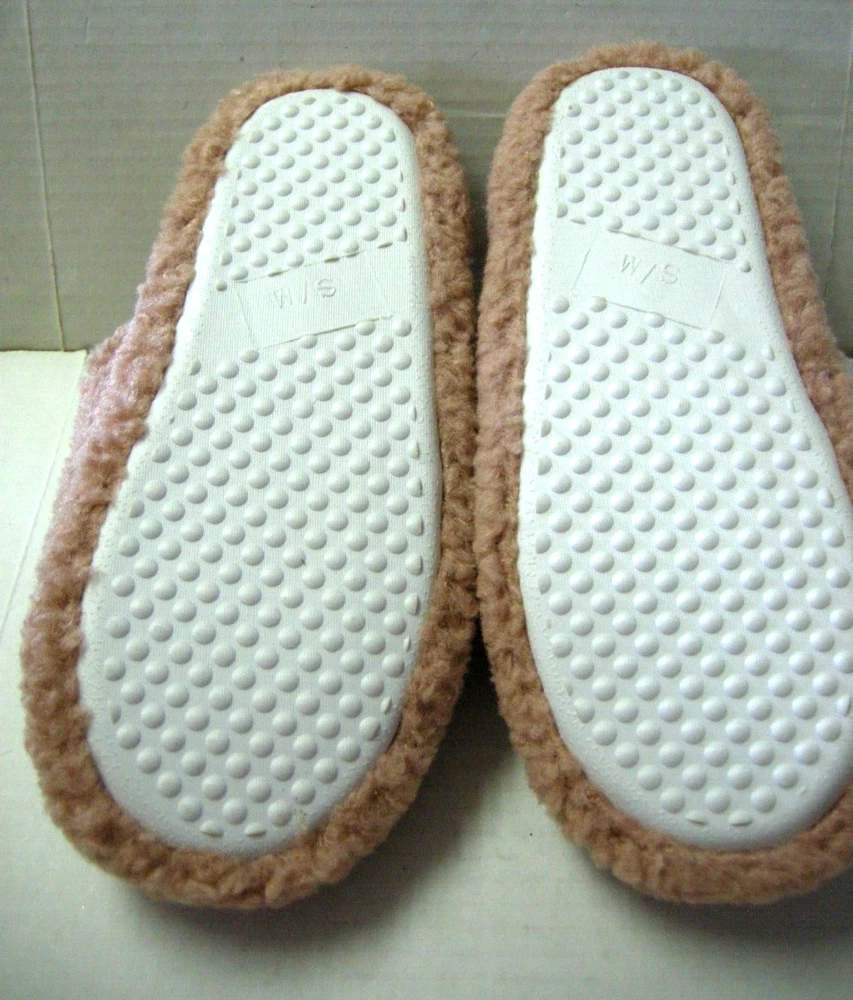 Slippers -- * Brand new with tag. * Manufactured by Paws. * Plush. * Dusty Rose * Rubber sole. * Size -- Small/Medium. From toe to heel 9.5" and width 3.5" at toes and 2.5" at heel. * Pink glitter elastic back strap. Check our store -- Giftbarntexas -- for more slippers. Sign up for my email newsletters by adding my eBay Store to your Favorites. BX23miscel
