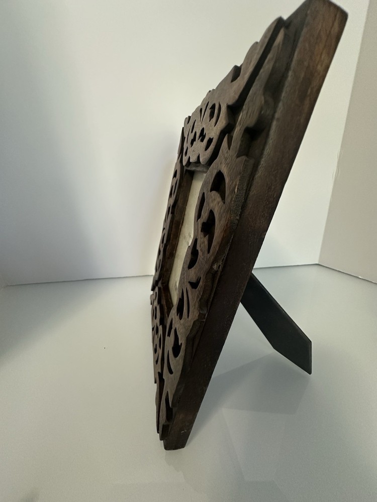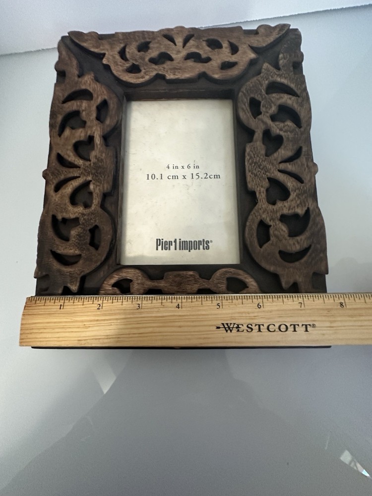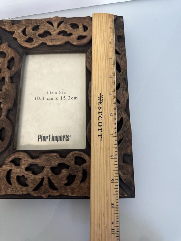 Peir 1 Imports 4 x 6 frame. Crafted from quality wood, this photo frame showcases a raised, ornate scroll design that adds a touch of elegance to any room. The frame's brand, Peir 1, is known for its distinctive designs that blend traditional craftsmanship with contemporary style. No damage (722ccs2-3)