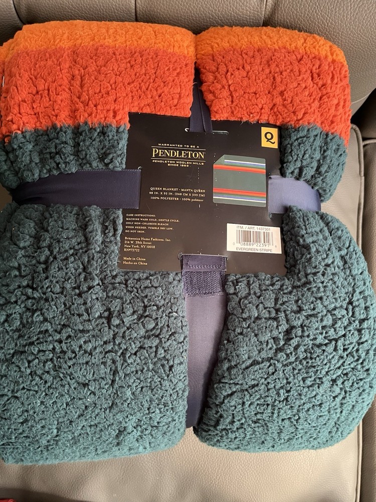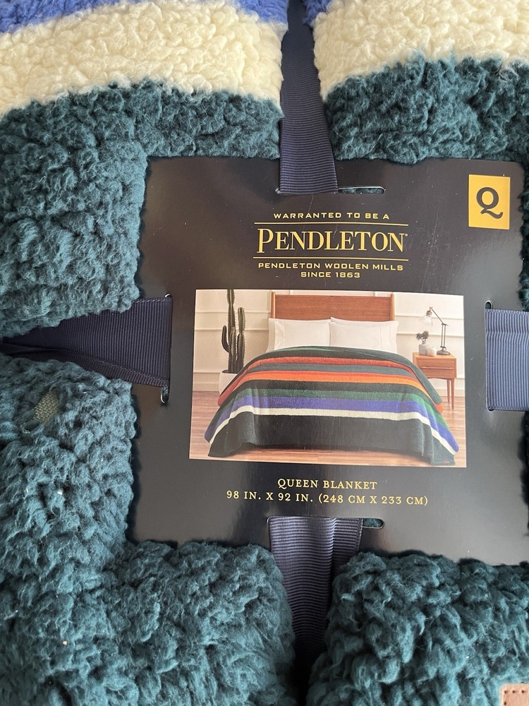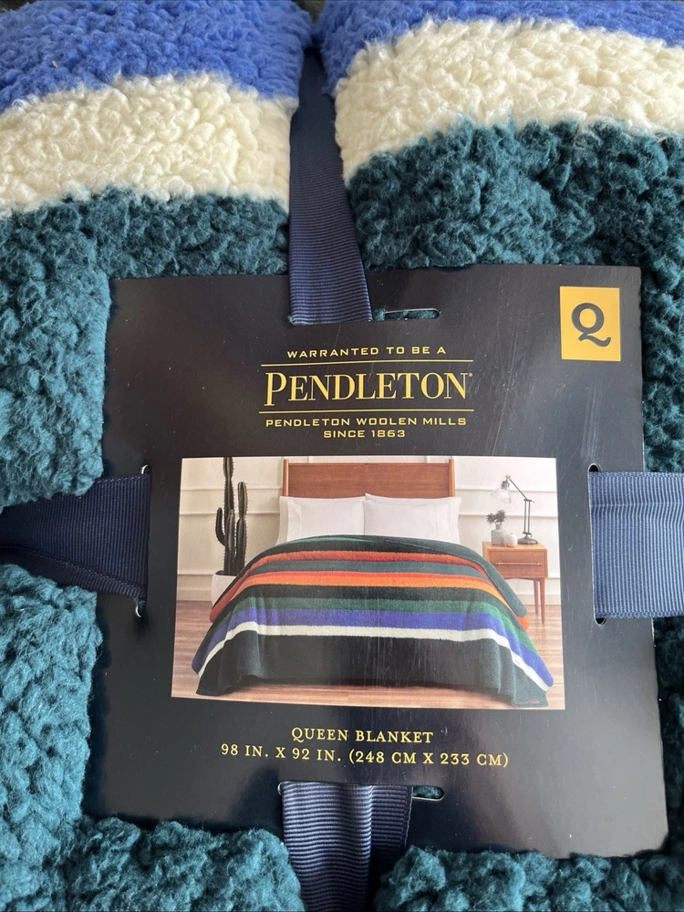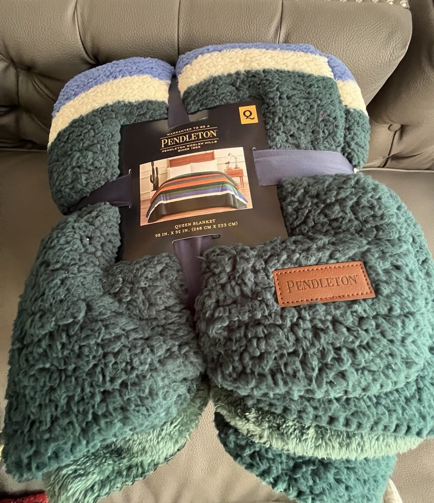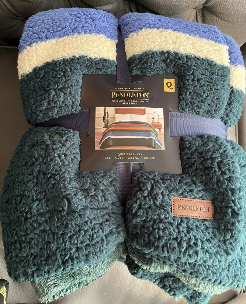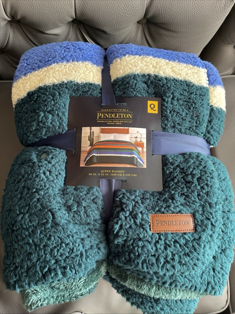 Wrap yourself in the comfort of the Pendleton Sherpa Fleece Reversible Blanket, a versatile addition to your bedding collection. Featuring a striking evergreen stripe pattern, this queen-sized blanket offers a Southwestern style that effortlessly complements any bedroom decor. Crafted from ultra-soft polyester and sherpa fleece materials, it provides warmth and coziness for adults, teens, and kids alike. Designed for convenience, this machine-washable blanket is easy to care for, ensuring it remains fresh and vibrant wash after wash. Measuring 92 inches in length and 98 inches in width, it is perfectly sized for a queen bed and can also be used as a cozy layer for snuggling on the couch. Enjoy the blend of functionality and style with this Pendleton blanket, a perfect fit for your cowboys and western-themed room.