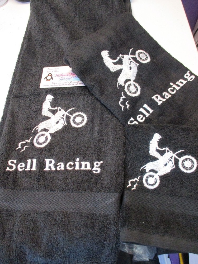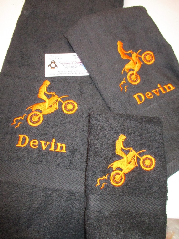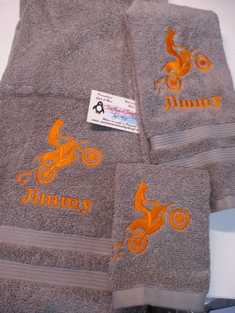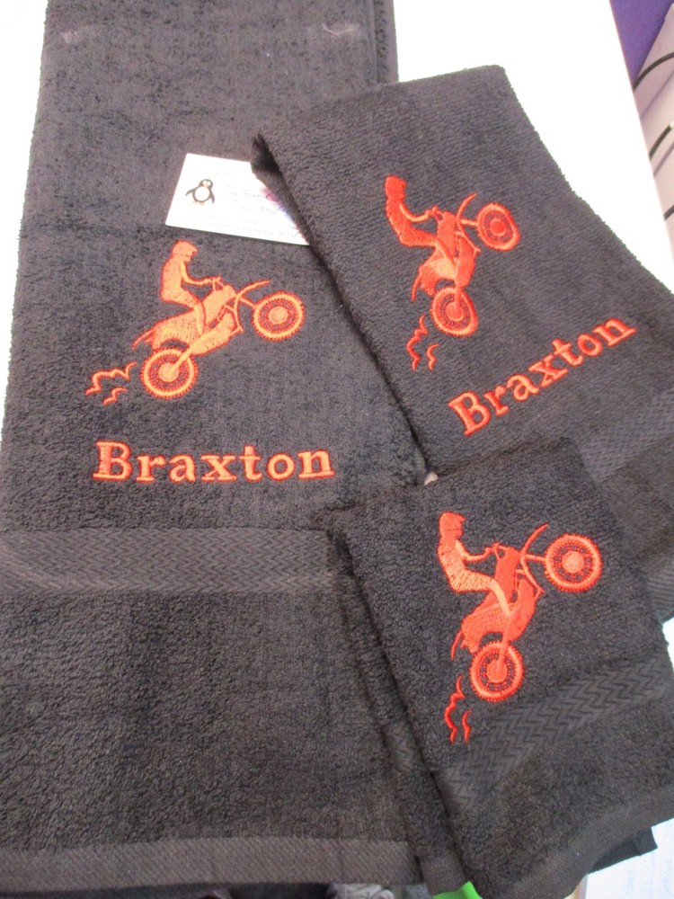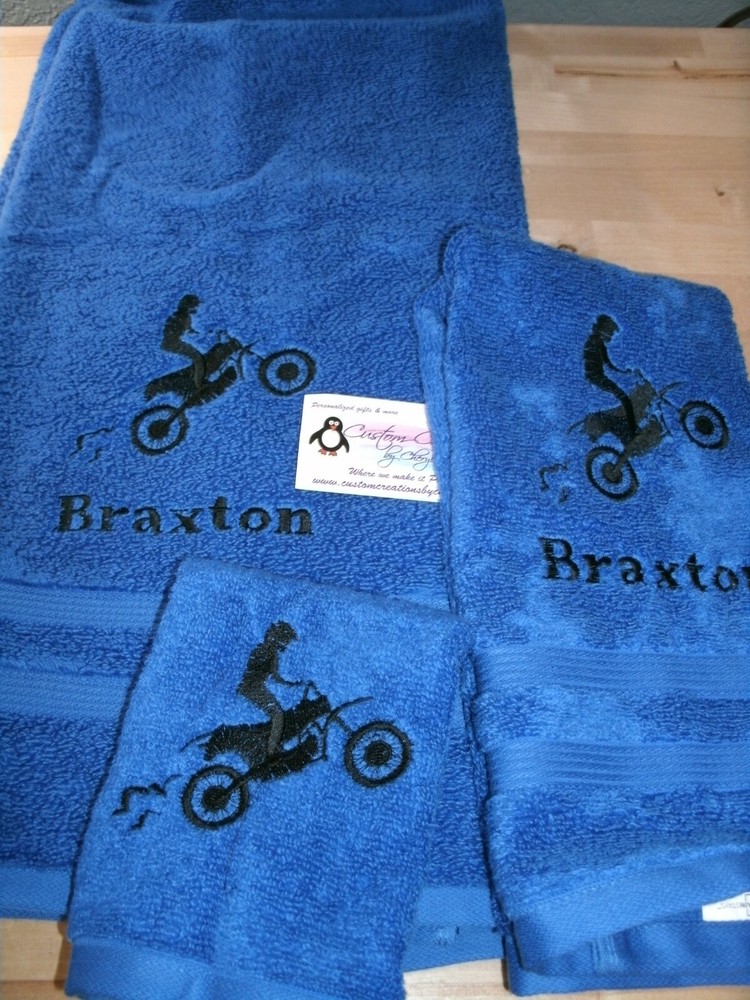 Up for sale on this auction is a really nice PERSONALIZED 3 piece towel set: bath (50 x 26) hand (25 x 16) towel and washcloth combo set. This set is red set but I can do any towel, washcloth and or hand towel color that you would like just leave the info in the comment box when you checkout. I have green, purple, yellow, tan, turquoise, chocolate, hot pink, black, gray, white, navy blue, burgundy, red, & royal blue. This design is a dirt bike silhouette and the name of YOUR choice. I do have other designs as well. THE WASHCLOTH IS JUST THE DESIGN ONLY !!! I do have many thread colors to choose from. All of my items are custom made and do come from a smoke free home. I will be more then happy to combine shipping charges. If you do not see a design that you are interested in please ask as I am sure I will have it. Designs range from sports, mascots, kids themes, weddings, teens, and many more.... PLEASE INCLUDE THE NAME IN THE MESSAGE COMMENT BOX WHEN YOU CHECK OUT. IF NO NAME IS GIVEN THEN I WILL SEND WITH JUST THE DESIGN ONLY !!! THANKS FOR LOOKING!!!