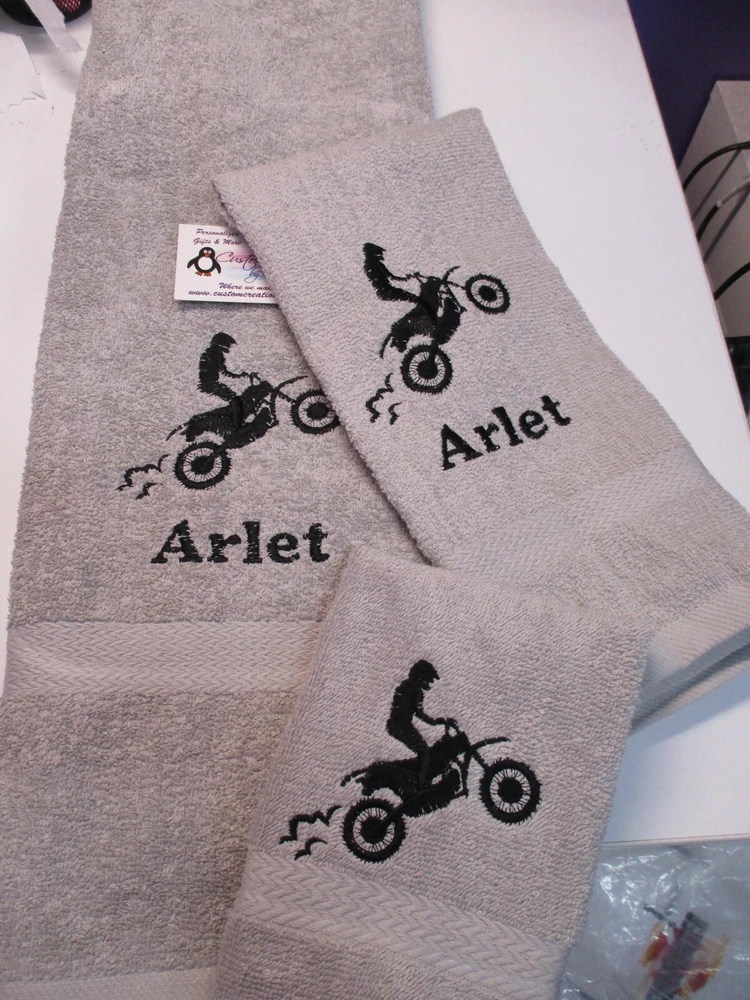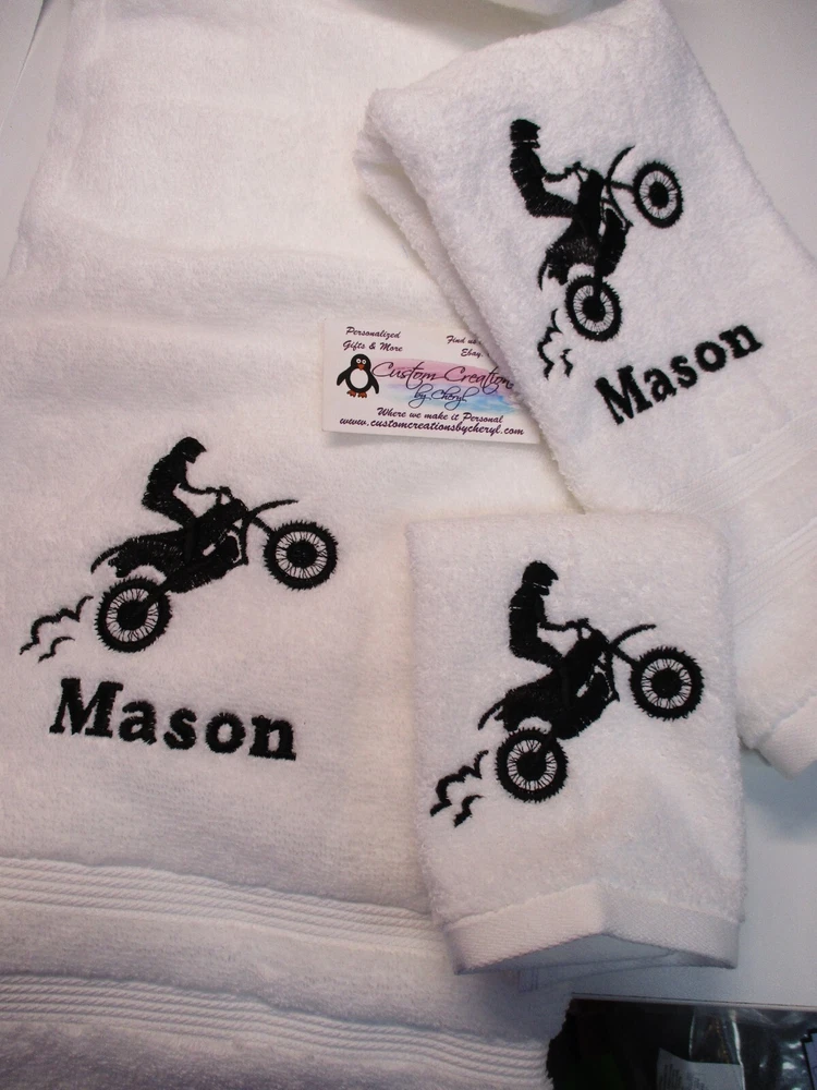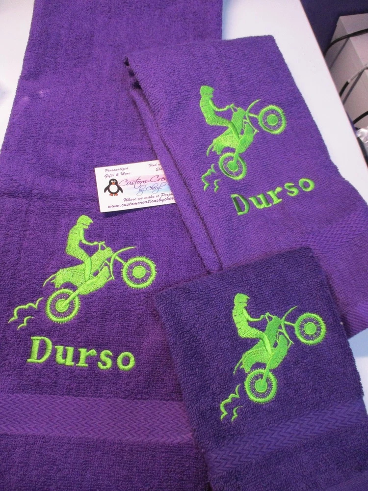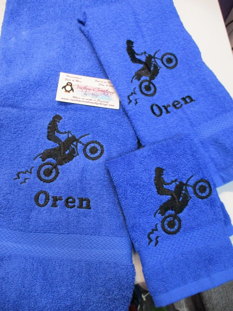 Absolutely love this custom motocross towel set! The quality is fantastic, and the personalization makes it extra special. The dirt bike design is sharp, and having my name on it is a cool touch. Super soft, absorbs well, and the color options are awesome—went with royal blue and it looks amazing. Perfect gift for any motocross fan!