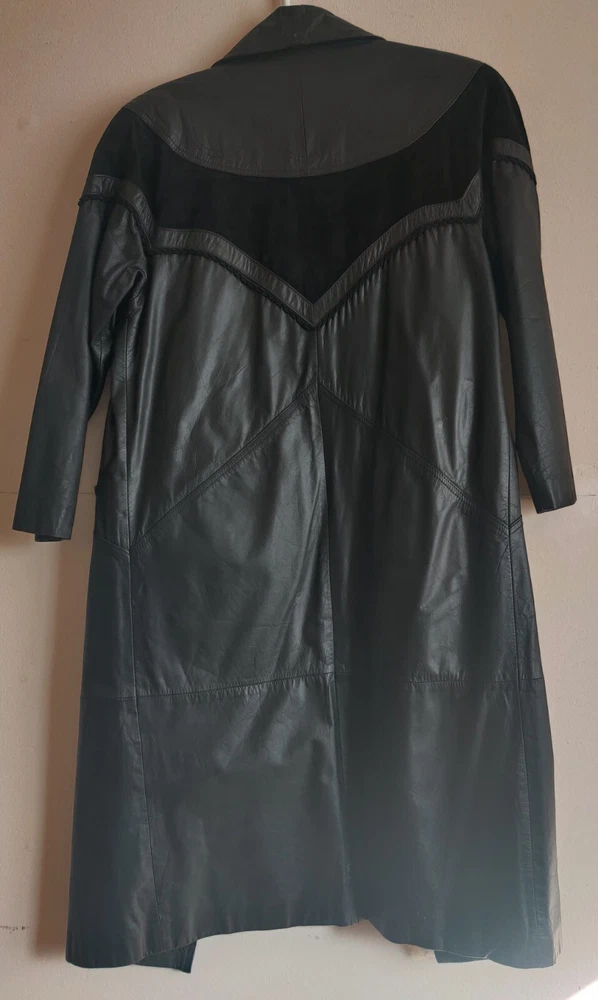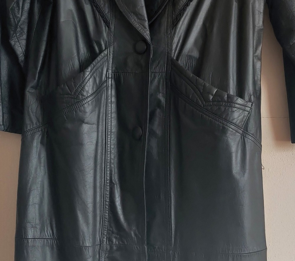 MEASUREMENTS: Shoulder to Shoulder: 19.5" Sleeve is designed to reach the elbow: 21" Length: 46" Waist: 21.5" This vintage Petite Sophisticate long trench coat is a classic addition to any wardrobe. Made in Korea, the black leather coat features a solid pattern with two button closures. It is perfect for casual, workwear, or business occasions & is a great choice for those who love the 90s retro style. The coat is lightweight, water-resistant, & wind-resistant, making it suitable for all seasons. It has a collared neckline, lined interior, & multiple big pockets for storage. The coat is dry clean only & comes in a petite size. Get your hands on this designer piece today at this great price!