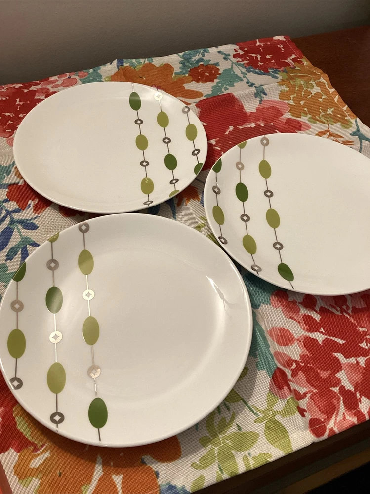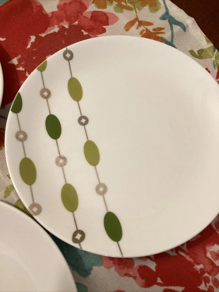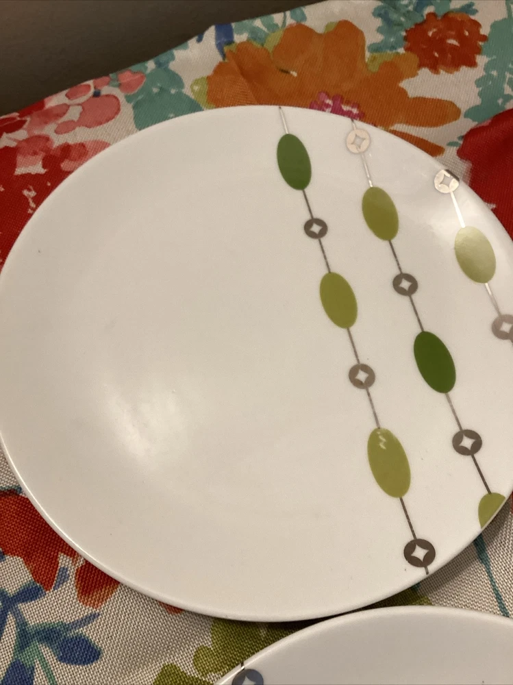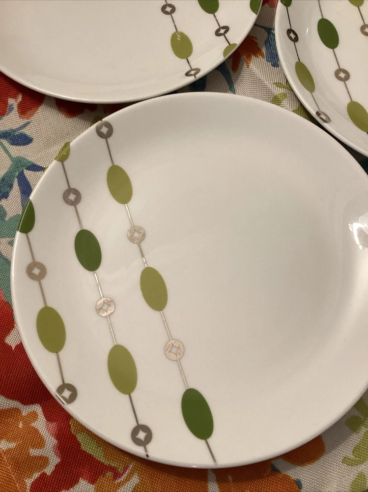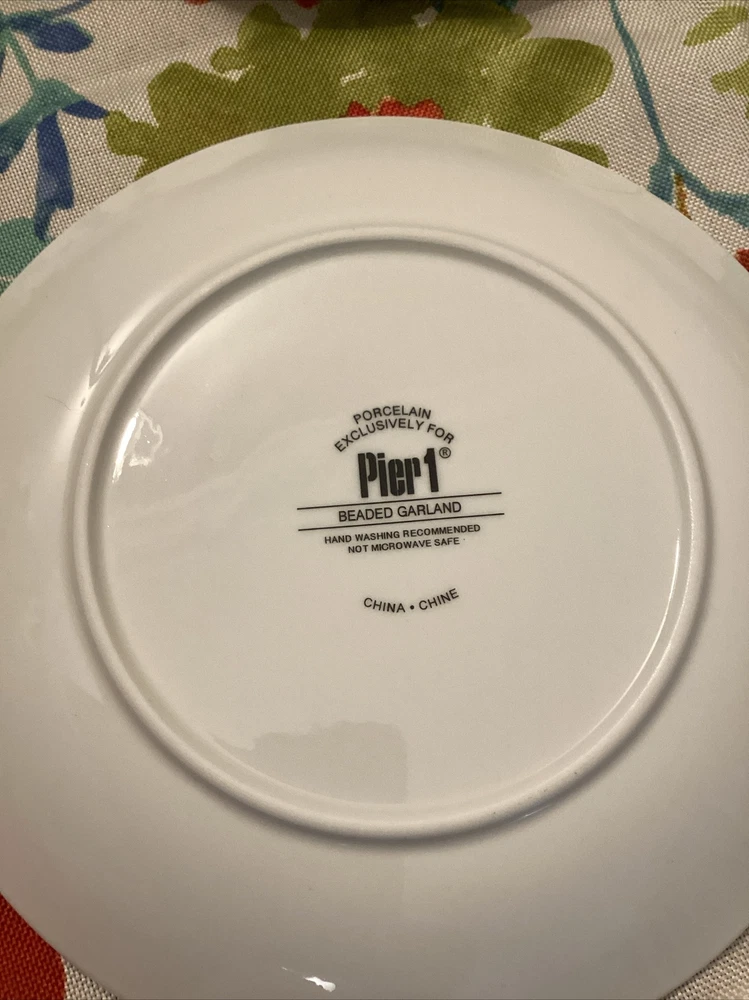 Add a touch of vintage charm to your dining table with this set of four Pier 1 salad plates. Each plate features a colorful beaded garland pattern, adding an eclectic flair to your table setting. The plates are made of porcelain and measure 7 1/2" in diameter. These plates are perfect for special occasions or everyday use. Hand wash them for best results and avoid using them in the microwave. They come from Pier 1's product line and have a printed backstamp. Bring a touch of China to your home with these unique and stylish salad plates. Sold as is