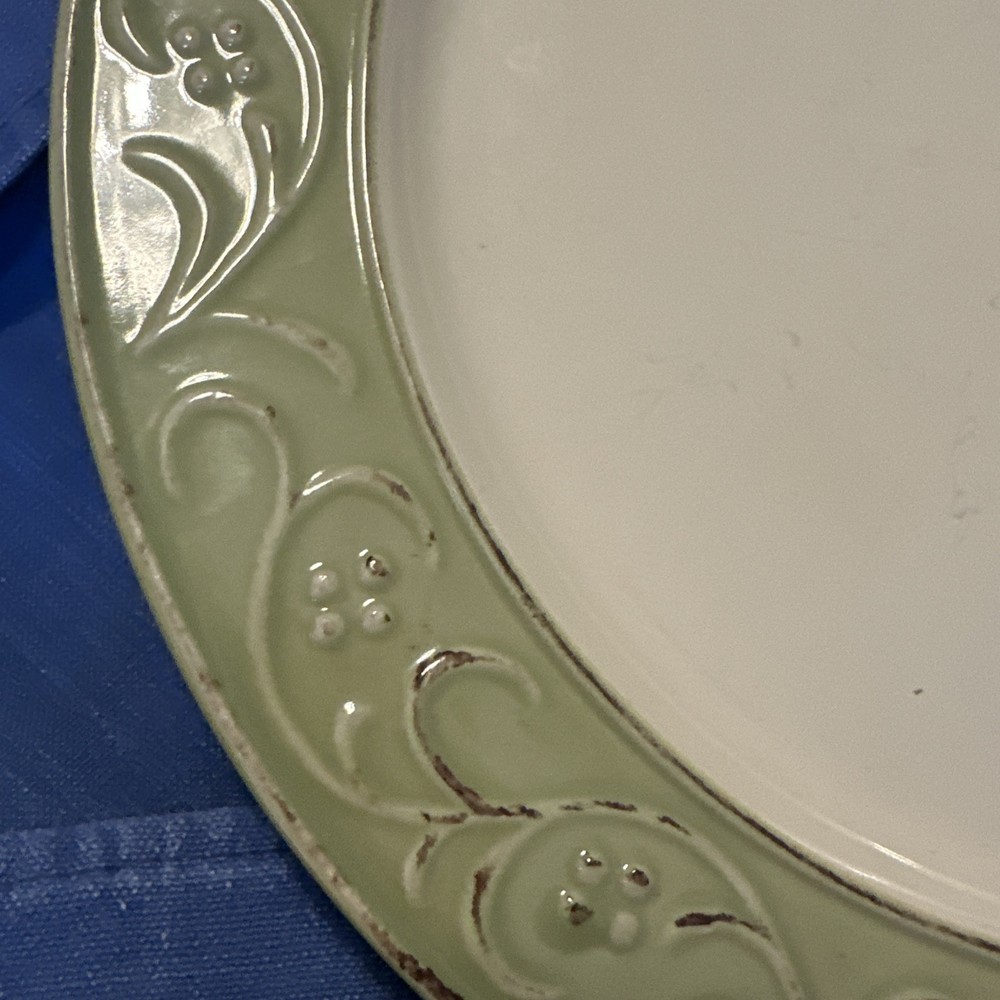 Pier 1 ANTIQUE FLORAL 10 7/8" Dinner Plate Green Embossed Floral Scrolls Band. Condition is Used. Shipped with USPS Ground Advantage....