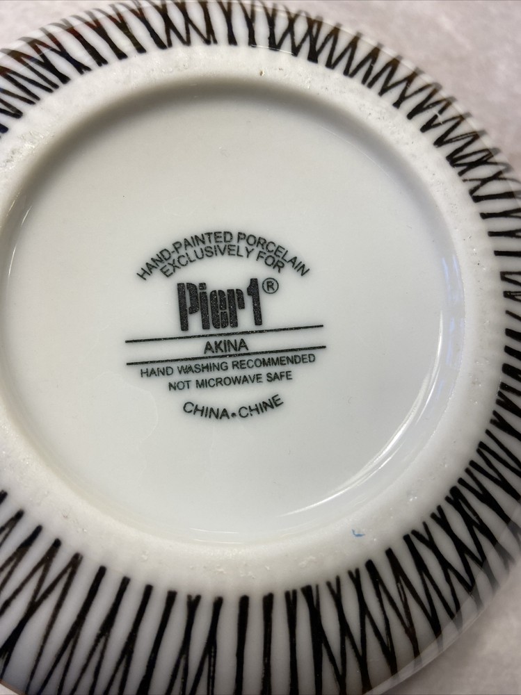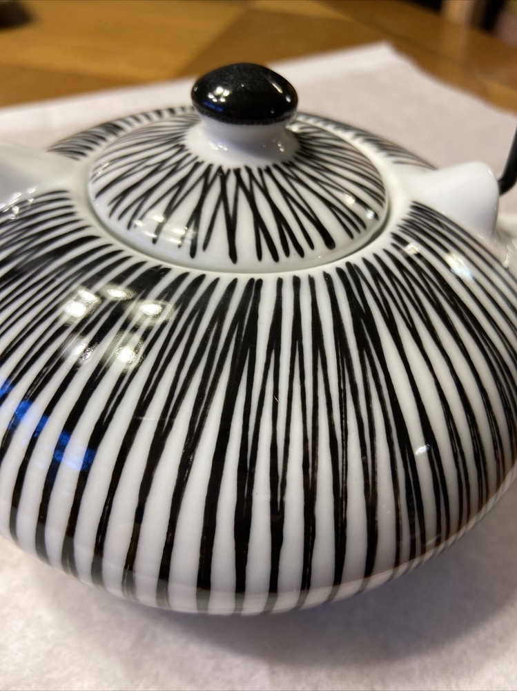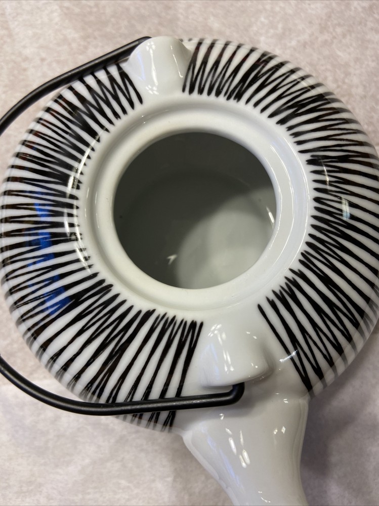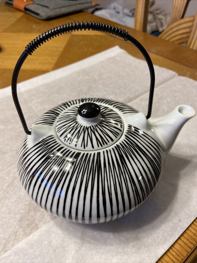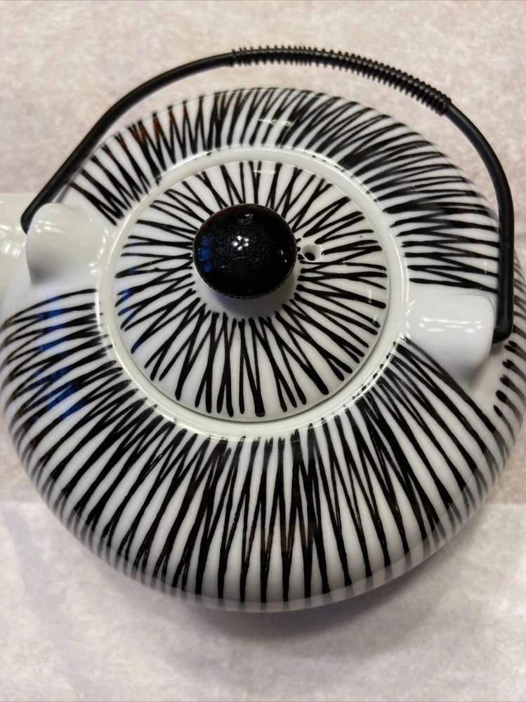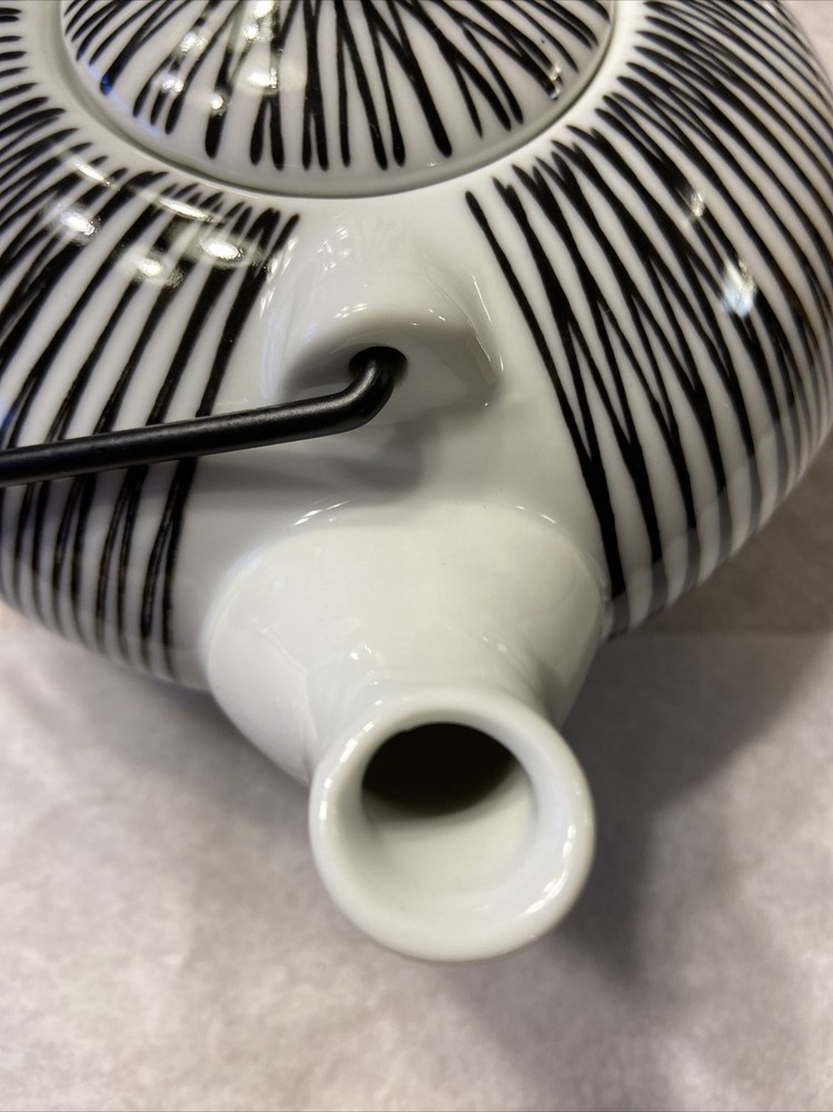 Pier 1 Akina Teapot - Black & White Design. Shipped with USPS Priority Mail. Condition Description Very nice, no chips or cracks. Sleek looking glossy finish. Very modern - nice metal handle with wire wrapped around the middle part!! It measures 4” without the lid tall and 7” wide