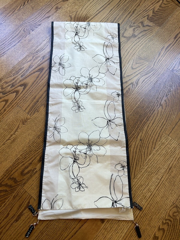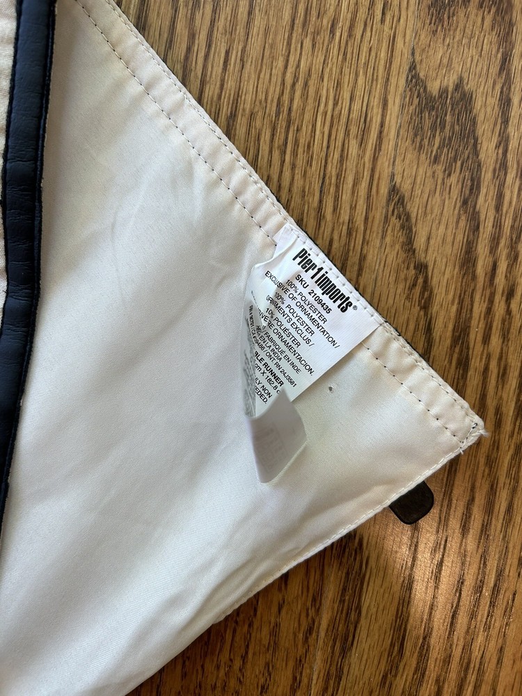 Add a touch of class to your dining table with this stunning Pier 1 Amhearst table runner. The beautifully embroidered floral pattern on a cream and black background is sure to impress your guests. Measuring 14 inches wide and 72 inches long, this rectangular table runner is perfect for all occasions and can complement any table setting. Made of 100% polyester, this table runner is easy to care for with hand washing instructions provided. The classic theme and Pier 1 brand add to the elegance of this piece. Whether you're hosting a dinner party or enjoying a casual meal, this table runner will enhance the look of your dining area. Location: From a smoke free and pet free home. FAST shipping in the USA (International shipping offered through GSP) 100% Money Back Guarantee Any questions feel free to contact me before buying. If there is a problem with your order please contact me before leaving negative feedback so we can work together on a solution. My small business is very important to me and I work hard to maintain my positive feedback. Sheila