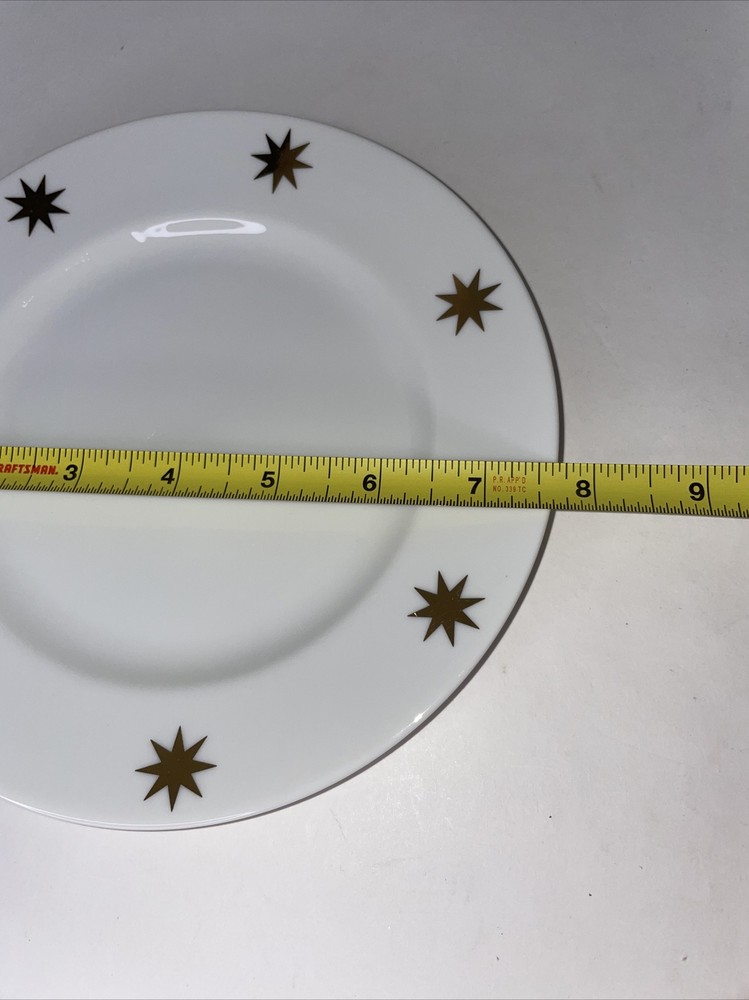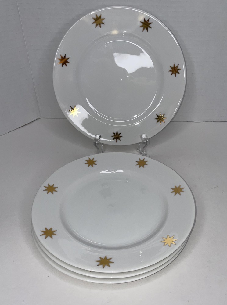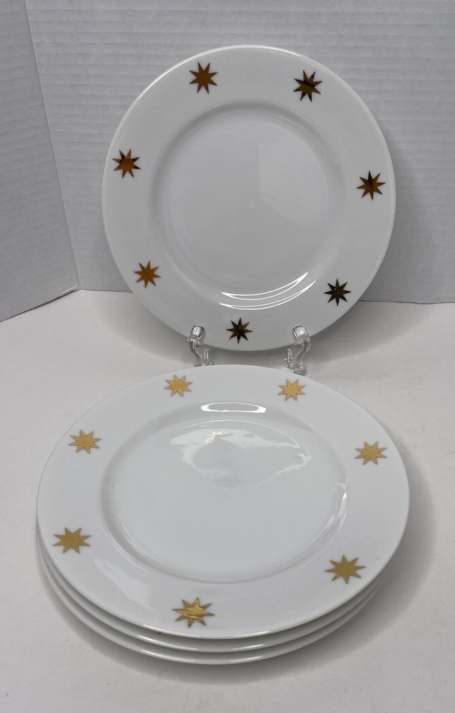 Pier 1 Classic Salad Dessert Bread Appetizer 7.5” Plates White Gold Stars Starburst Set of 4. Christmas Holiday MCM Atomic. No chips or cracks...